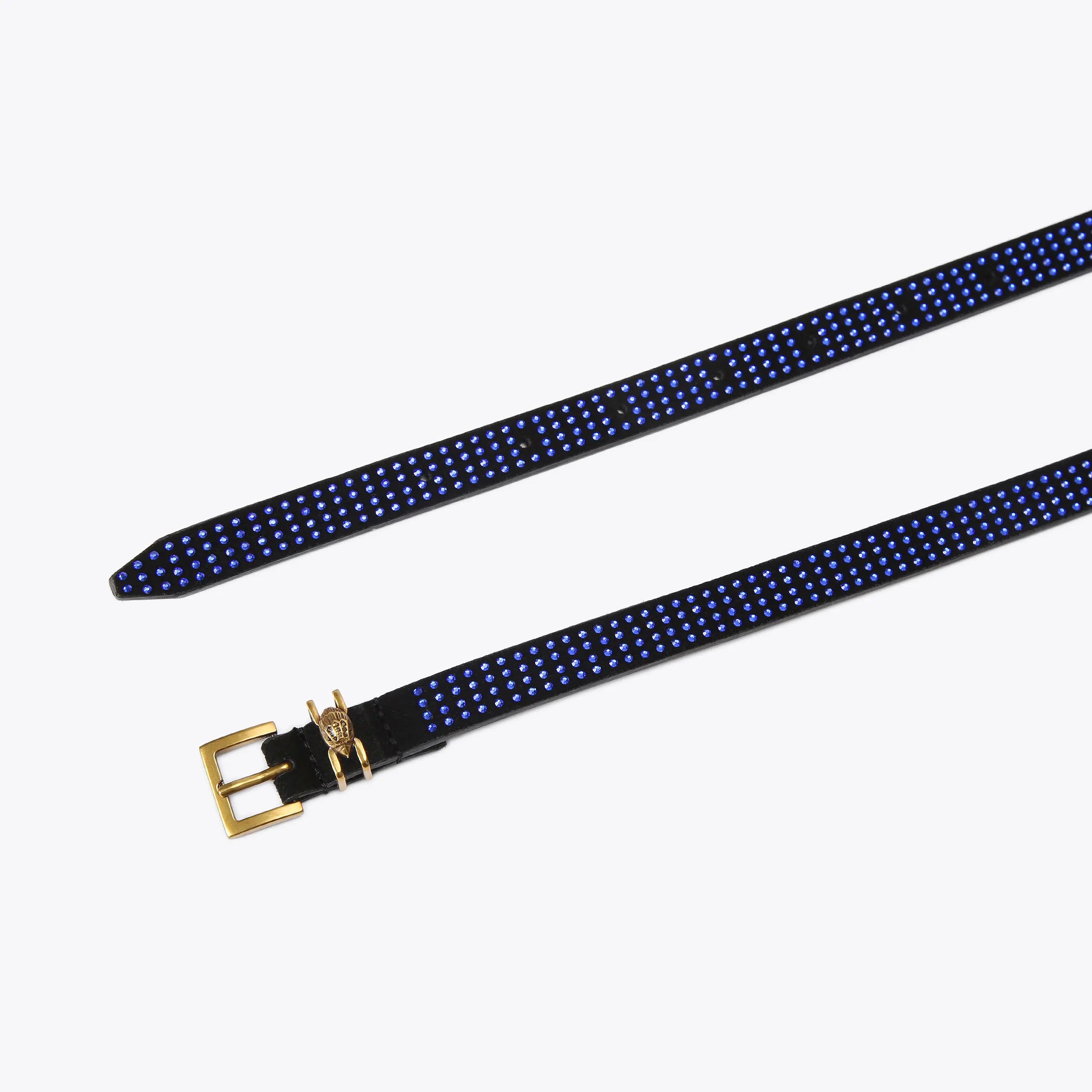 This Shoreditch Belt features a black microsuede belt band that is embellished with blue crystals. The buckle is an antiqued brass matching the small eagle head.