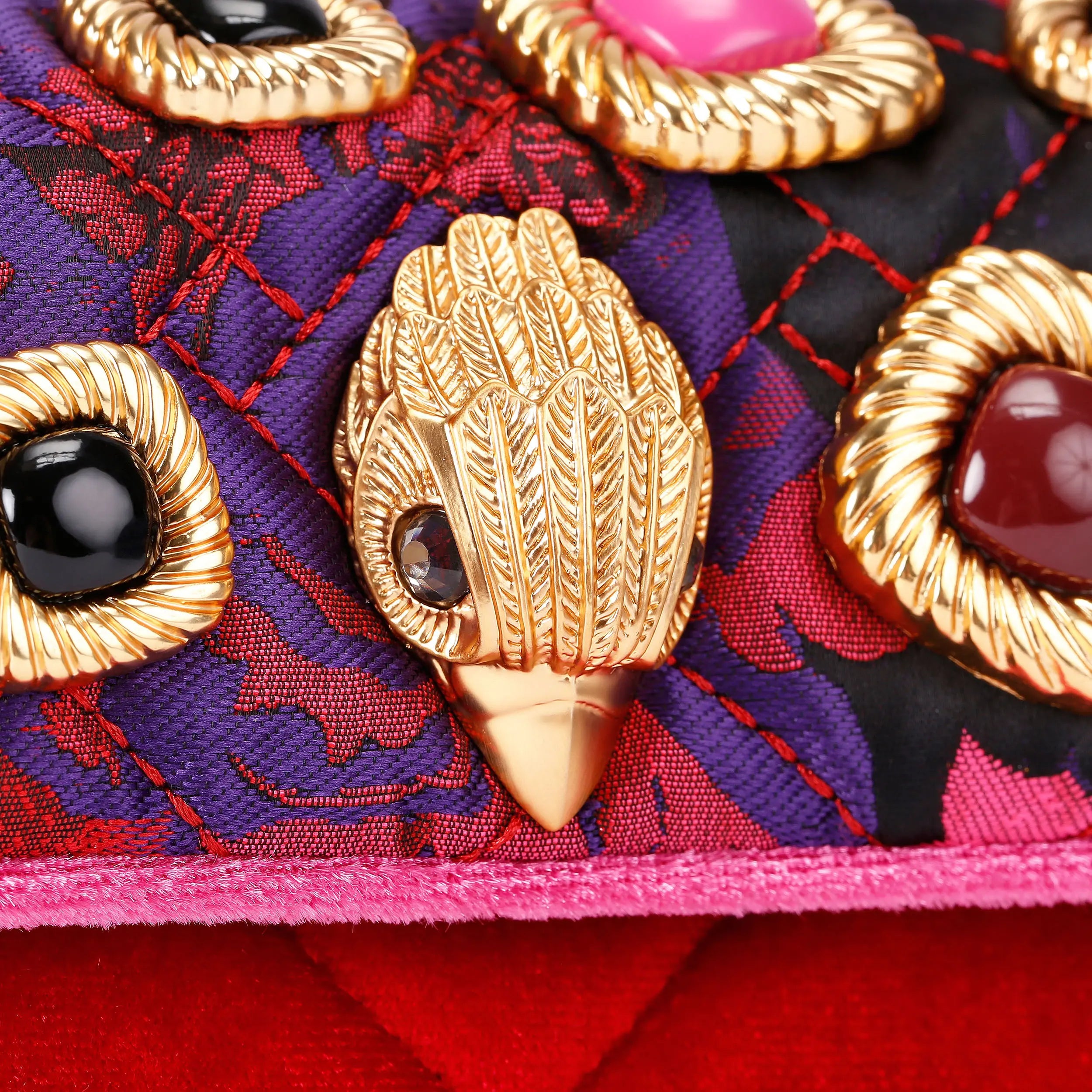 This Mini Kensington Purse features a red velvet base with embroidered flap that is accented with stones surrounded by brushed gold. The brushed gold eagle head features crystals on the front flap.