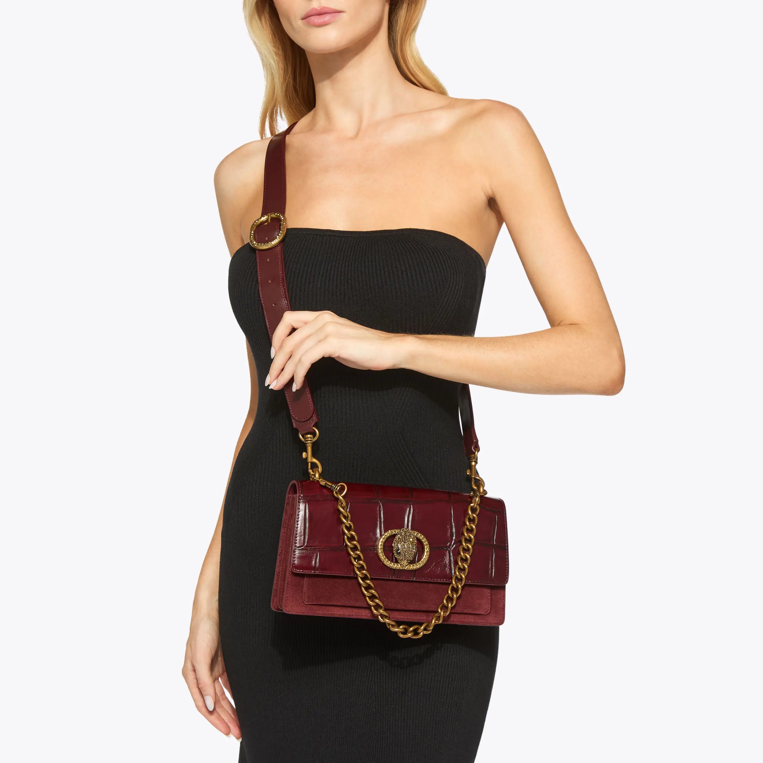 This Chelsea East West Purse is crafted from a wine suede leather. There is a crystal embellished antiqued brass oval trim with eagle head at the centre sat on the front flap. Style with the leather strap or optional brass chain for effortless crossbody-to-shoulder versatility.