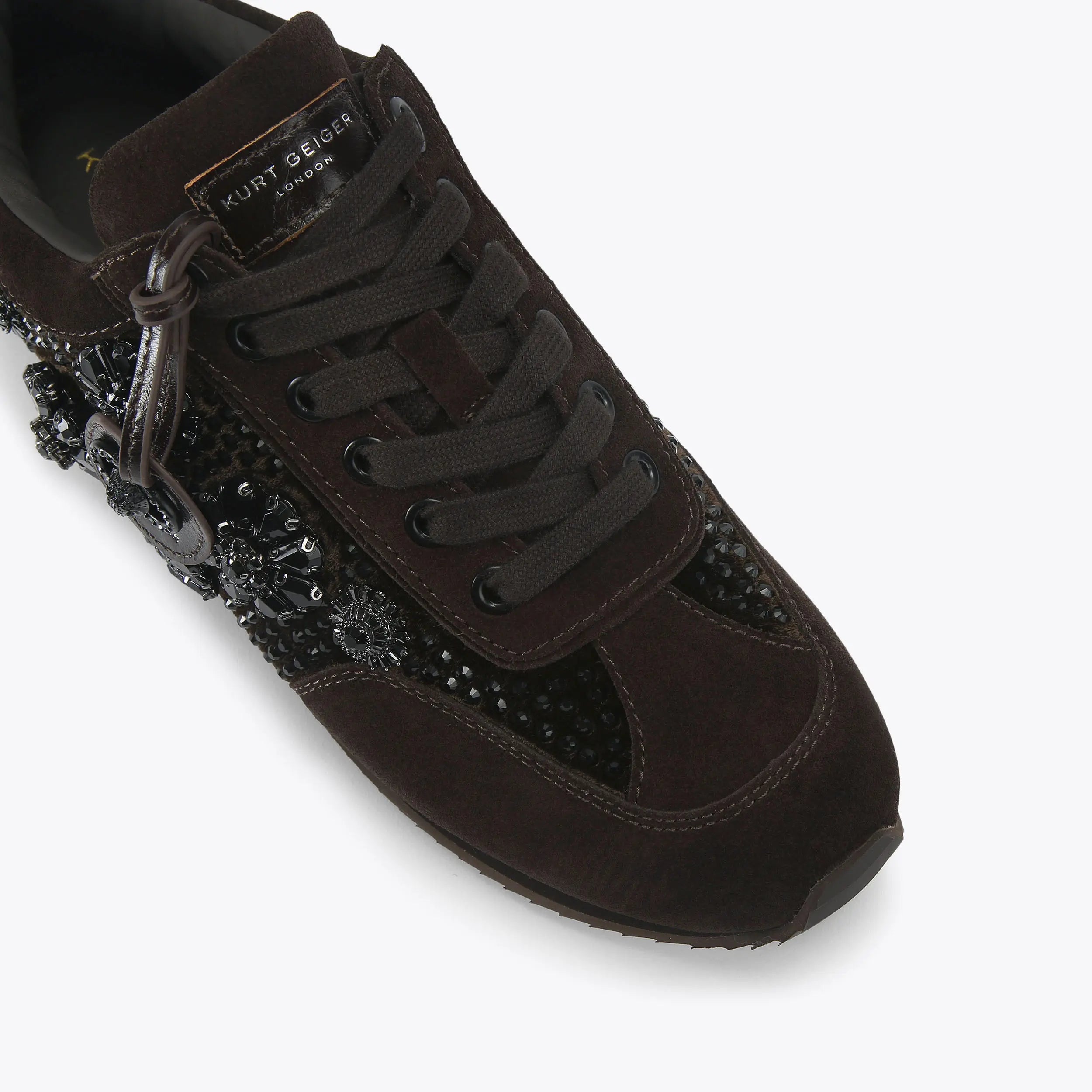 This pair of Chelsea Jewel tag sneakers feature a black velvet fabric upper with dark brown suede panels. There is a small black oval trim with eagle head at the centre sat on the lace tag.