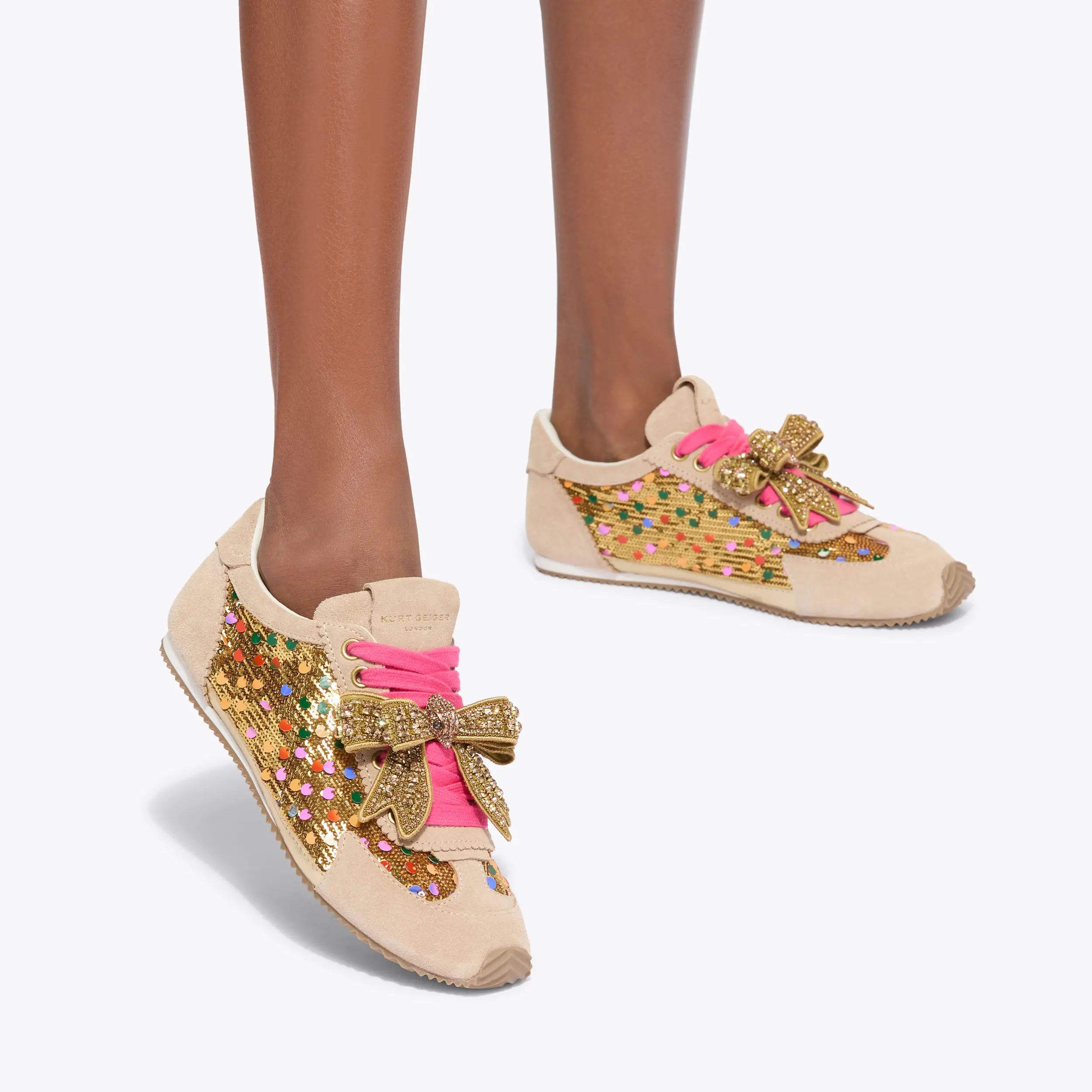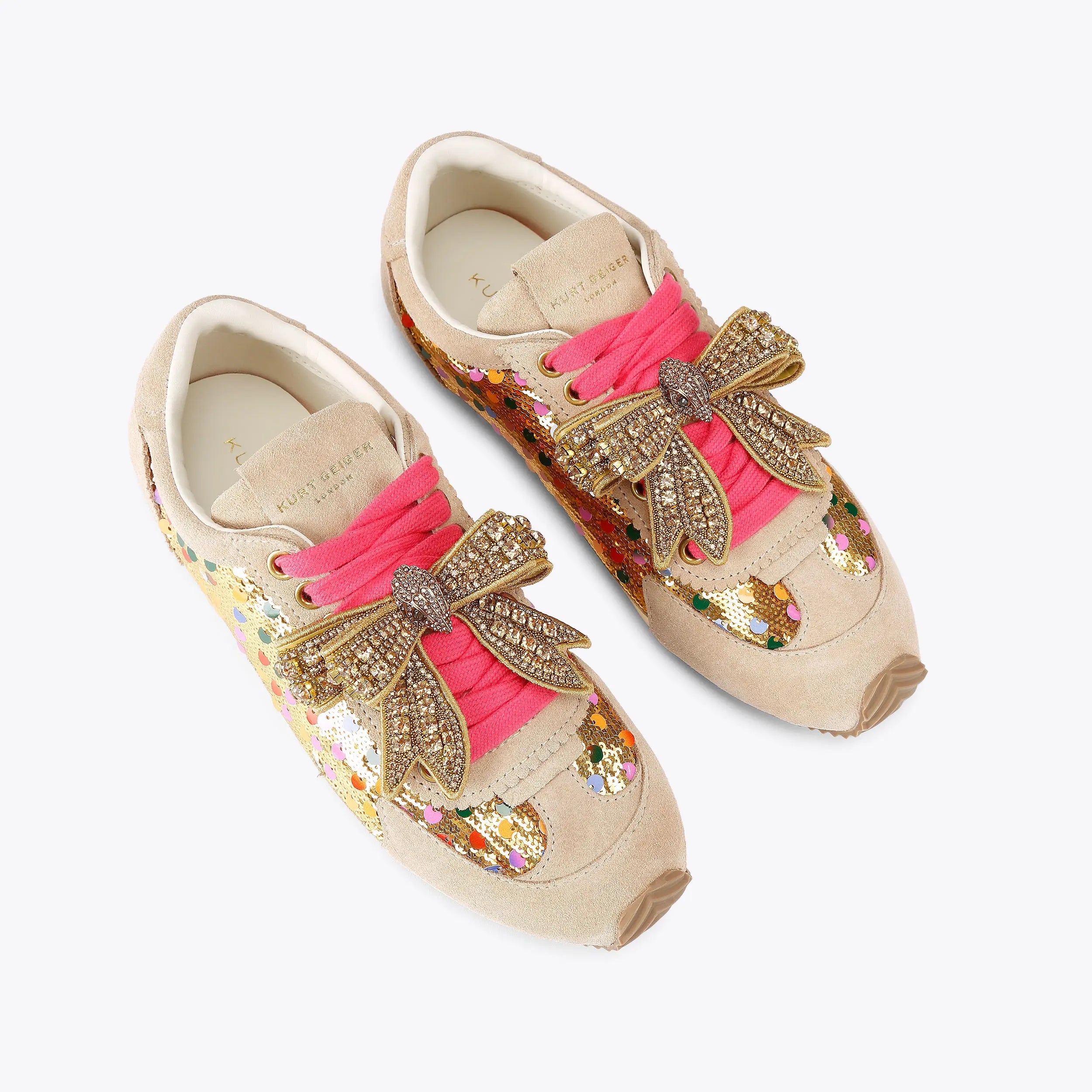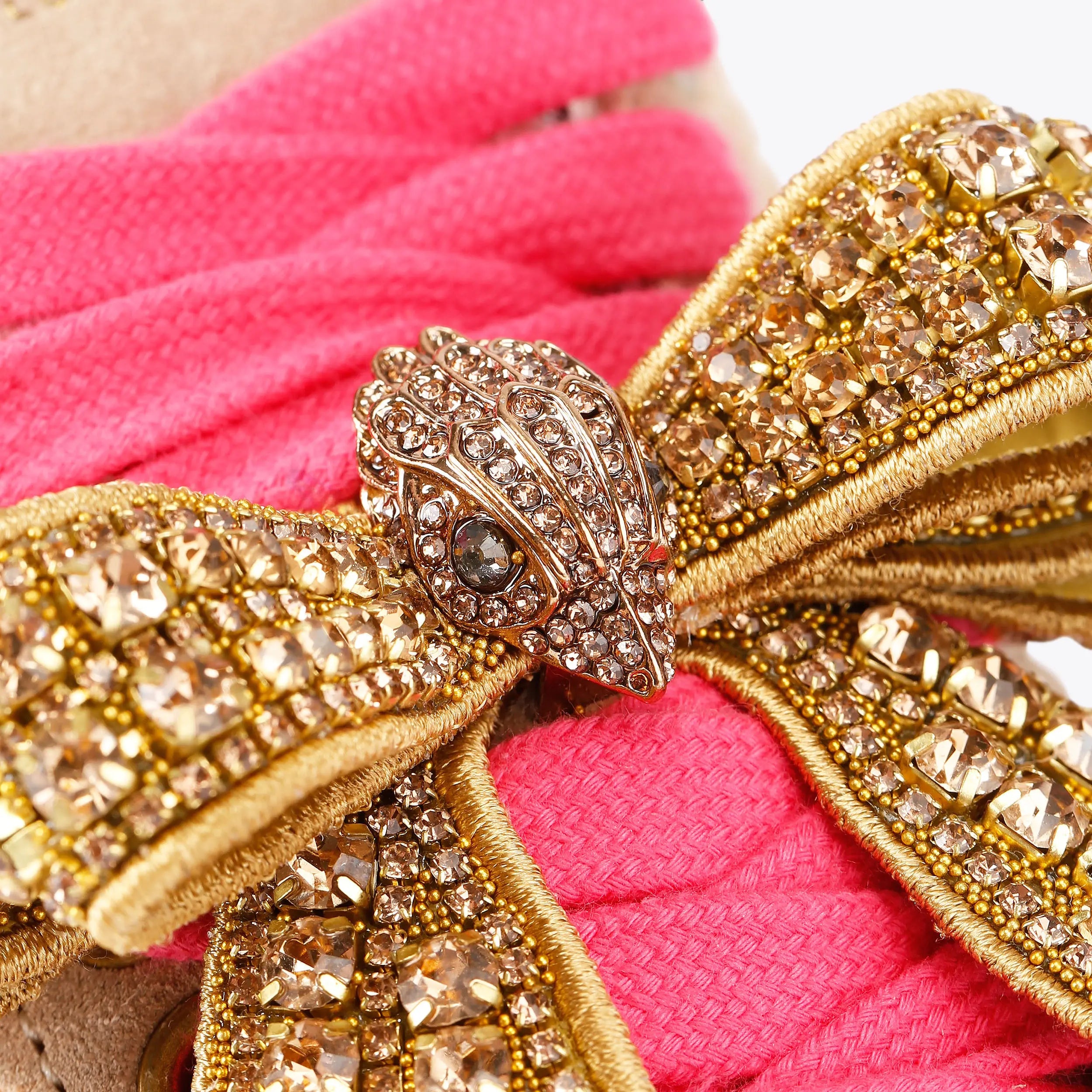 This Islington Bow Sneaker is crafted from a taupe suede leather with two metallic gold sequin panels on the sides. There is a crystal gold eagle head sat in a bow on the bright pink laces.