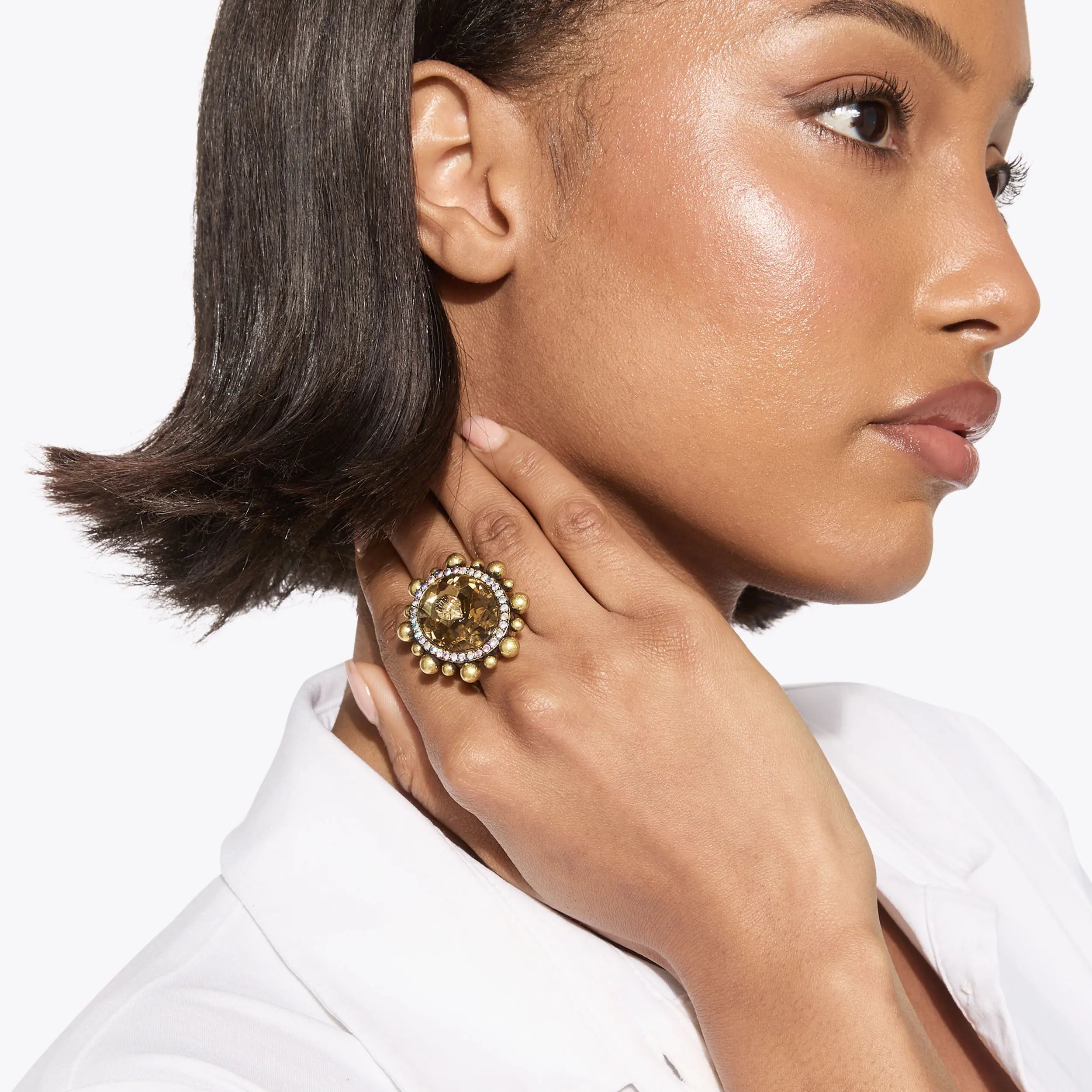 The Extra Large Regent Ring features an antiqued brass band. There is a large orange crystal sat on the top which is surrounded by silver crystals and antiqued brass studs. There is a gold micro eagle head sat on top of the crystal.