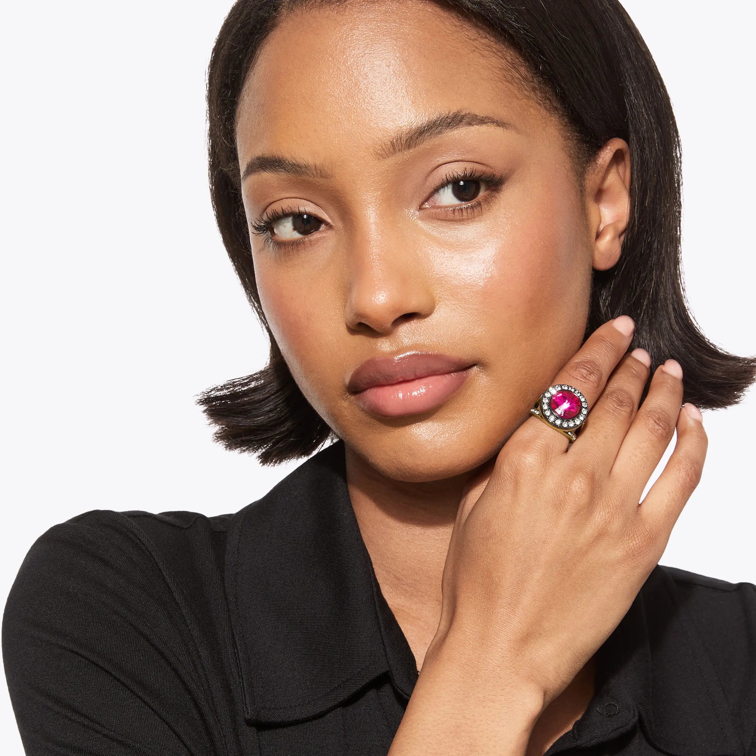 The Small Octavia Ring features two brass bands embellished with crystals. There is a large pink crystal surrounded by smaller ones on top of the hands.