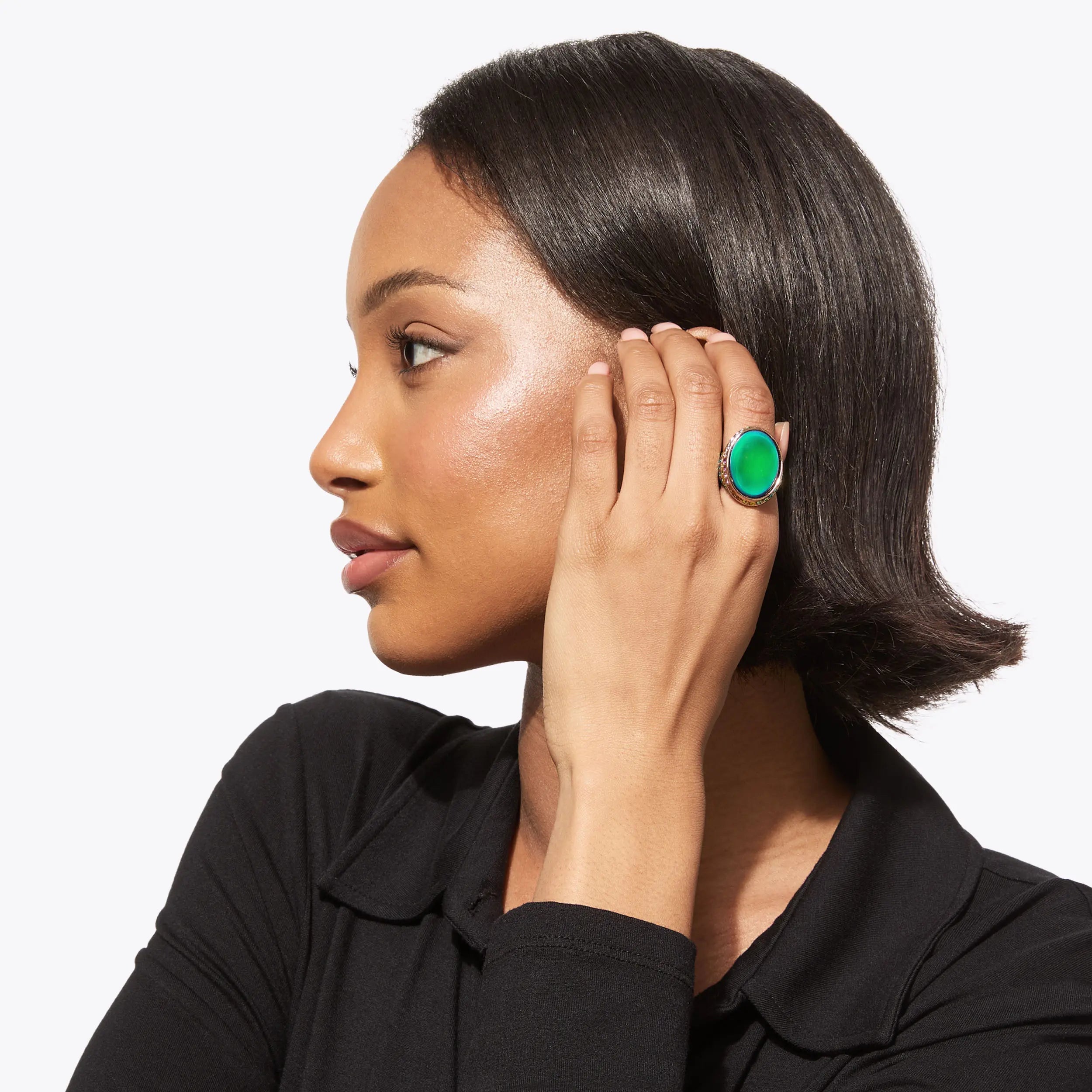 The Oval Mood Ring features two a chunky gold band that is embellished with multi-colour crystals. There is a large green crystal encased on the top.