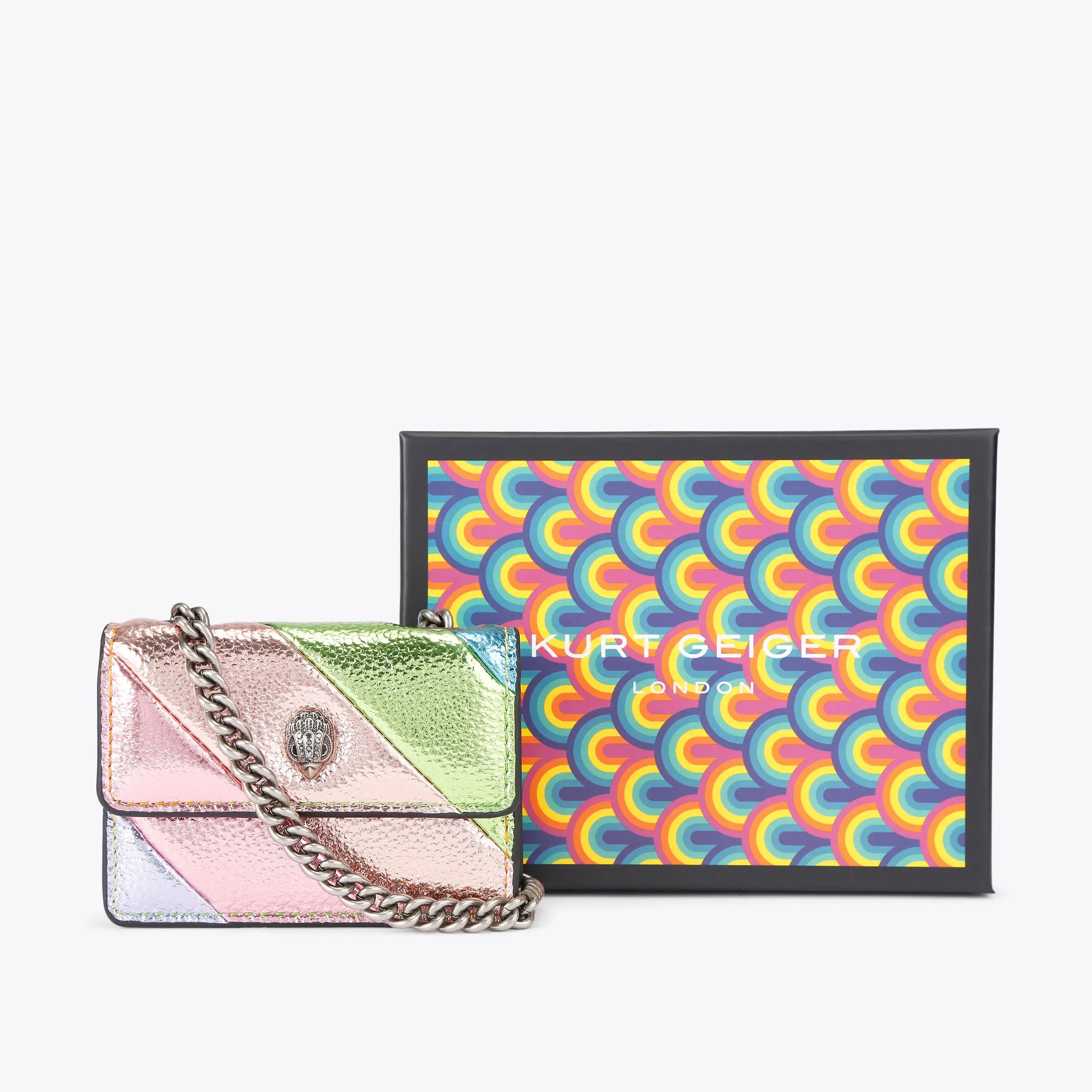 The Micro Kensington Purse features a pebble grain pastel striped exterior. The antiqued silver eagle head features crystals and eyes on the front flap.