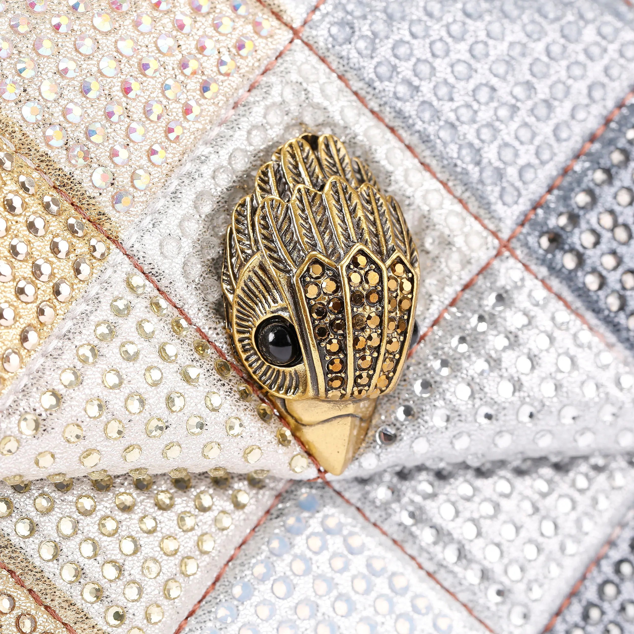 The Medium Sequin Kensington Bag is crafted in a muted earth tonal diamond design embellished with crystals. There is an antiqued brass eagle head sat on the front flap.