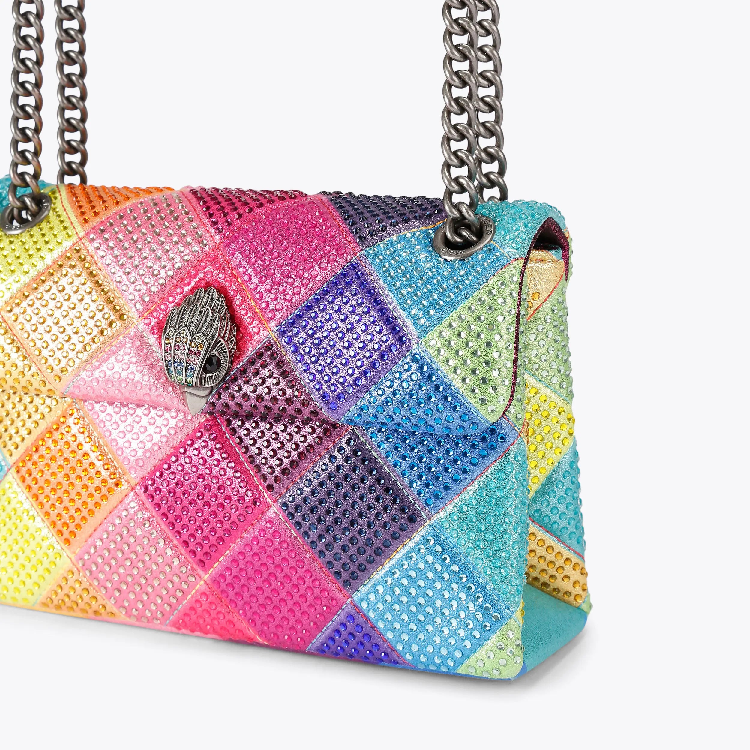 This medium Kensington Bag is crafted from a multi-colour diamond design with crystal embellishment. The antiqued silver eagle head features rainbow crystals and black bead eyes on the front flap.