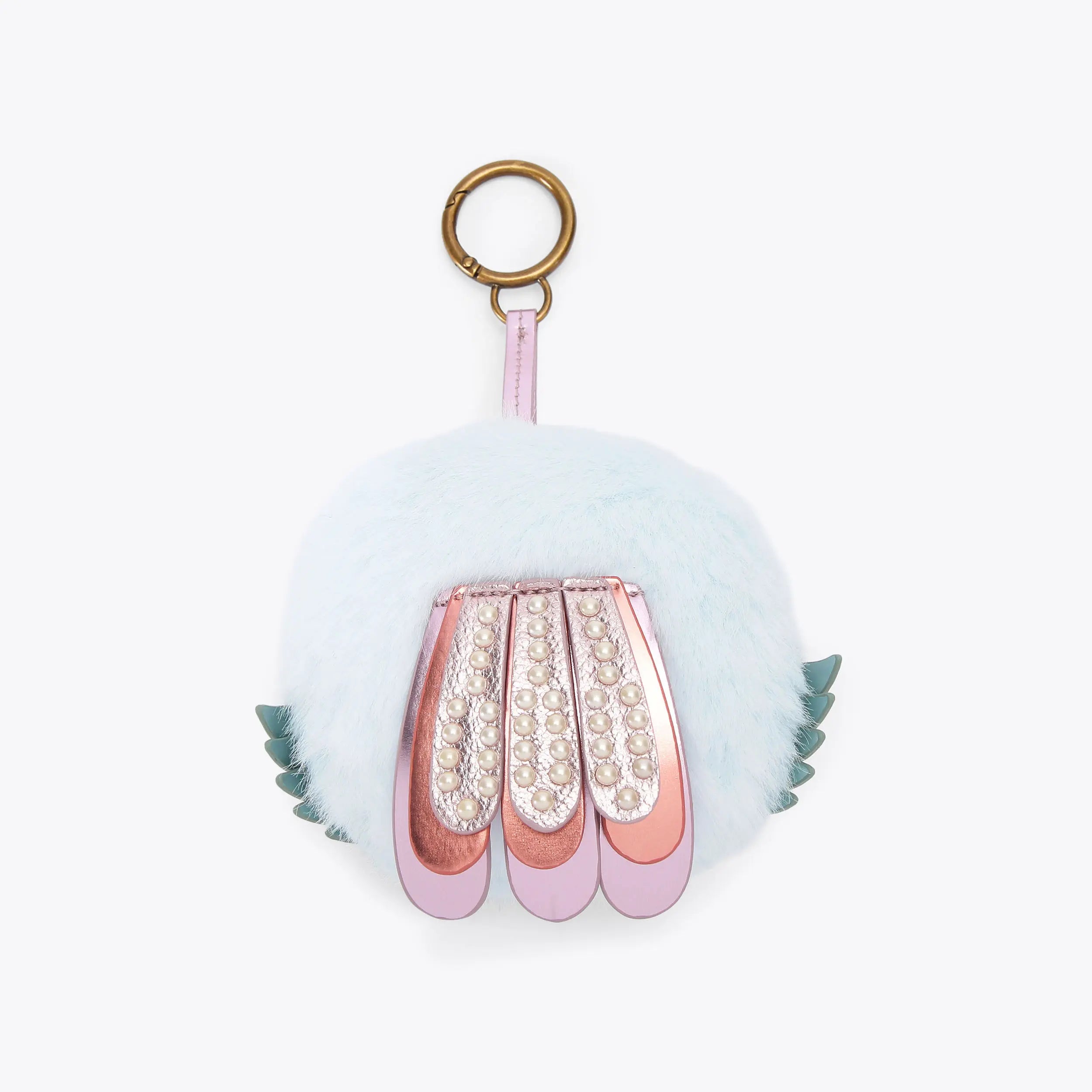 Attach this Pom Pom Eagle charm to your favourite Kurt Geiger bag or keyring. Crafted from a pale blue faux fur which is accented with 3D cut out wings and feathers.