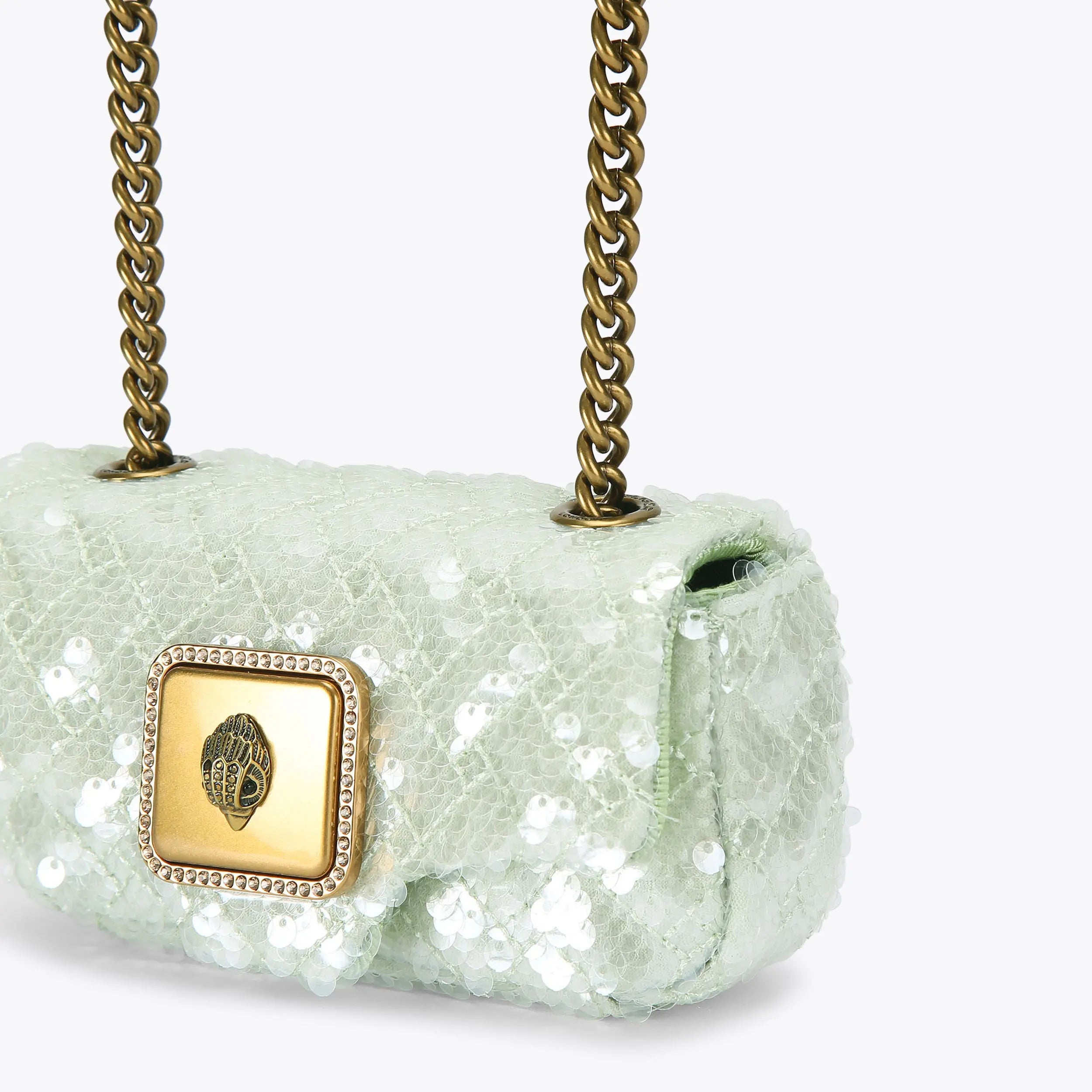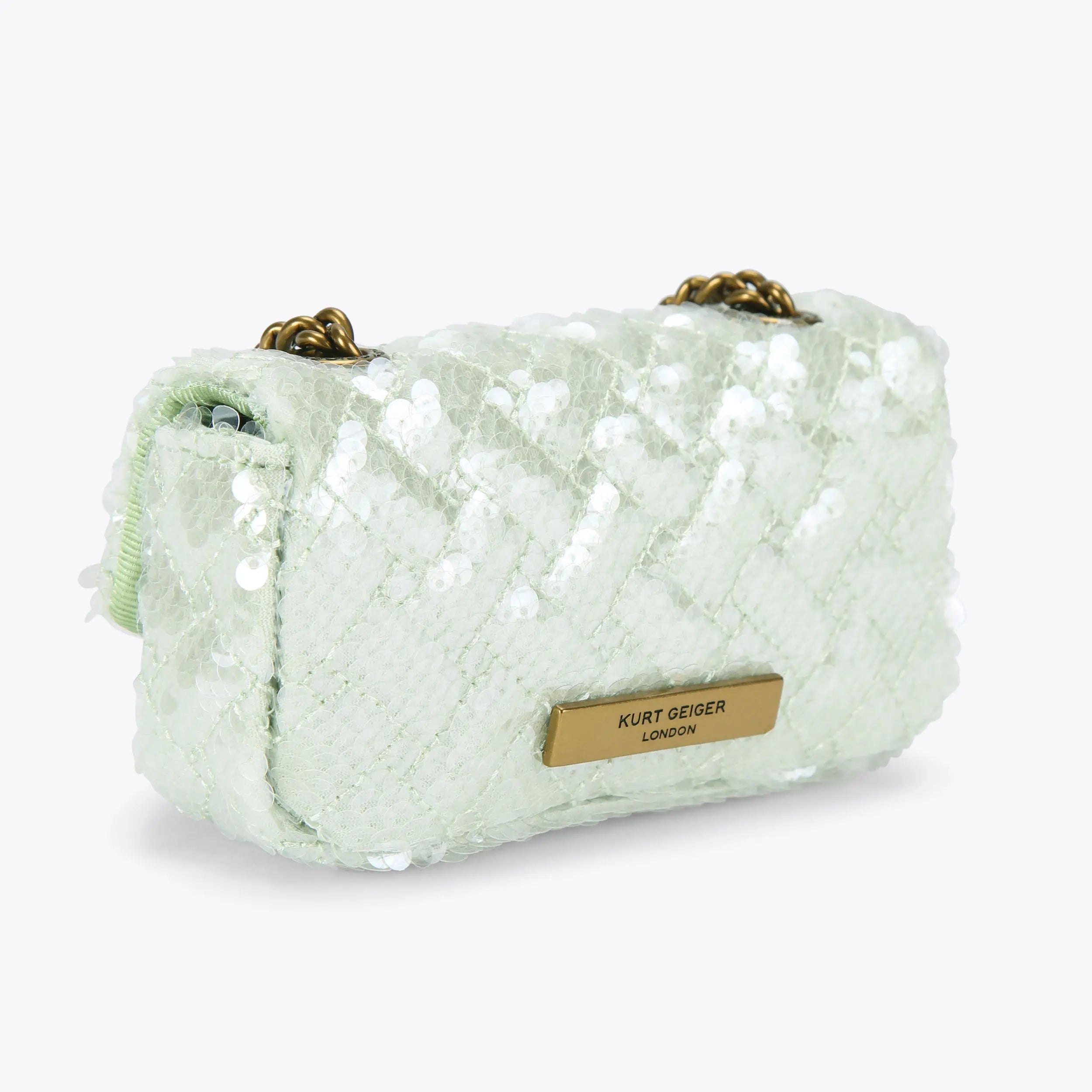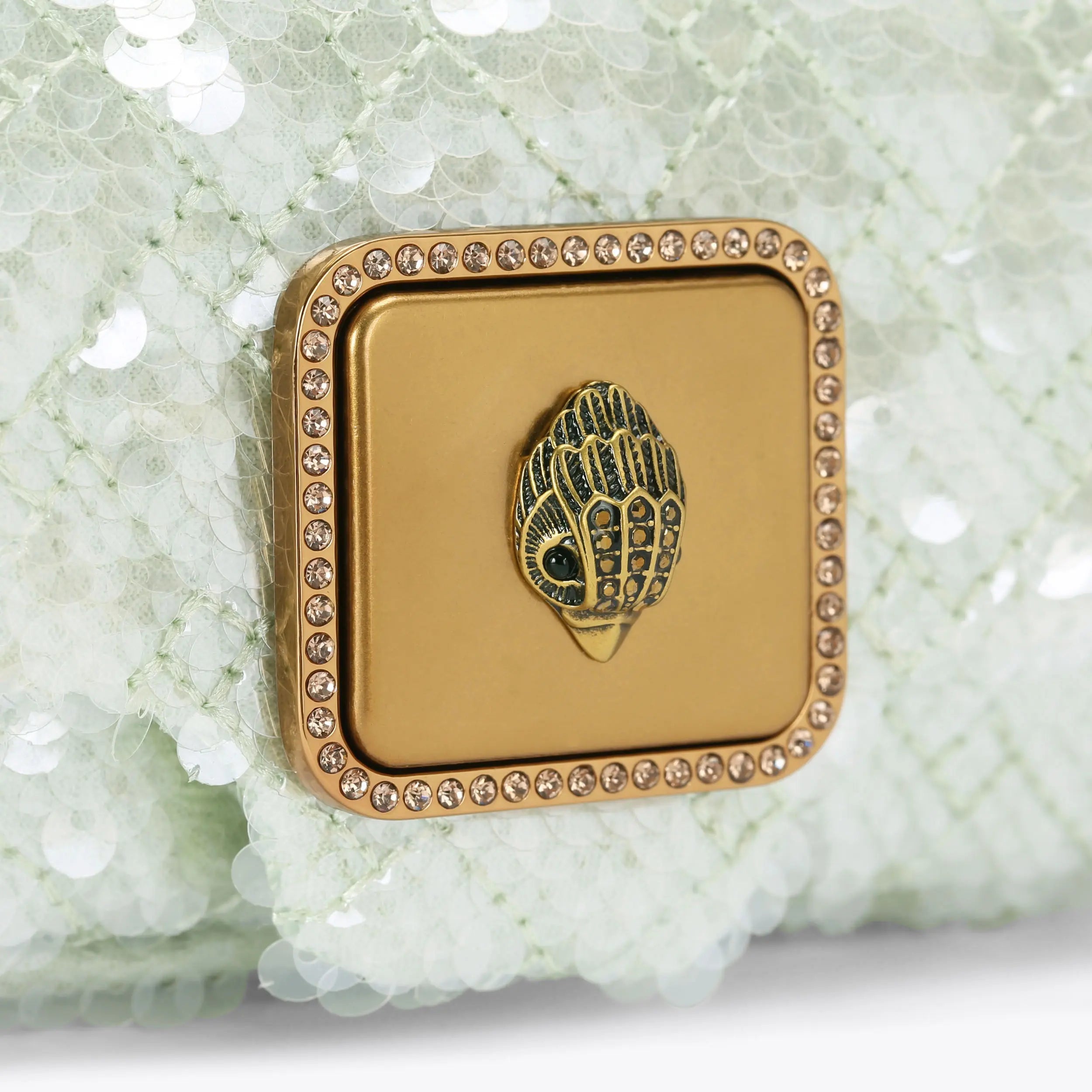 This Long Nano Pimlico Purse arrives in a pale green fabric which is embellished with clear sequins. There is an antiqued brass square plate on the front flap with eagle head at the centre.