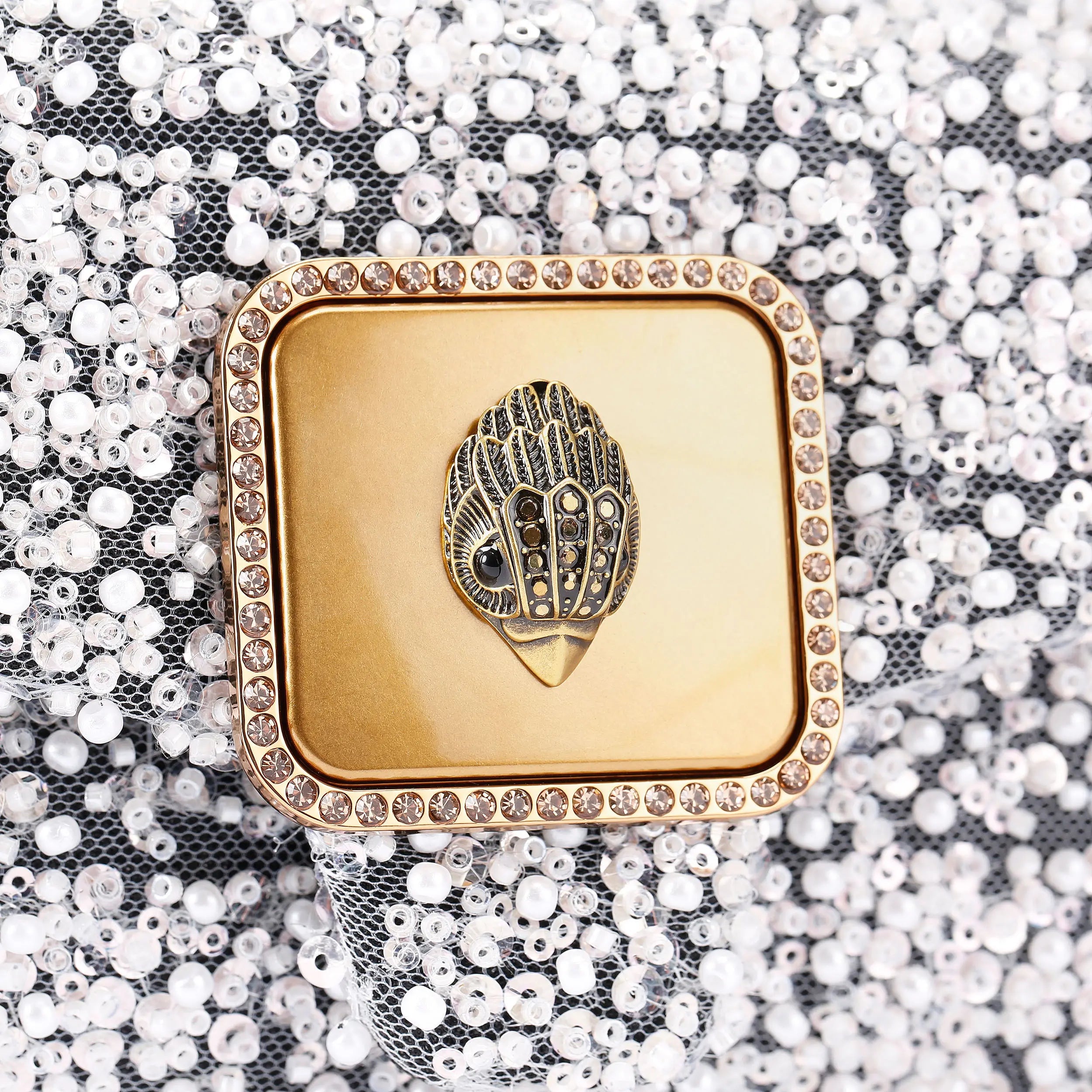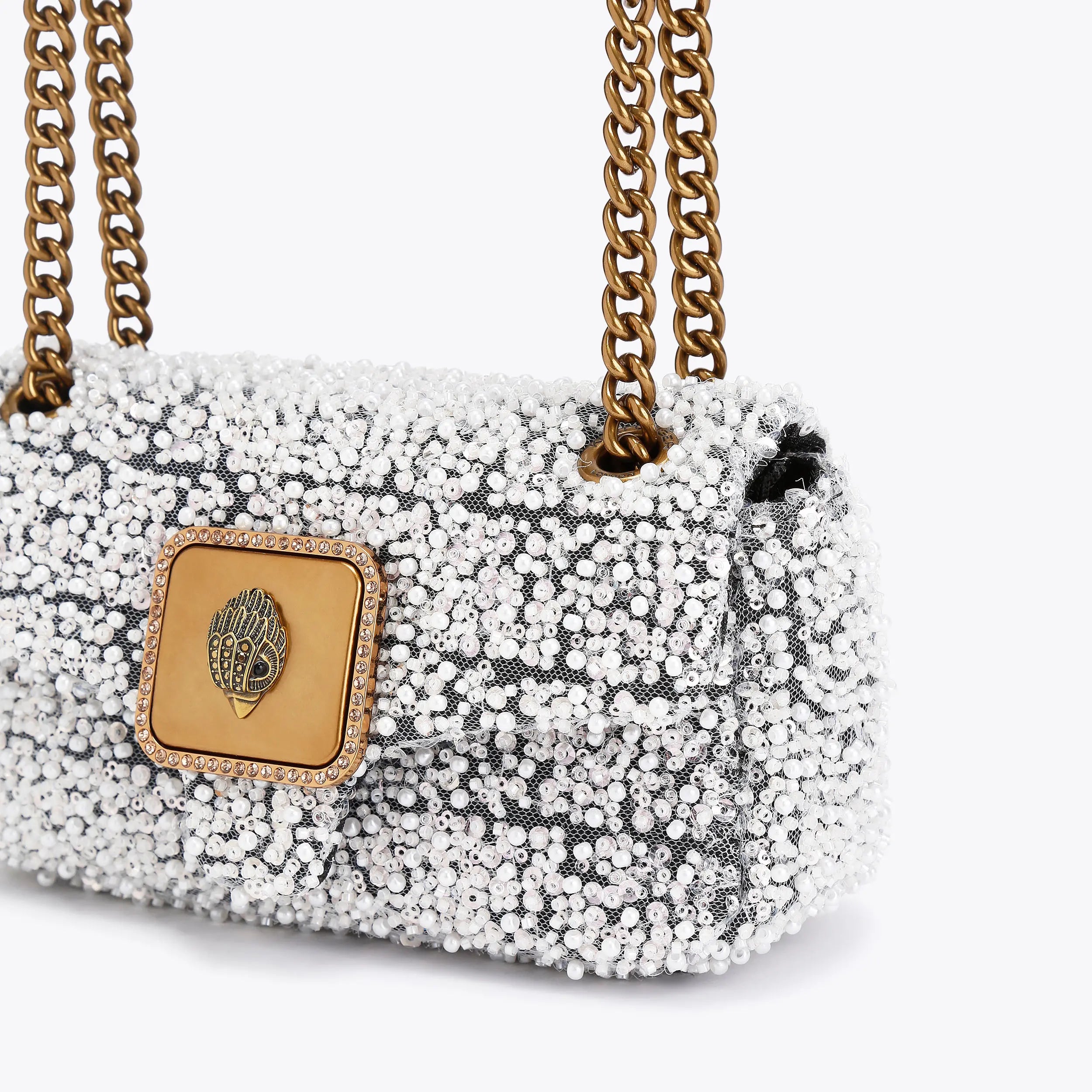 This Mini Pimlico Purse arrives in a faux pearl beaded mesh fabric with two separate compartments. There is an antiqued brass eagle head sat on the front of the purse.