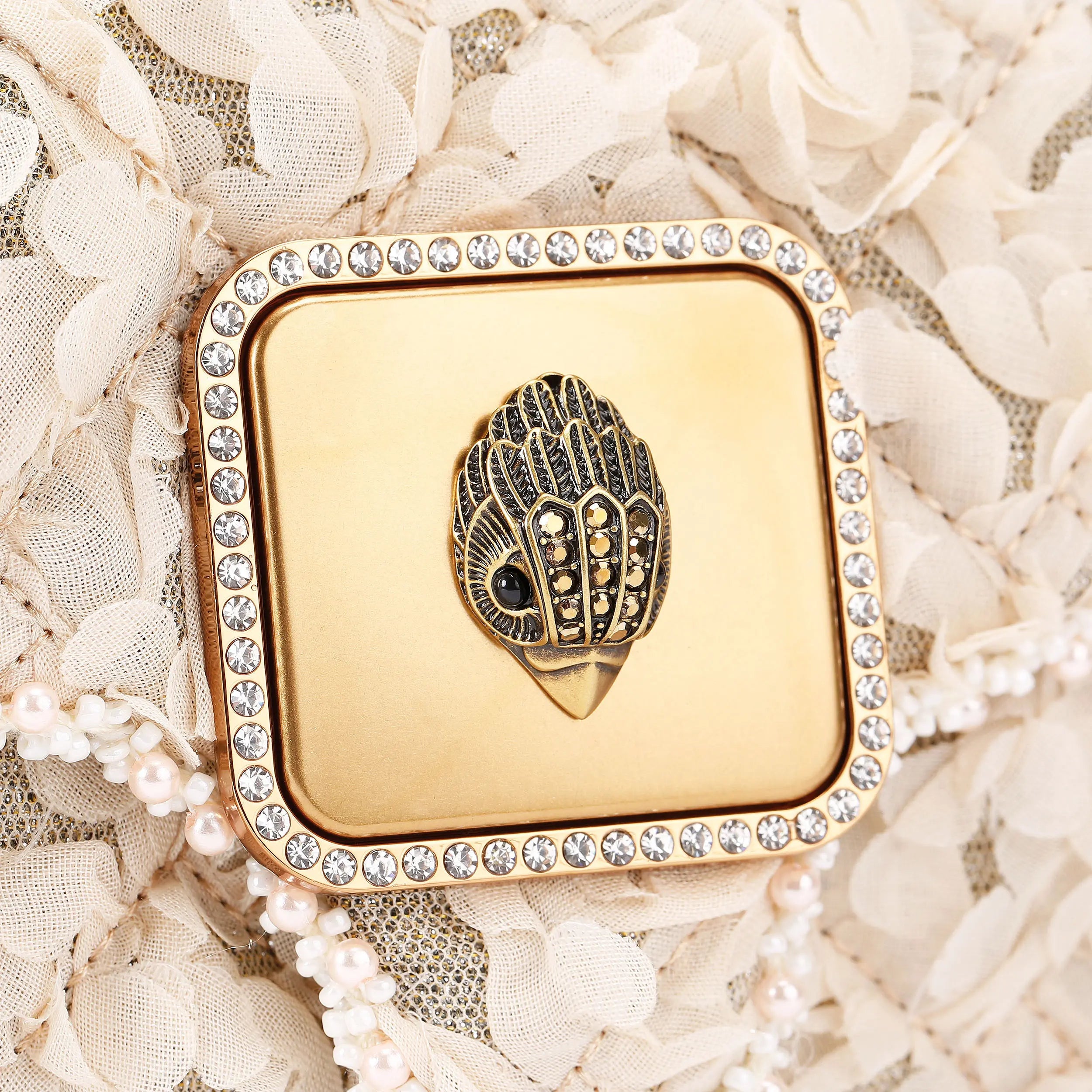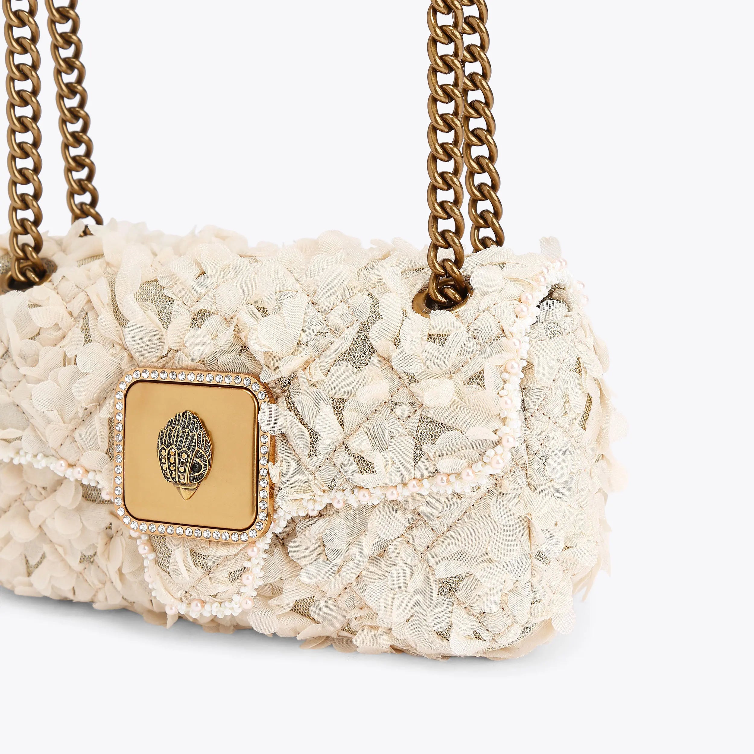 This Mini Pimlico Purse arrives in a beige textured fabric with faux pearl trim in two separate compartments. There is an antiqued brass eagle head sat on the front of the purse.