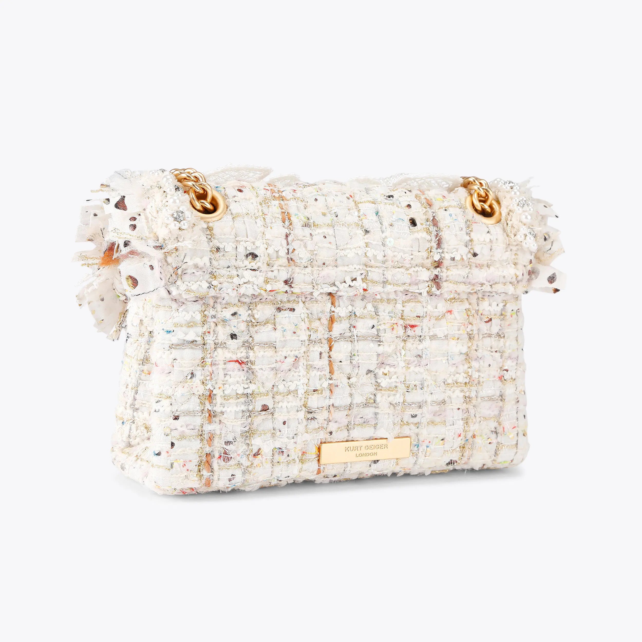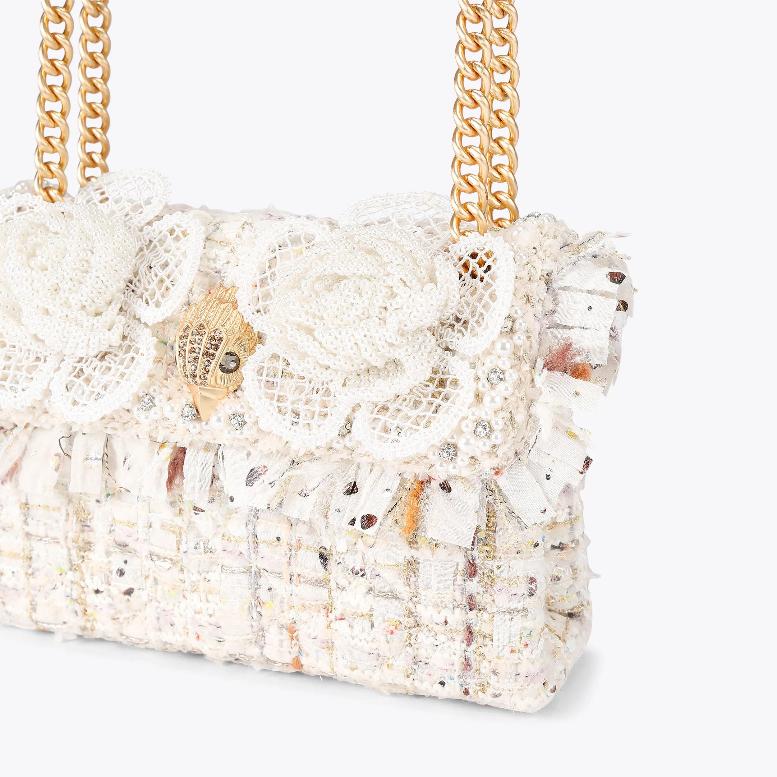 This Tweed Mini Kensington bag is crafted from a bone tweed fabric. The front flap is embellished with two faux pearl flower details as well as a brushed gold eagle head.