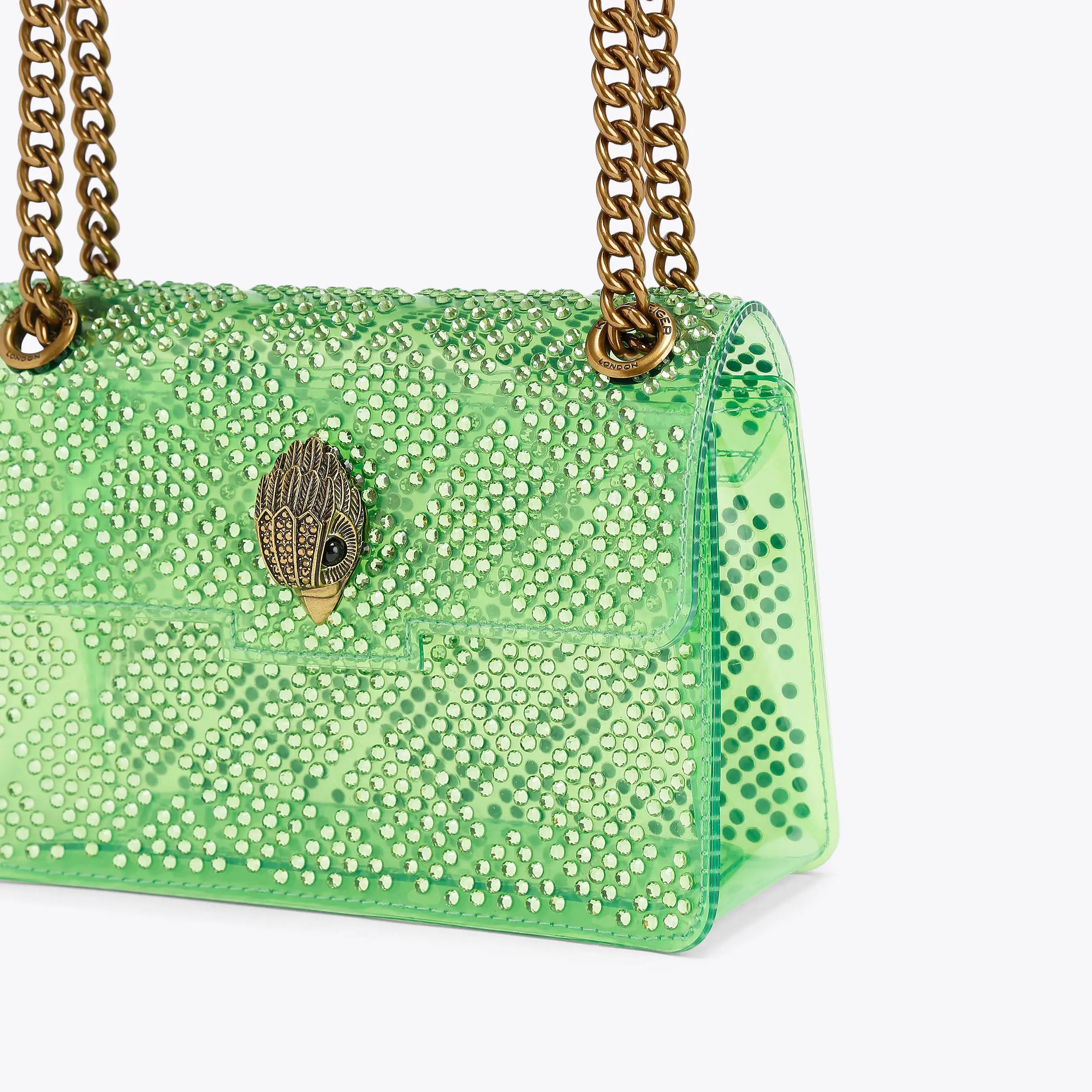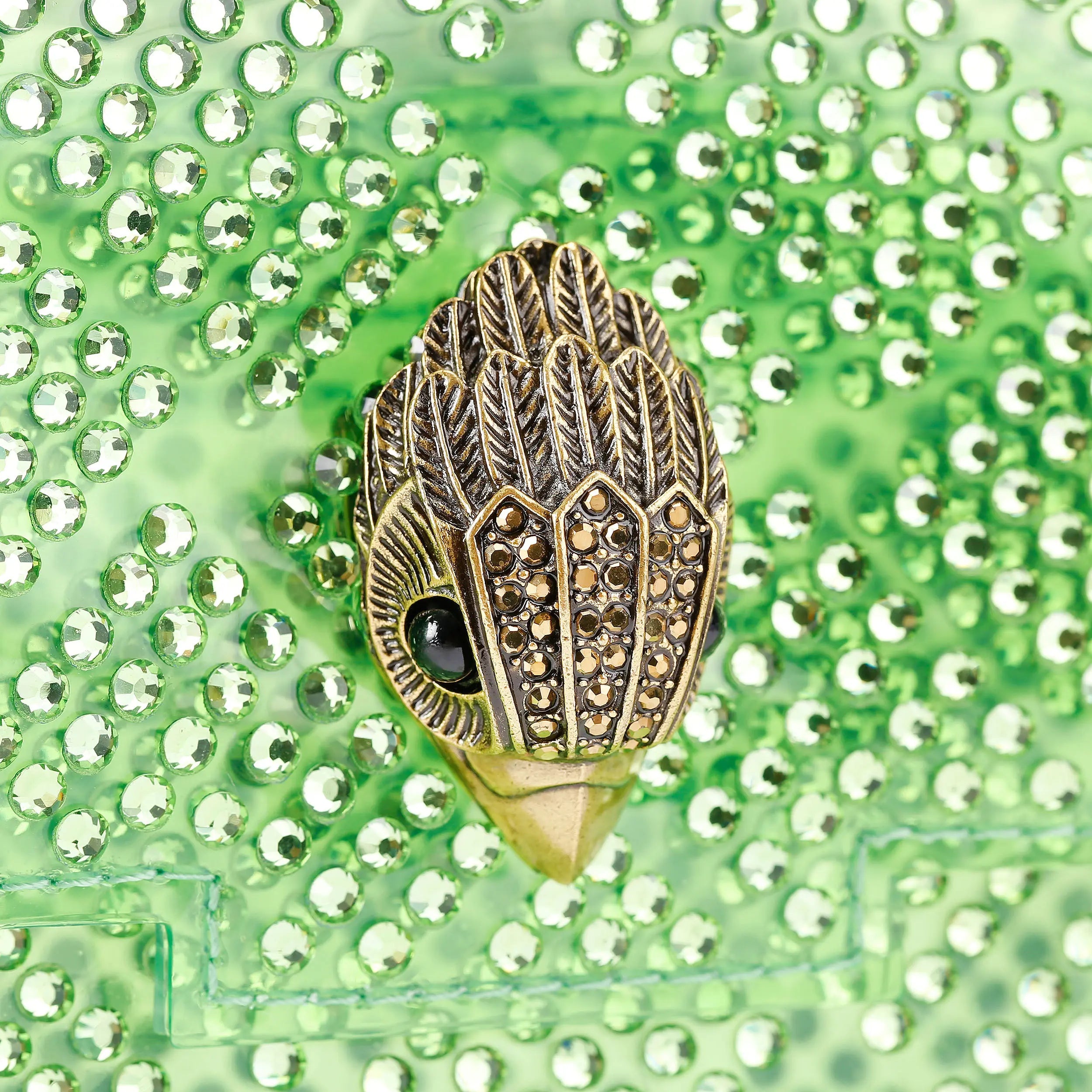 The Vinyl Mini Kensington is crafted from a green vinyl which is embellished with green crystals. The antiqued brass crystal eagle head sits on the front flap.