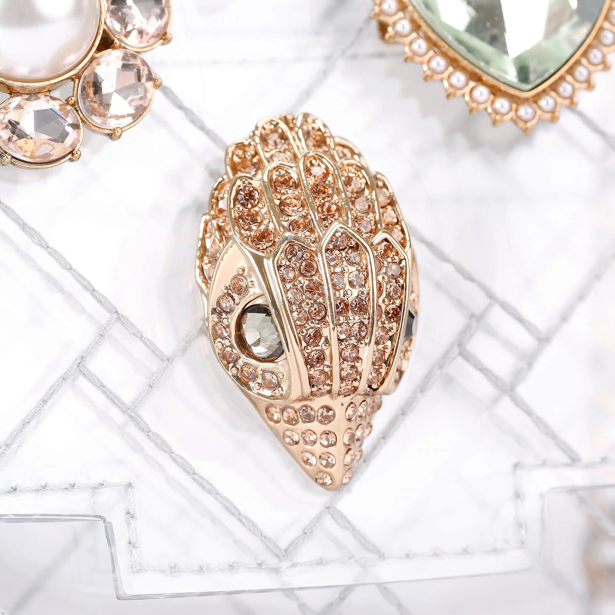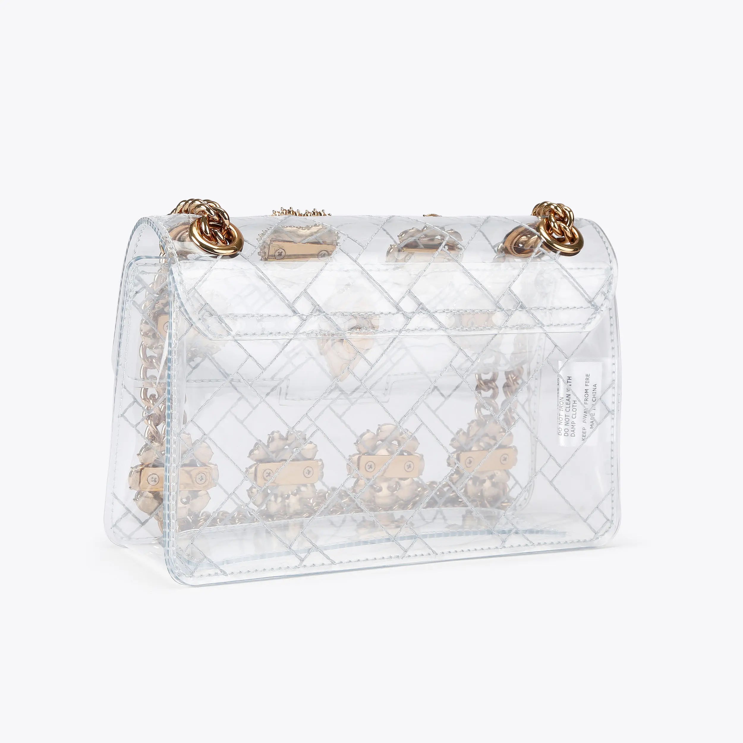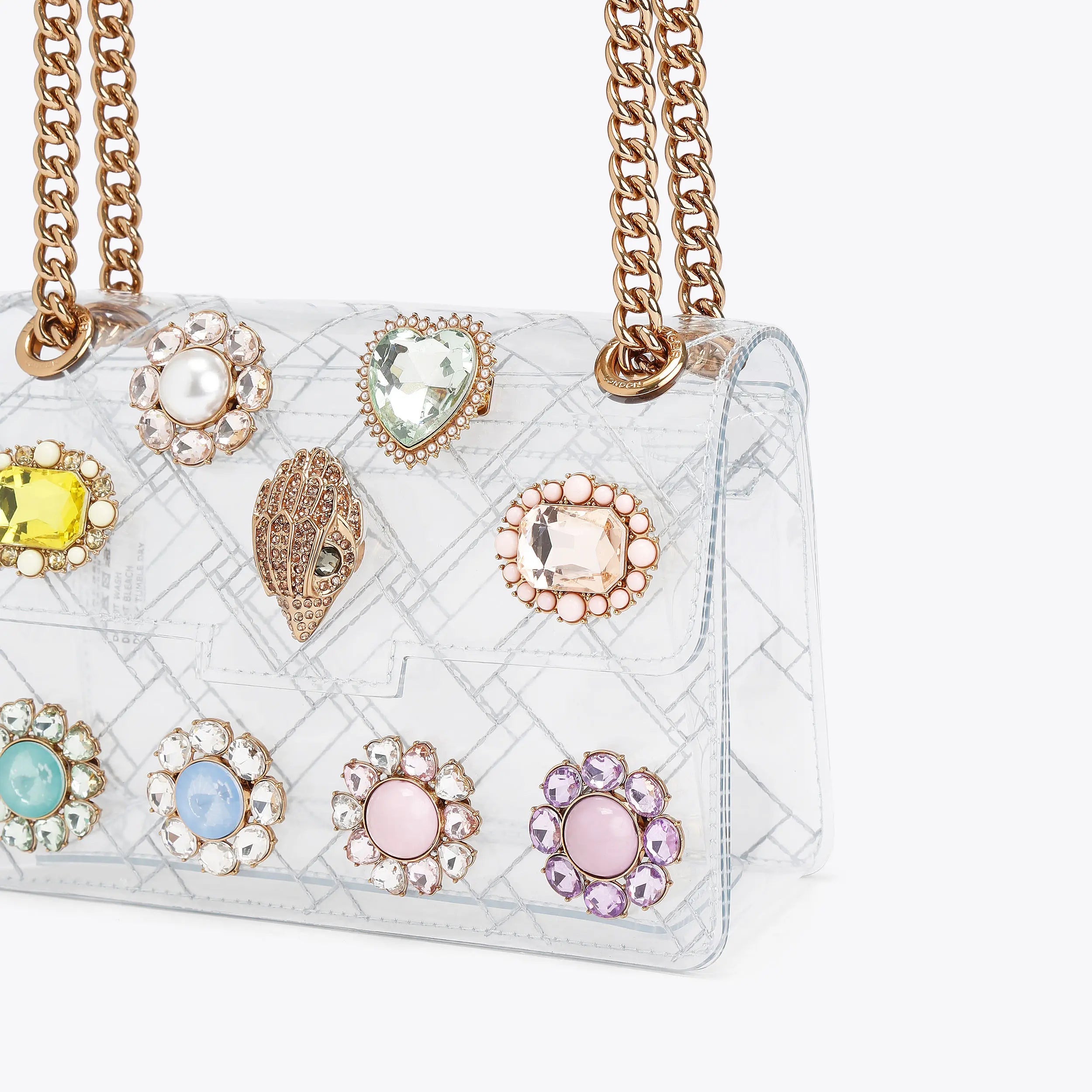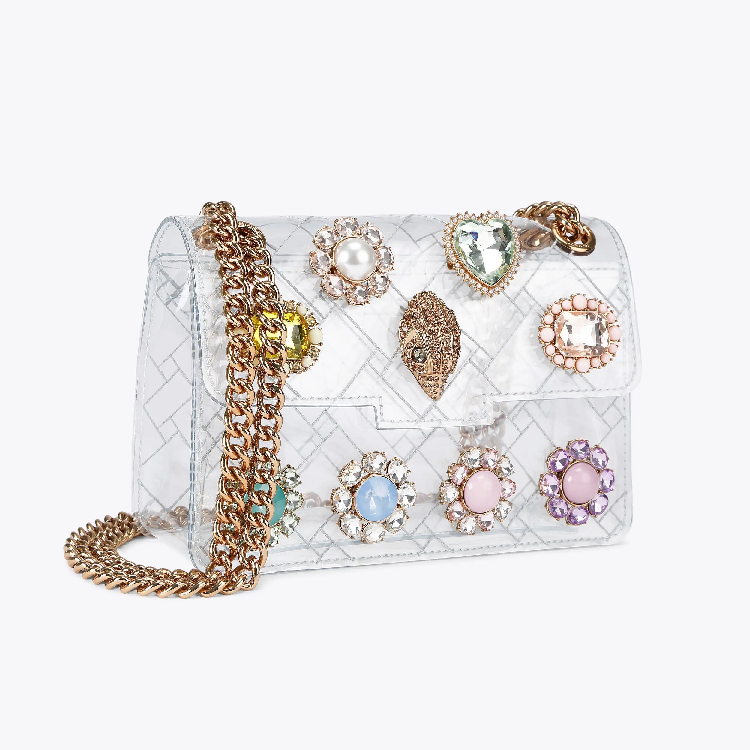 The Vinyl Mini Kensington bag is crafted from a transparent vinyl with overstitch quilting in a weave pattern which is embellished with large crystal and stone studs across the front. The gold eagle head with all over brass crystals sits on the front flap.