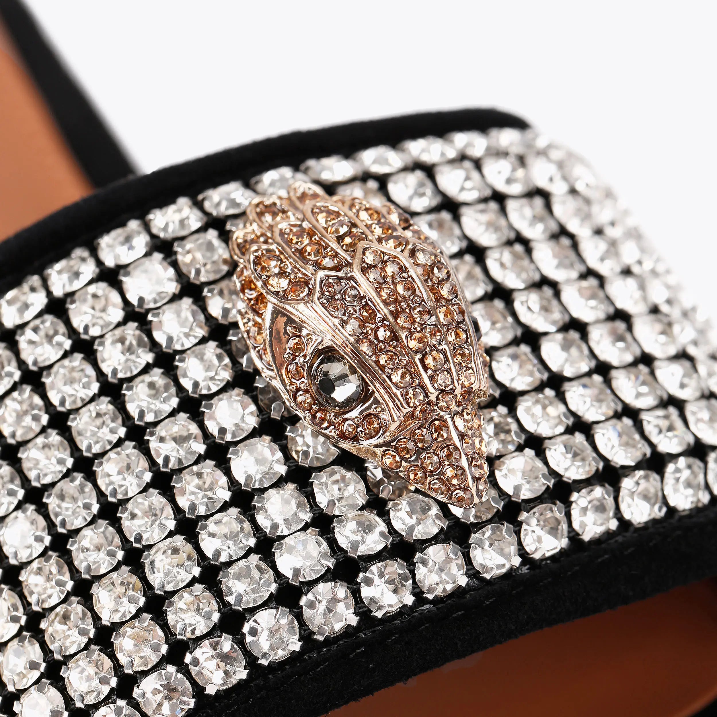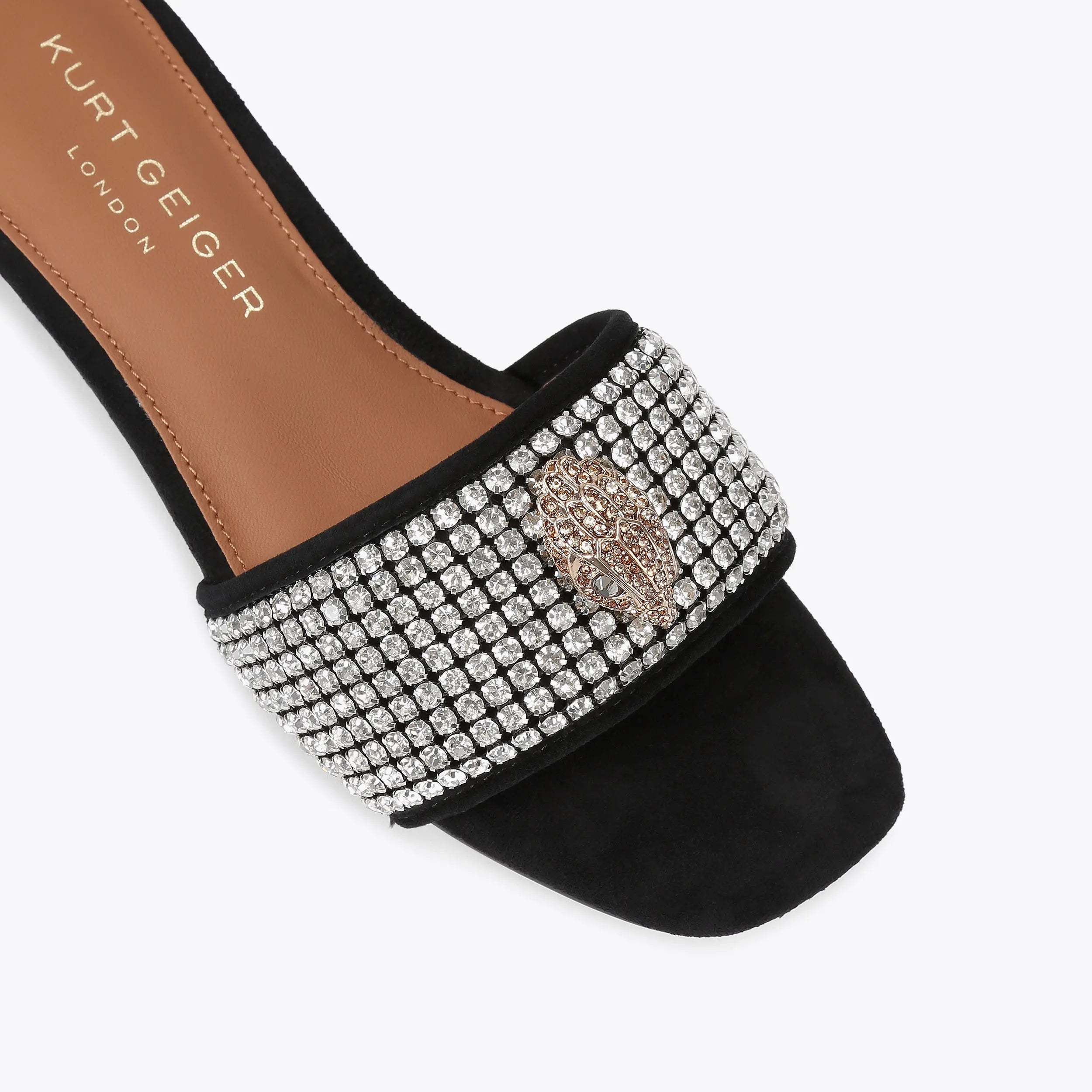 This Kensington Flat sandal is crafted from a black suede leather. There is a complete crystal embellishment across the straps alongside a gold eagle head sat on top.
