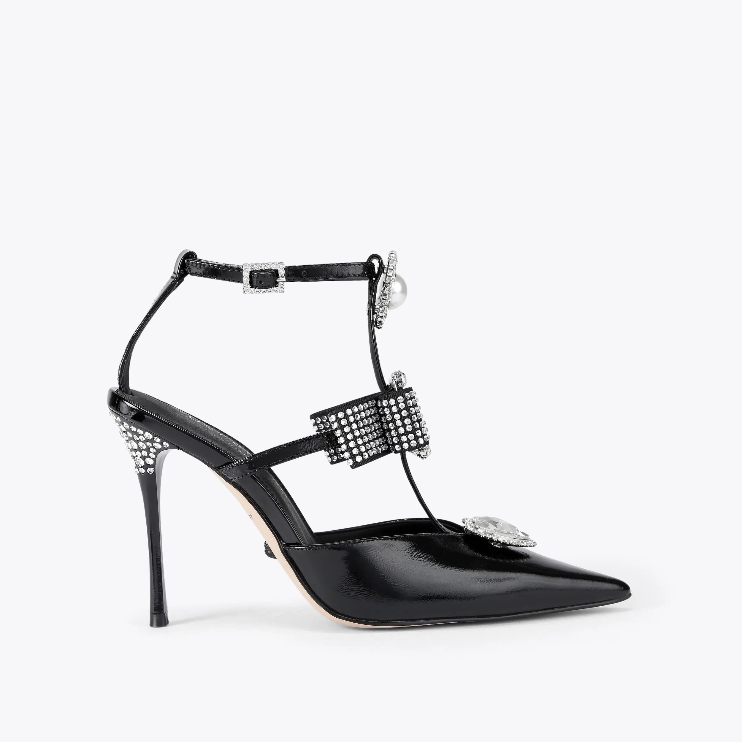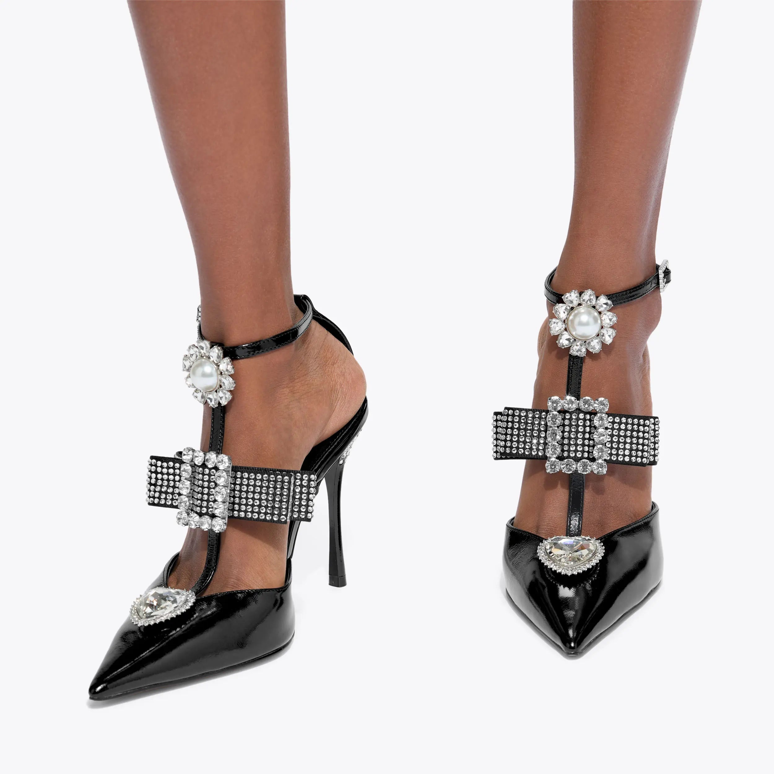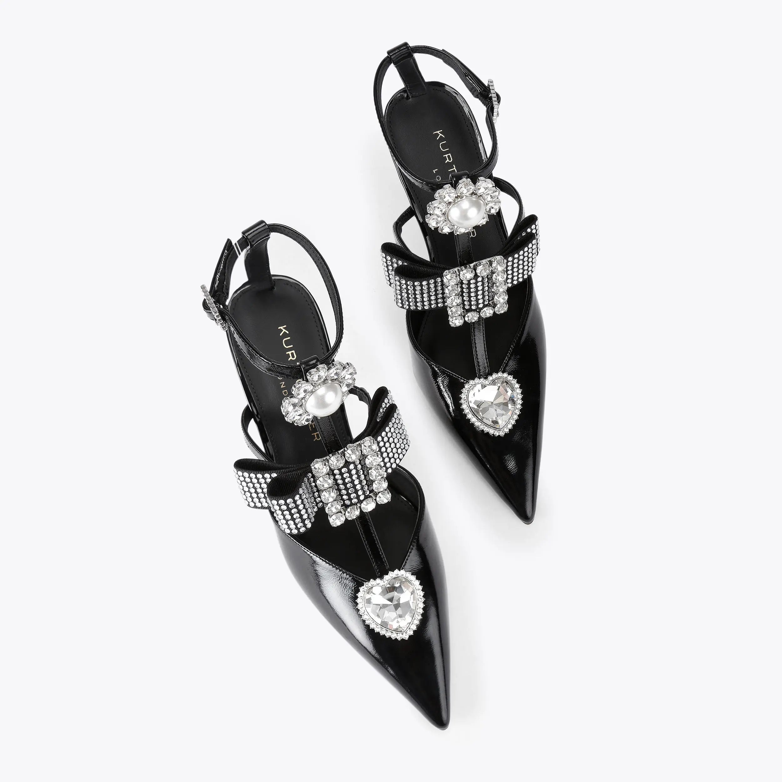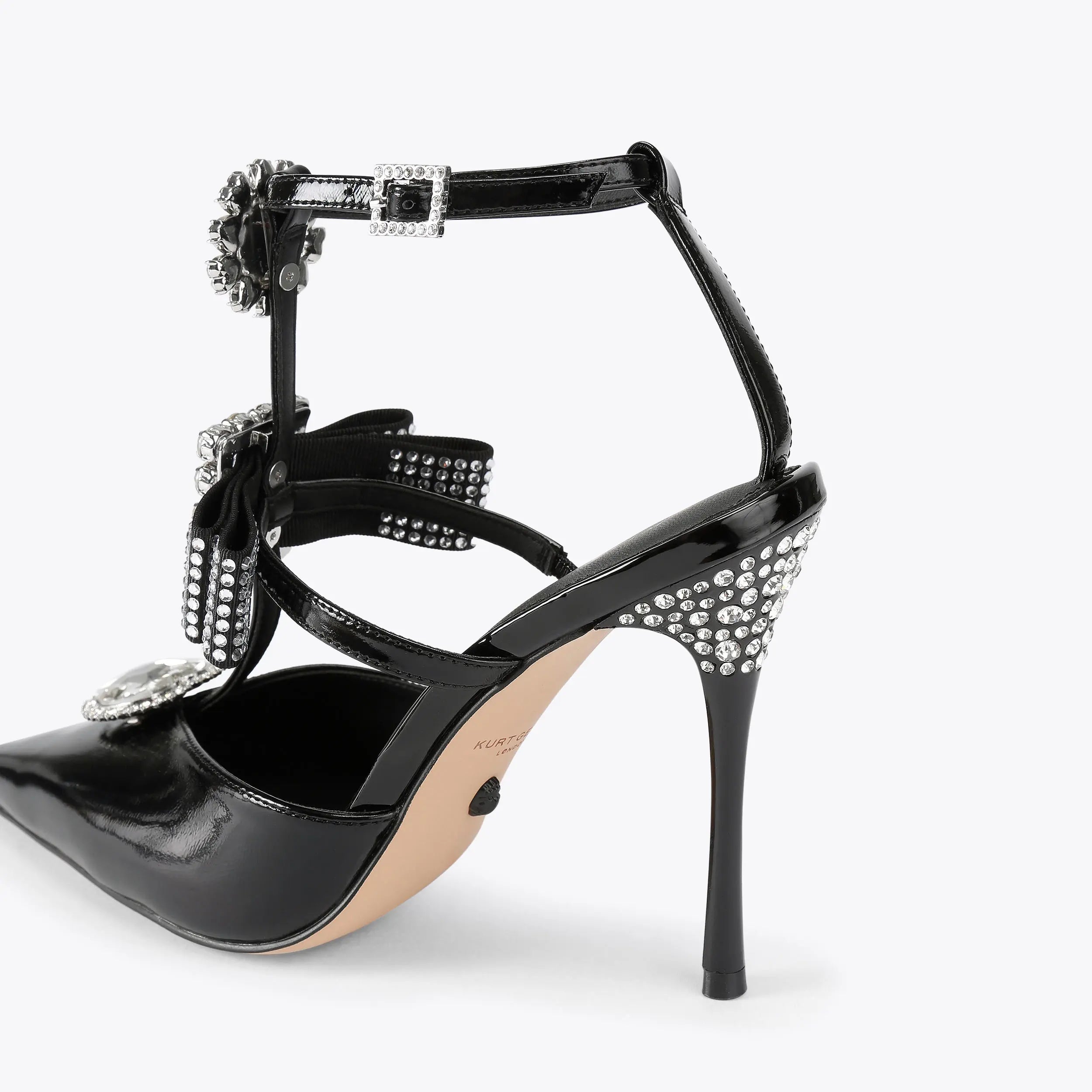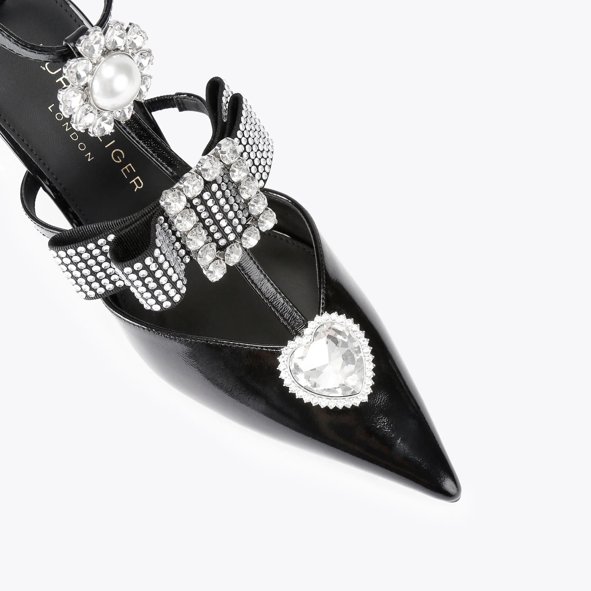 This pair of Bow Point Gladiator Court Heel are crafted from a black patent leather. There is a statement crystal bow detail across the front of the caged upper as well as a large heart crystal on the pointed toe.