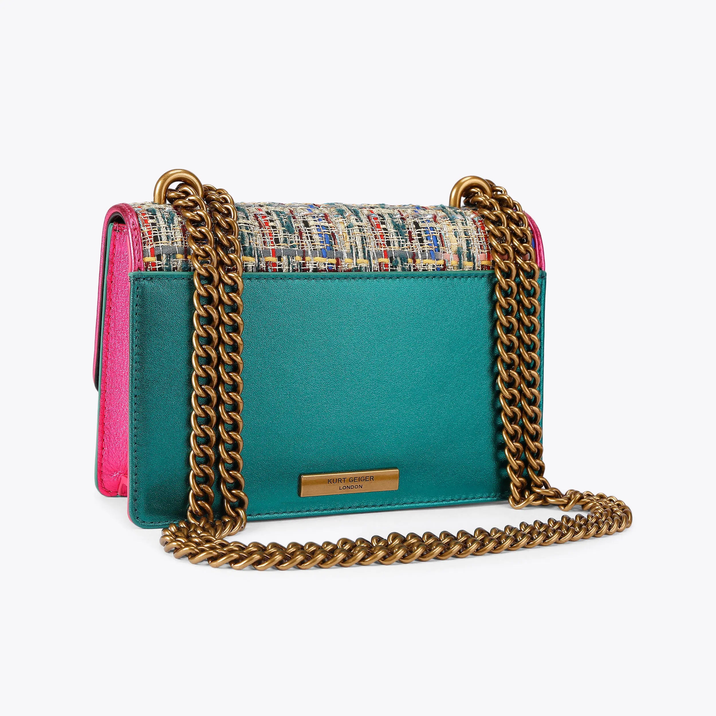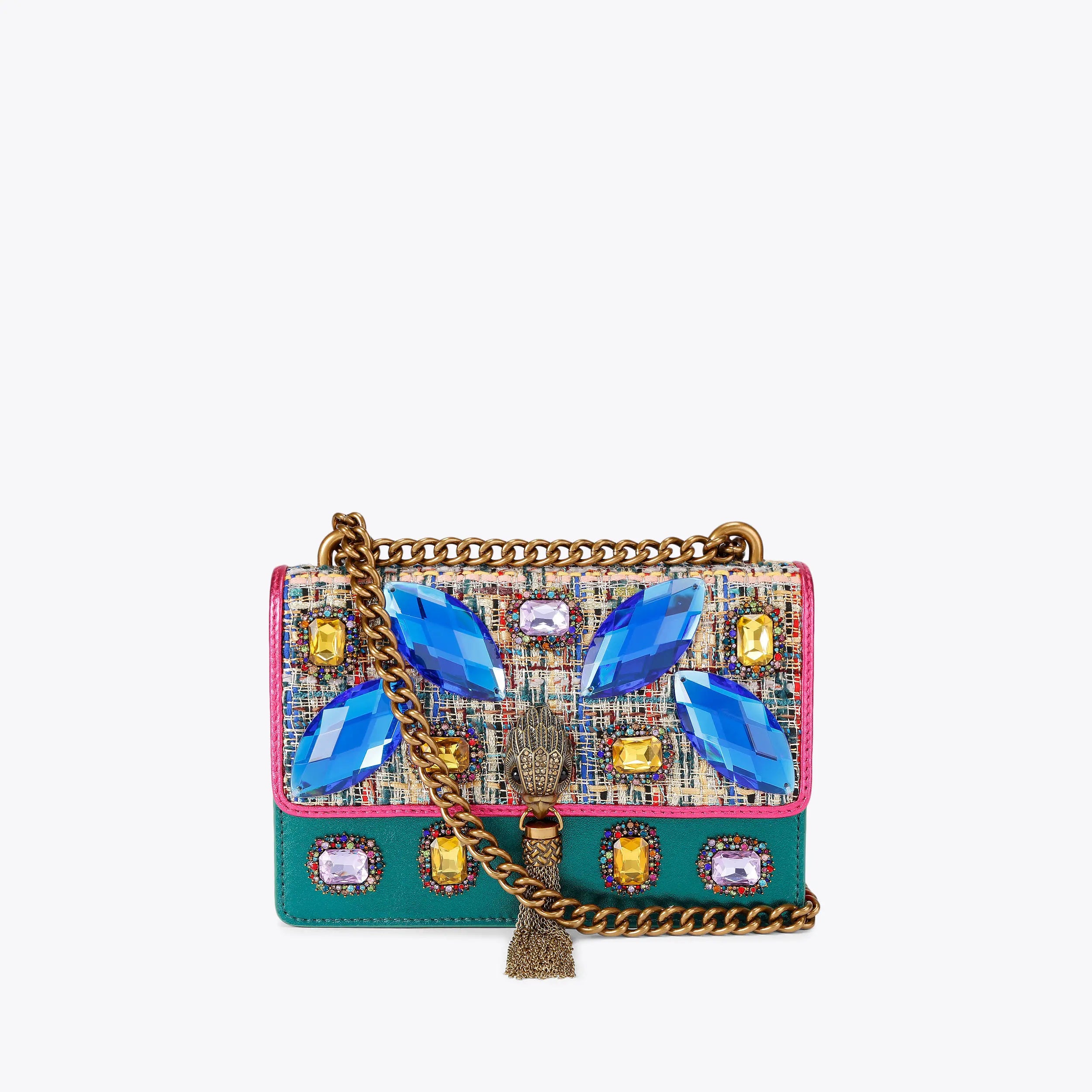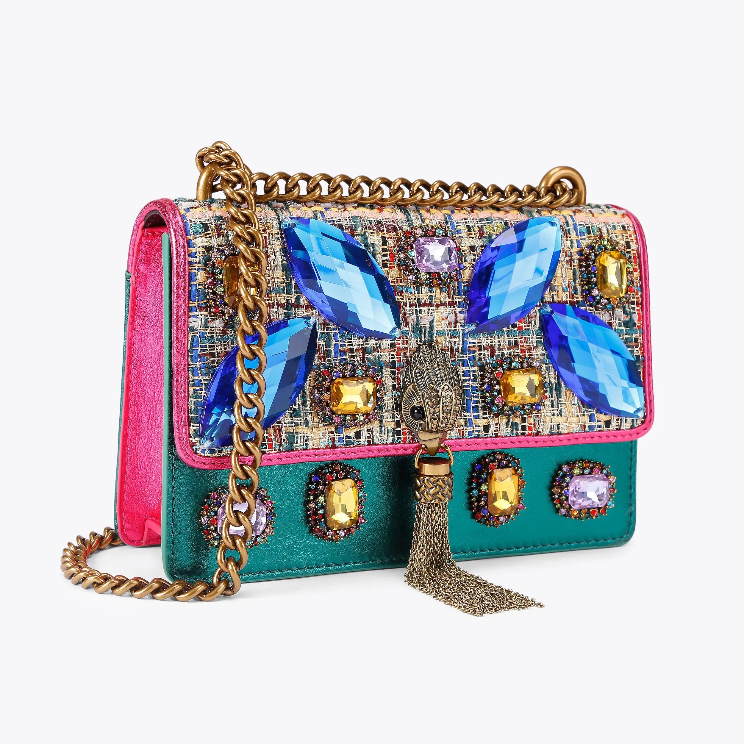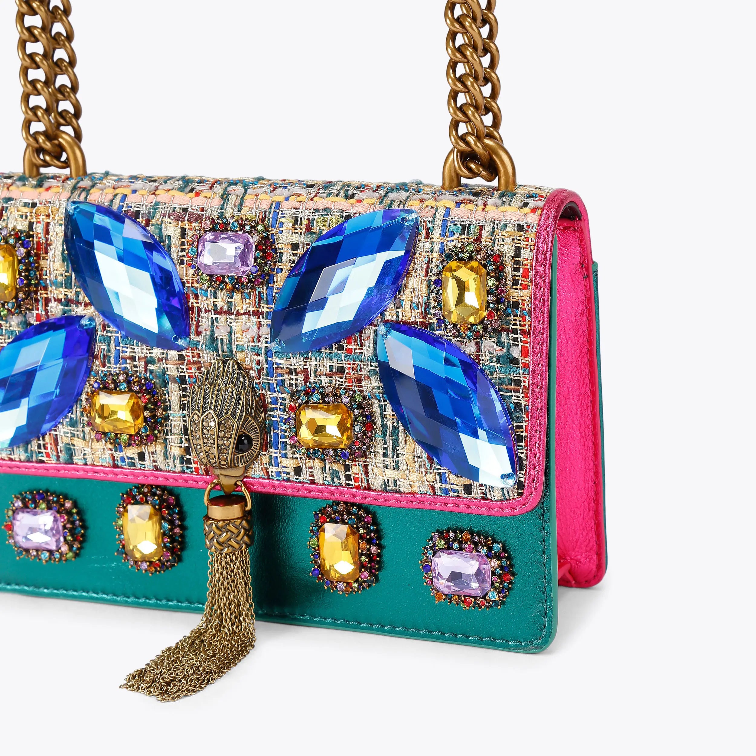 The Small Shoreditch Cross Body is crafted from a tweed fabric on the flap and green leather on the base. Both are embellished with large crystals. The front flap is topped with an antiqued brass eagle head with tassel detail.