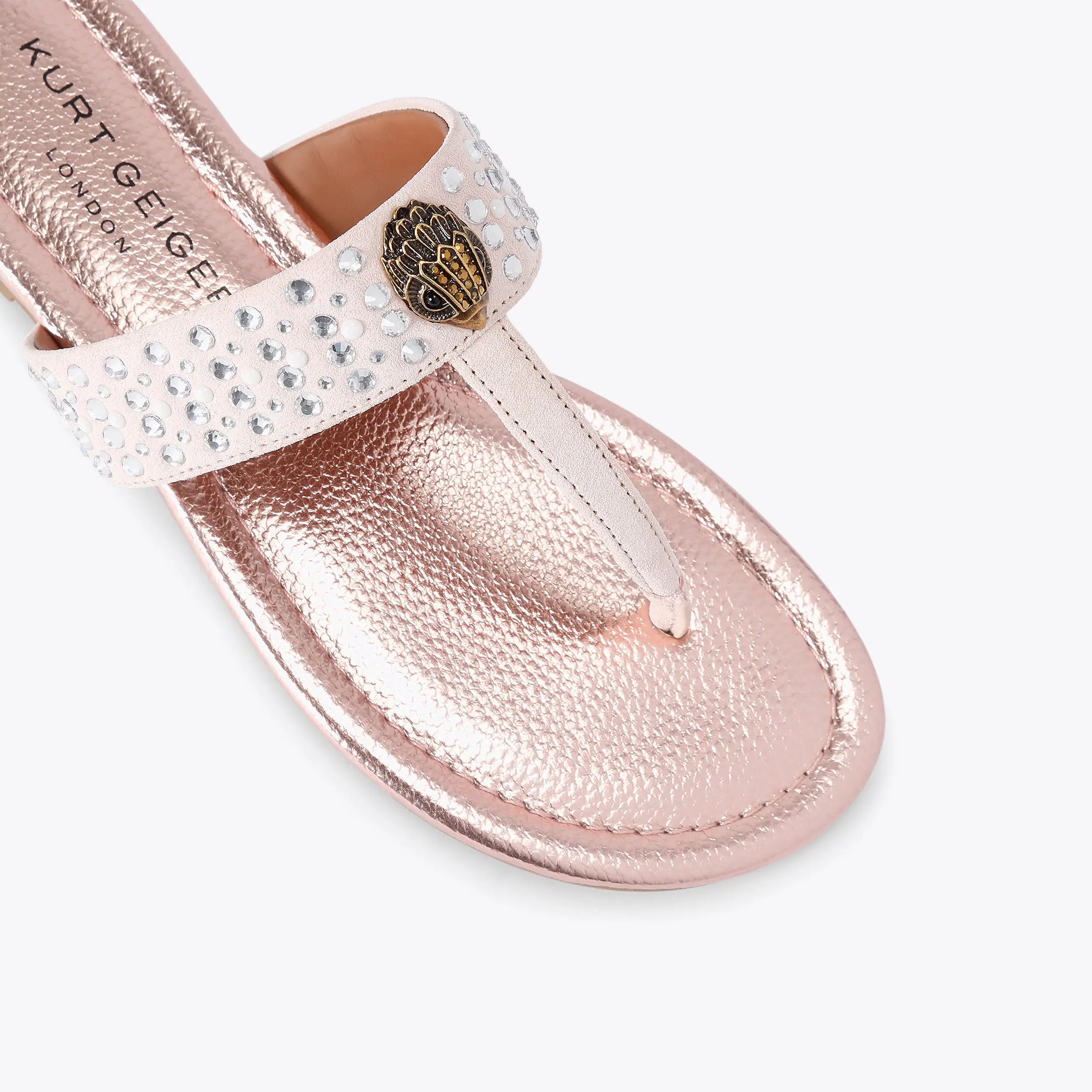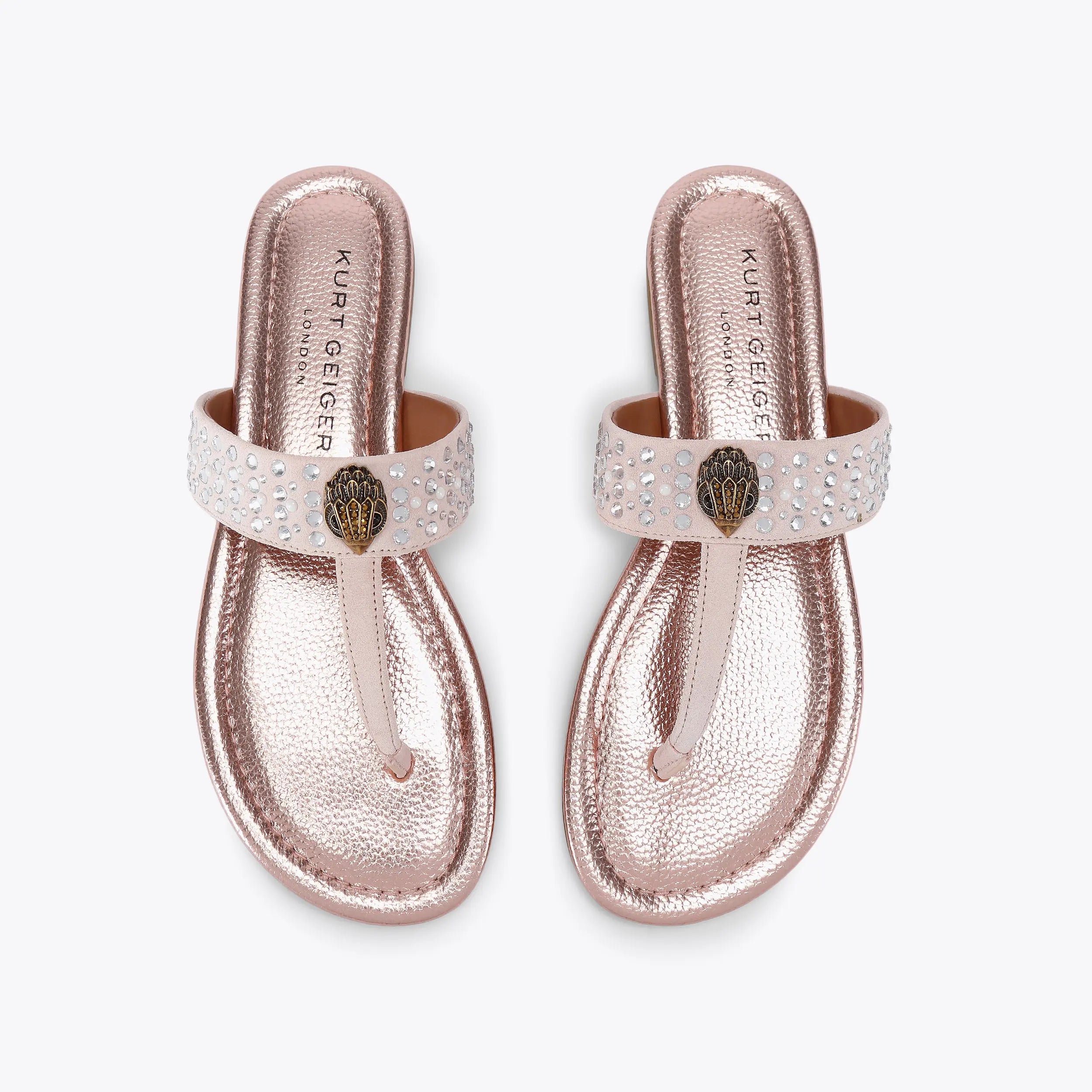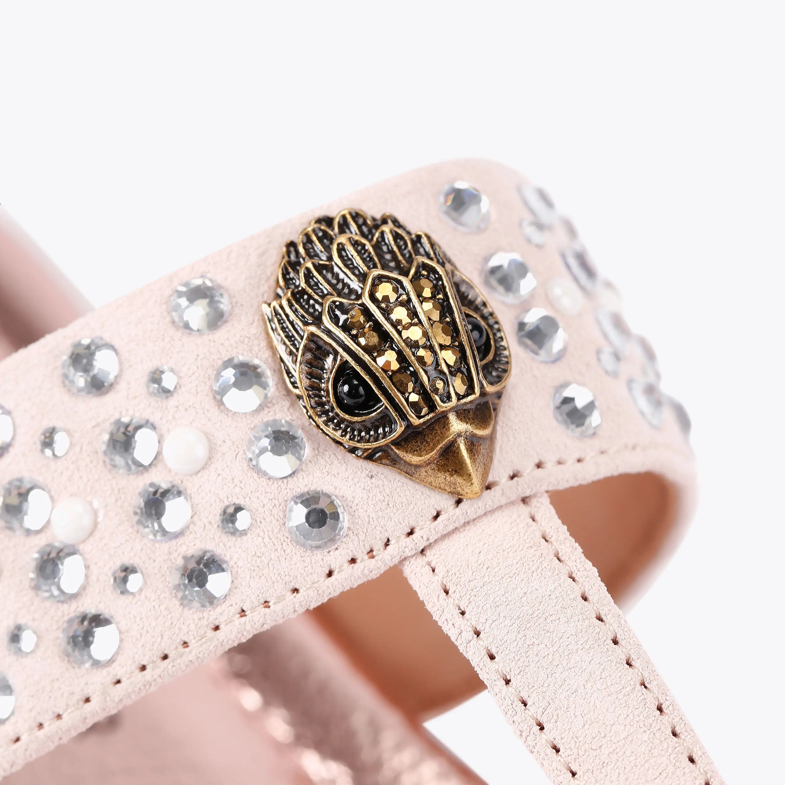 This Kensington T-Bar Sandal, features a toe post strap which is crafted from a pale pink suede leather and embellished with crystals and pearls. There is an antiqued brass eagle head with crystals sat on the top of the strap.