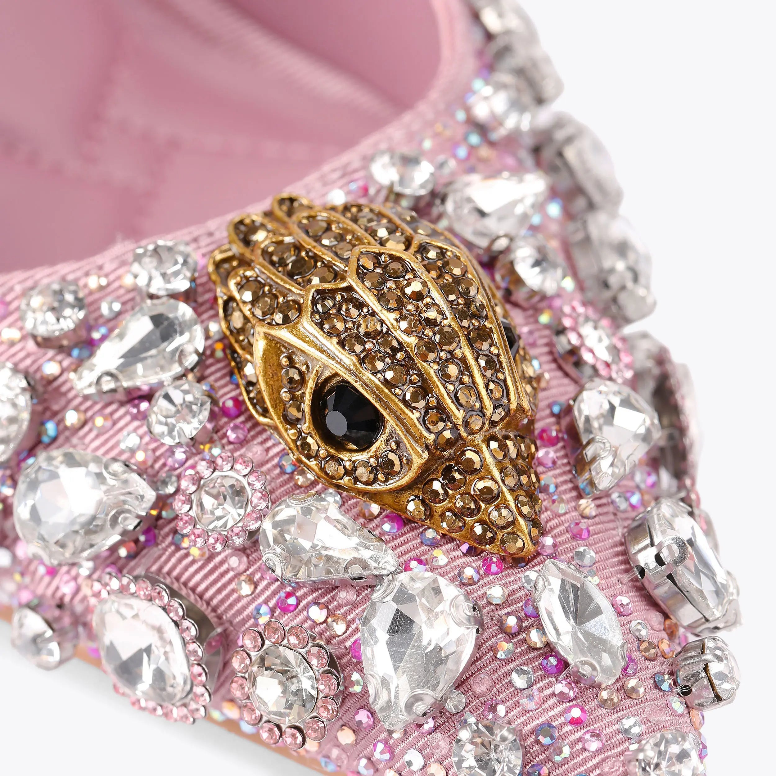 This pair of Belgravia High Sling back heels arrive in a pink fabric. The toe and slingback strap are embellished with silver crystals as well as an antiqued brass eagle head.