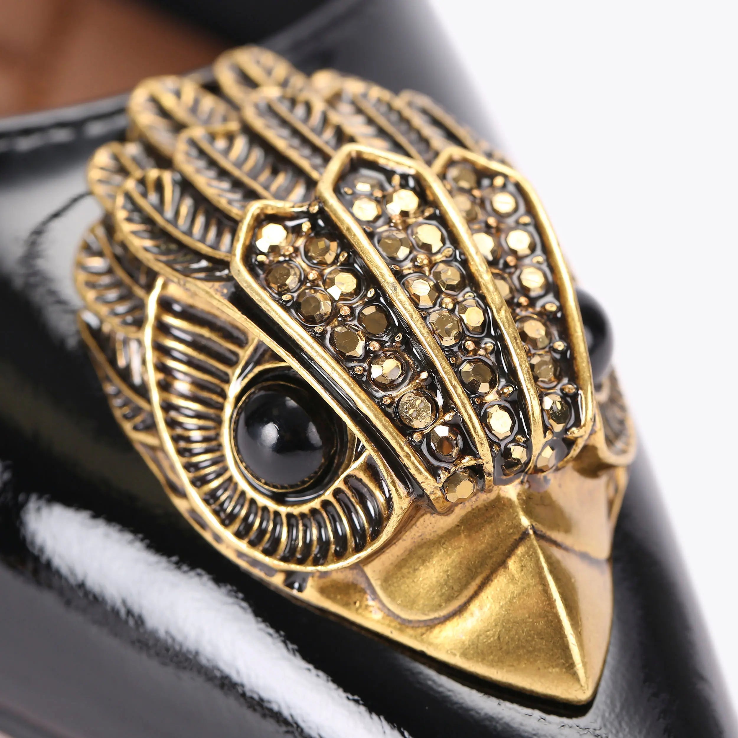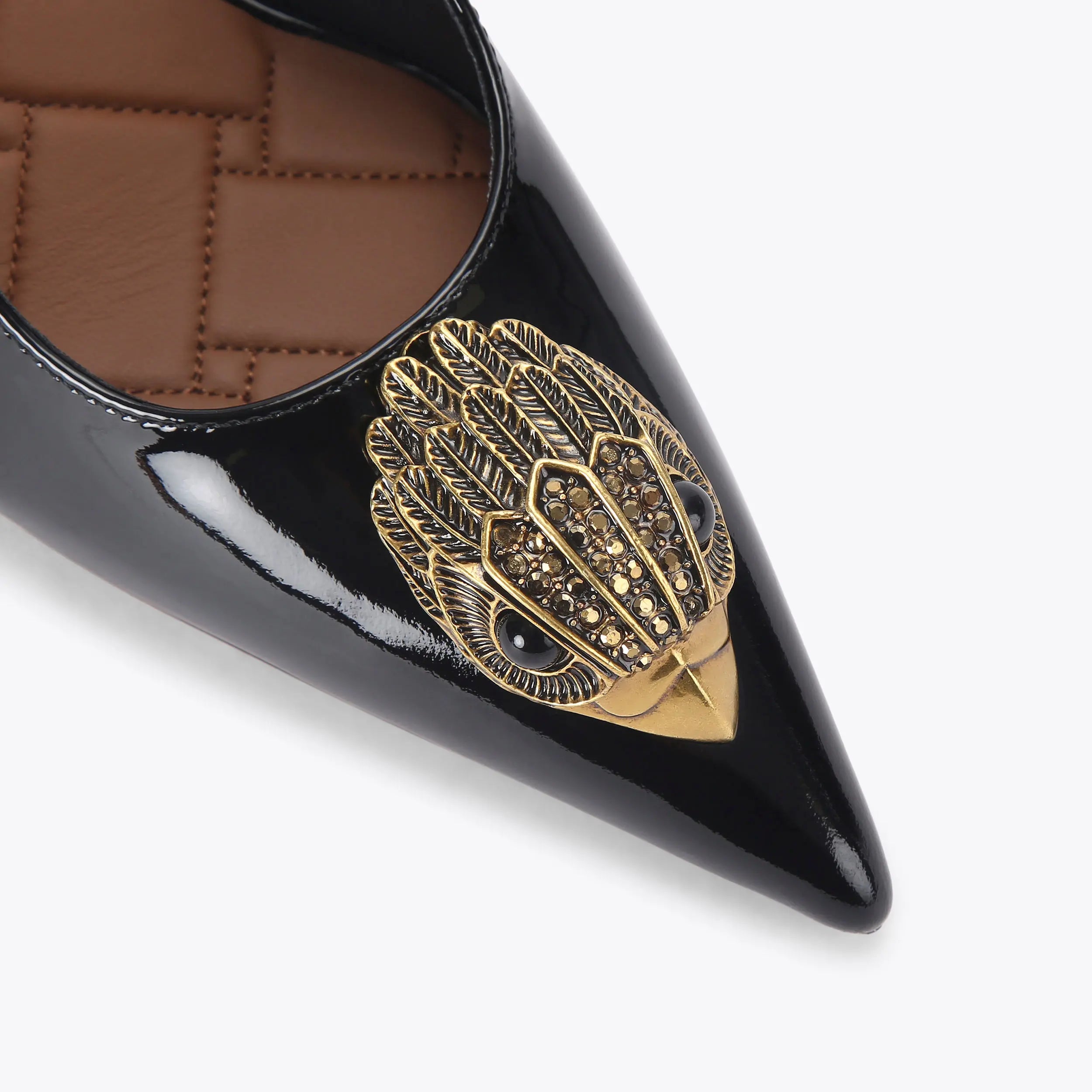 This Large Eagle Sling heel is crafted from a black patent leather. There is an oversized antiqued brass eagle head with crystals sat on the toe.