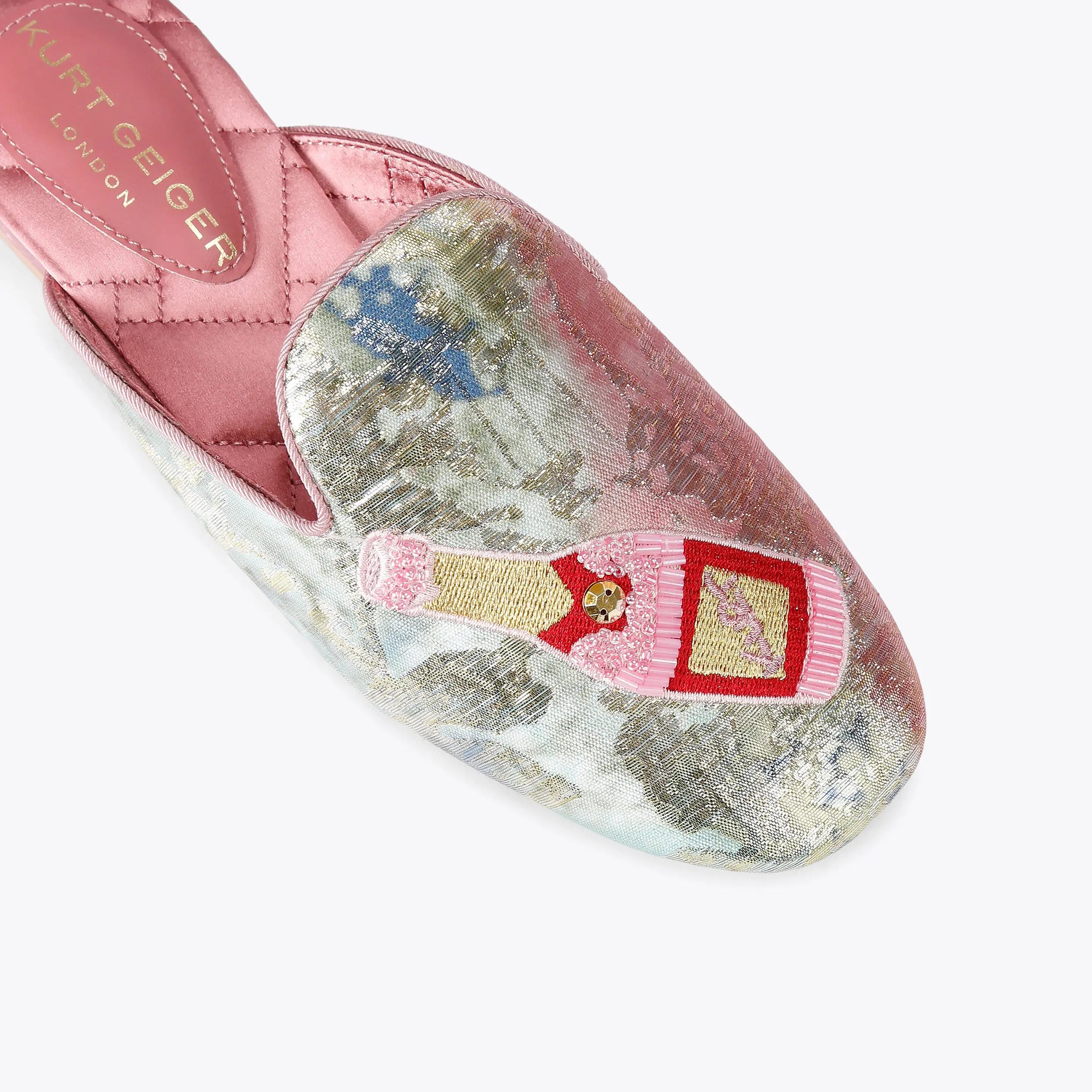 This pair of Embroidered Slippers slip onto the foot. The upper is in an iridescent woven fabric and each shoe is embellished; one vamp features a lipstick and the other an iced cake.