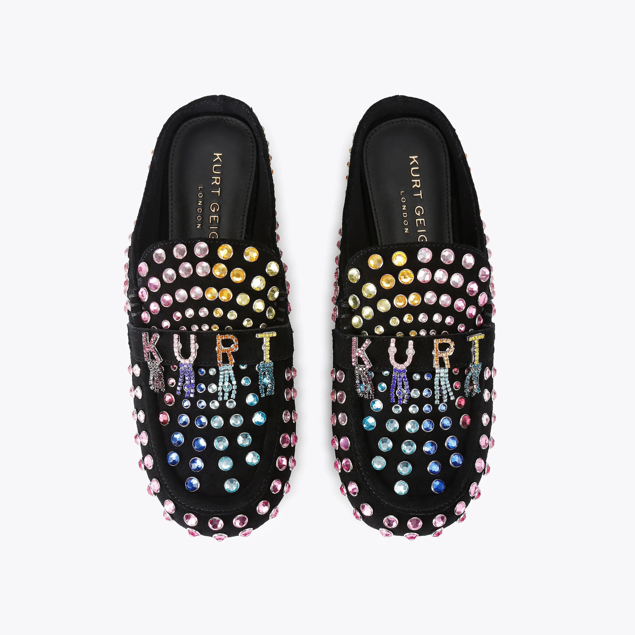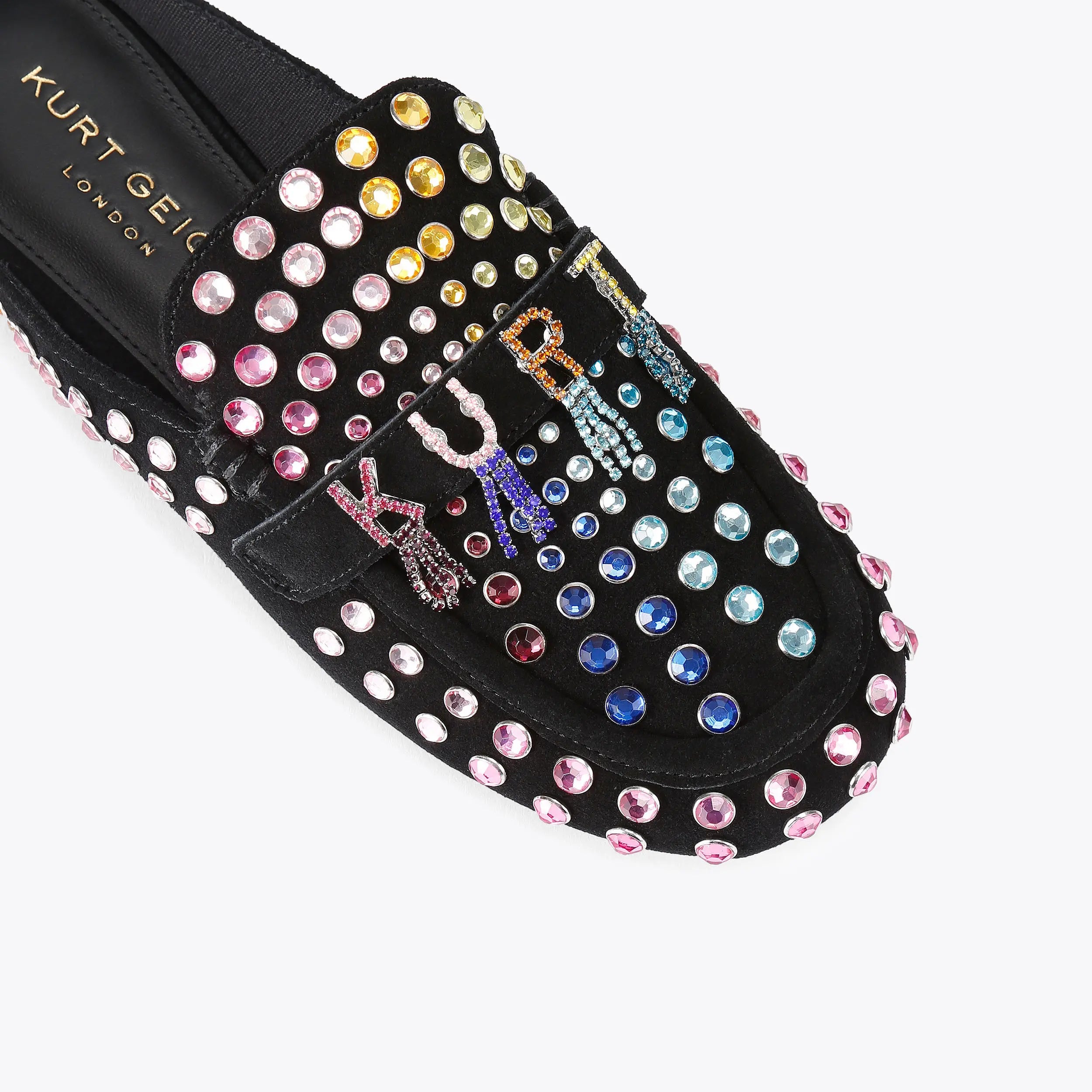 This Kurt Crystal Slipper slips onto the foot. The upper is embellished with rainbow crystals as well as tasseled 'KURT' branding across the foot strap.