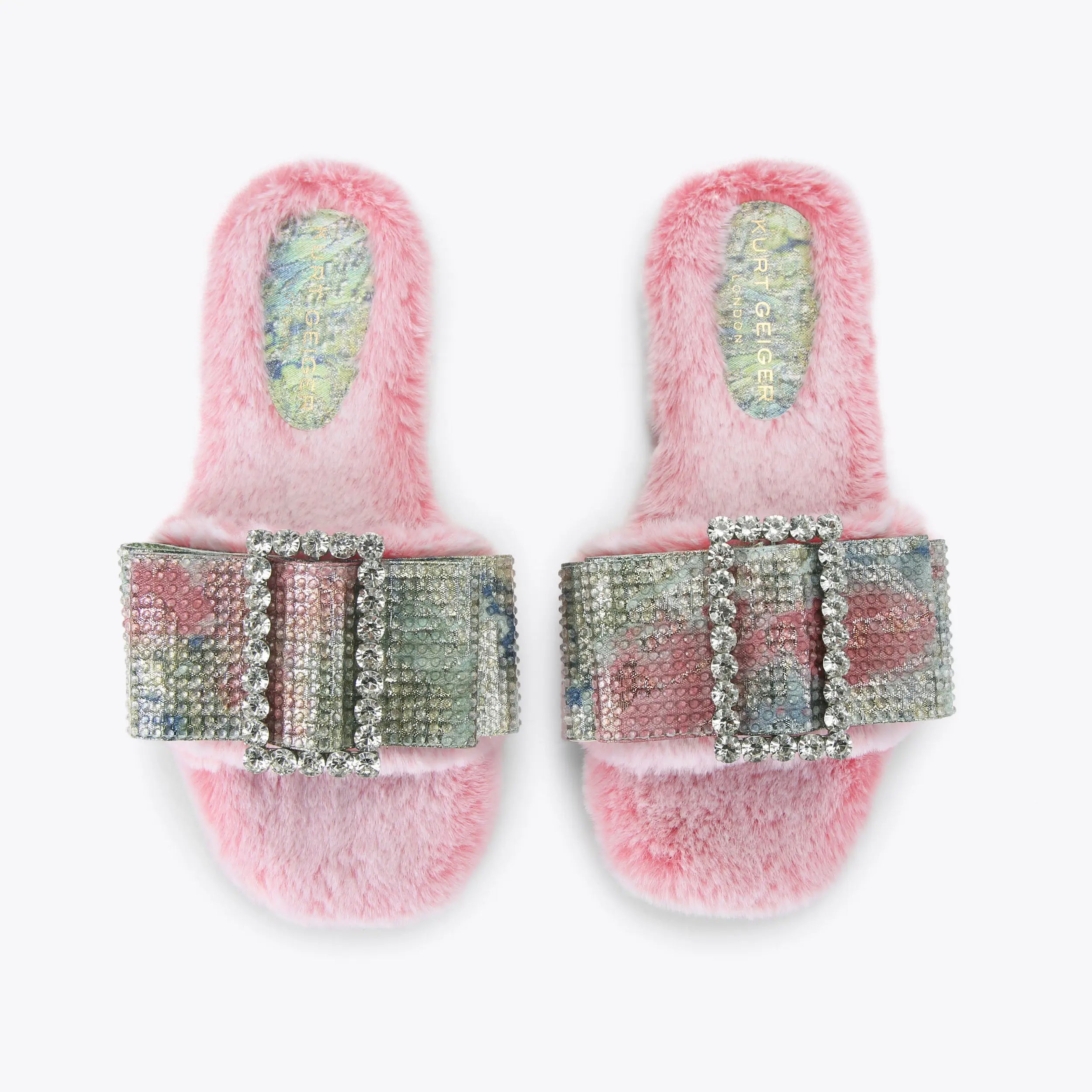 This Cosy Bow Slide on slipper is crafted from a pink fluffy faux fur. There is a statement fabric bow on the front which is embellished with clear crystals and has a large crystal buckle at the centre.