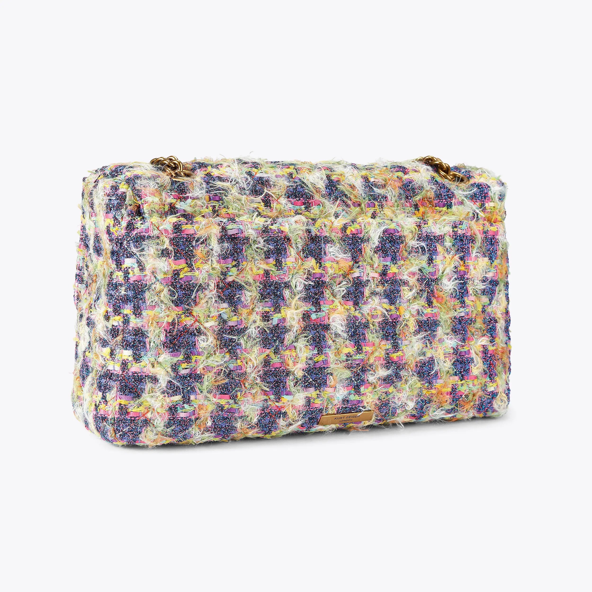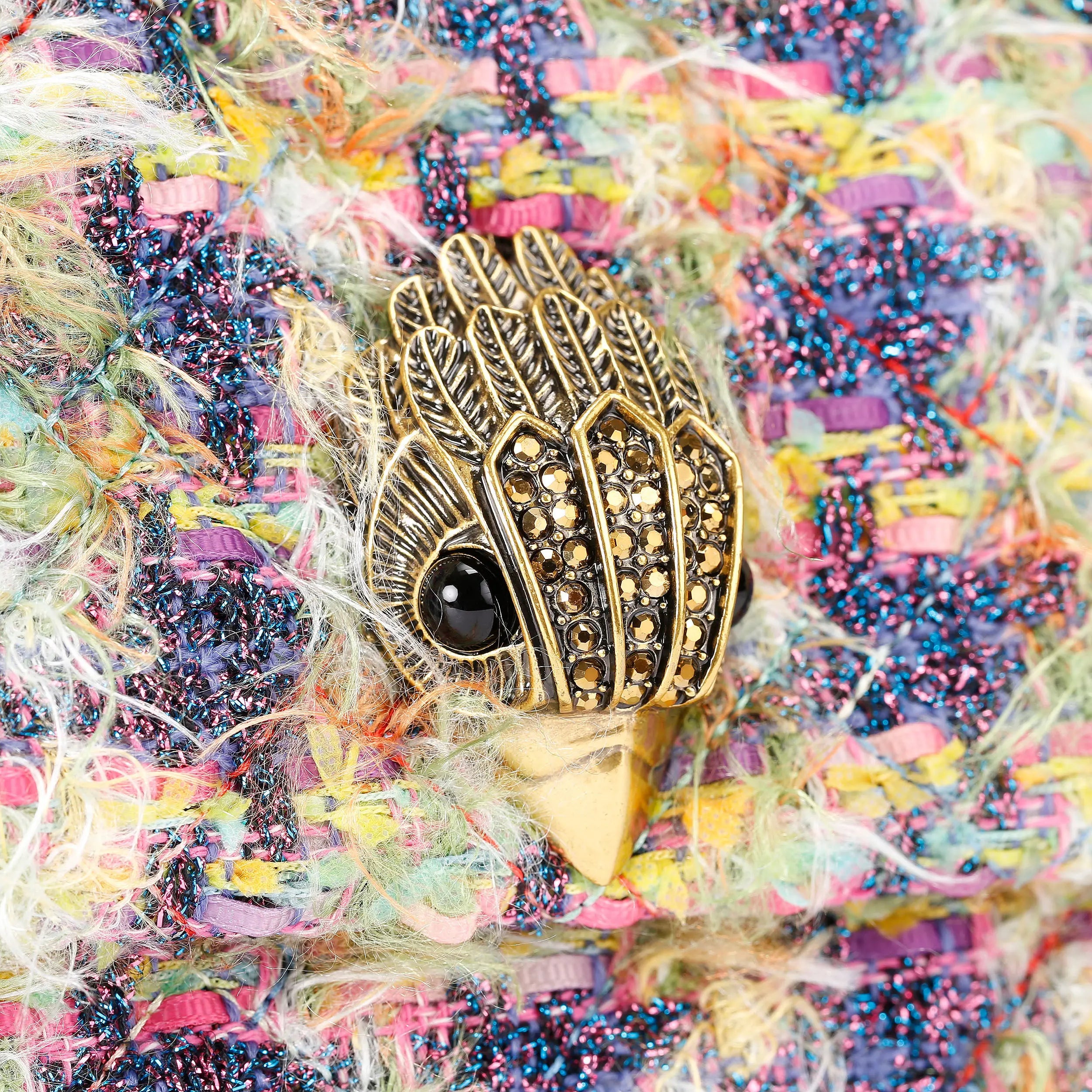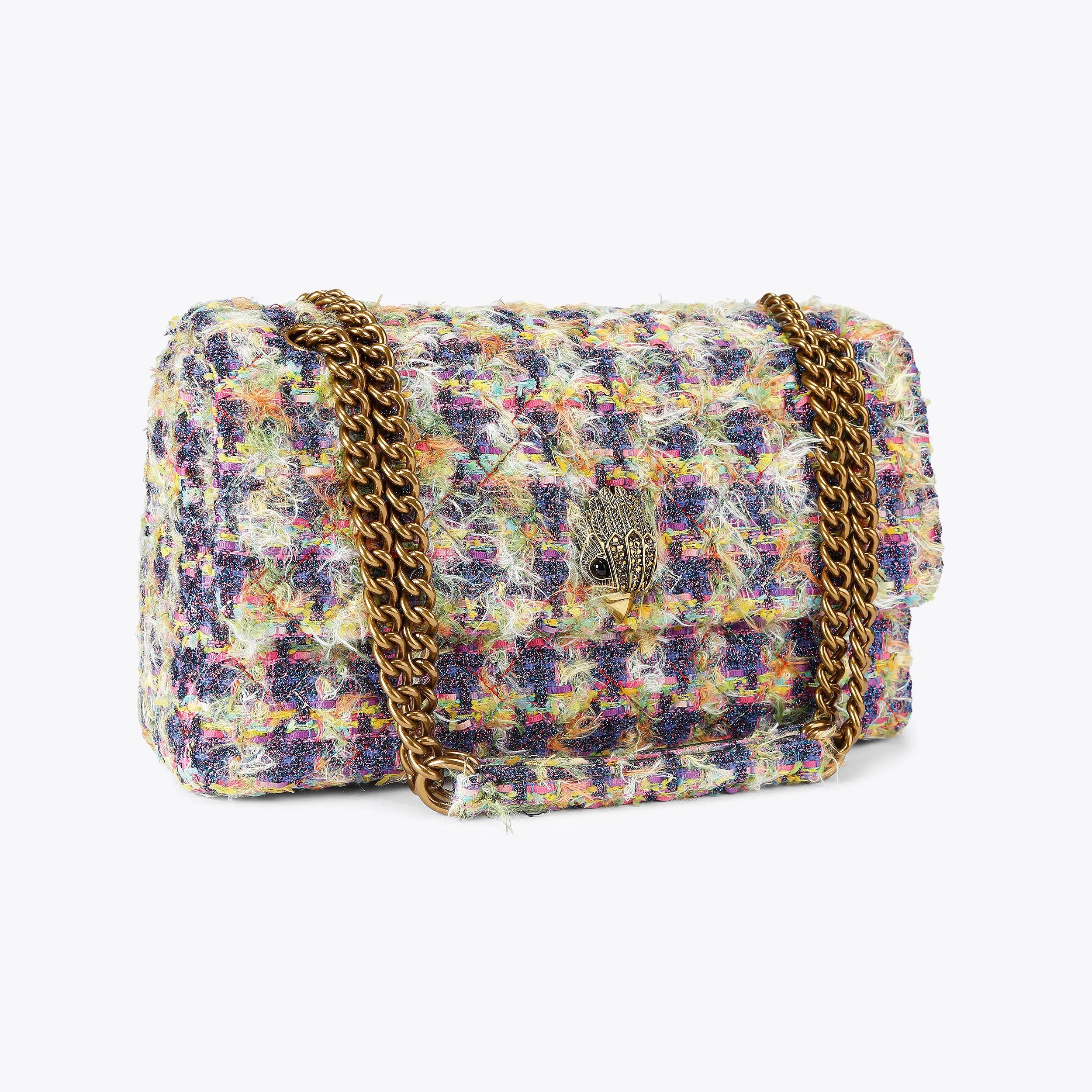 The Extra Large Kensington Purse is crafted from a tweed fabric. Theextra large antiqued brass eagle head features crystals and black bead eyes on the front flap.