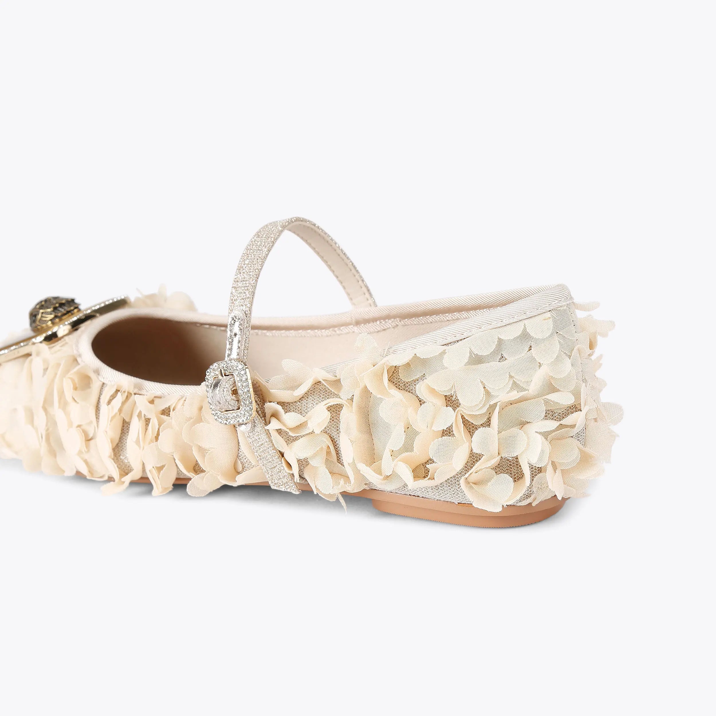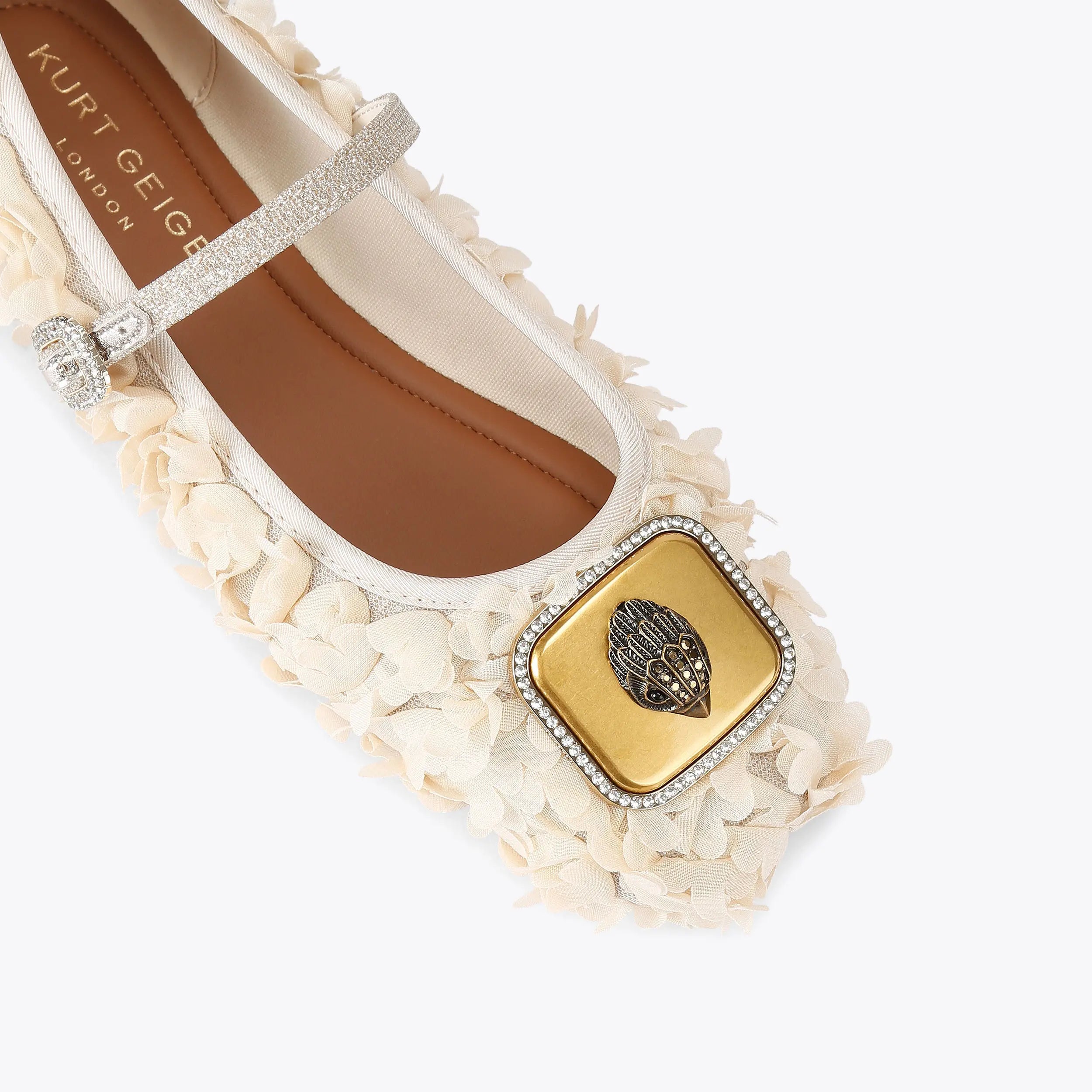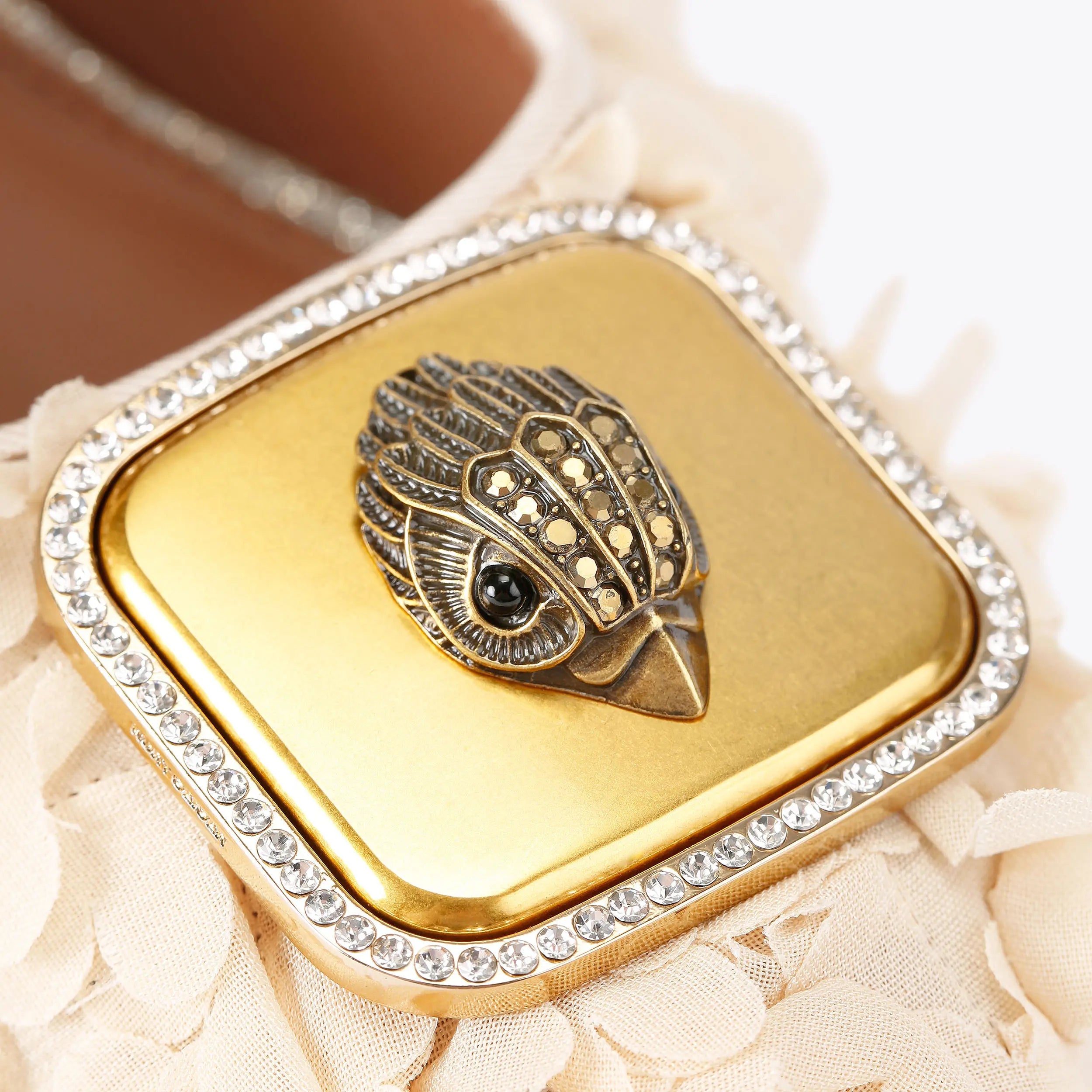 This Pimlico Ballerina is a simple square toe ballet flat with a pale beige upper in floral fabric. There is an antiqued brass square plaque on the toe with antiqued brass eagle head sat on top.