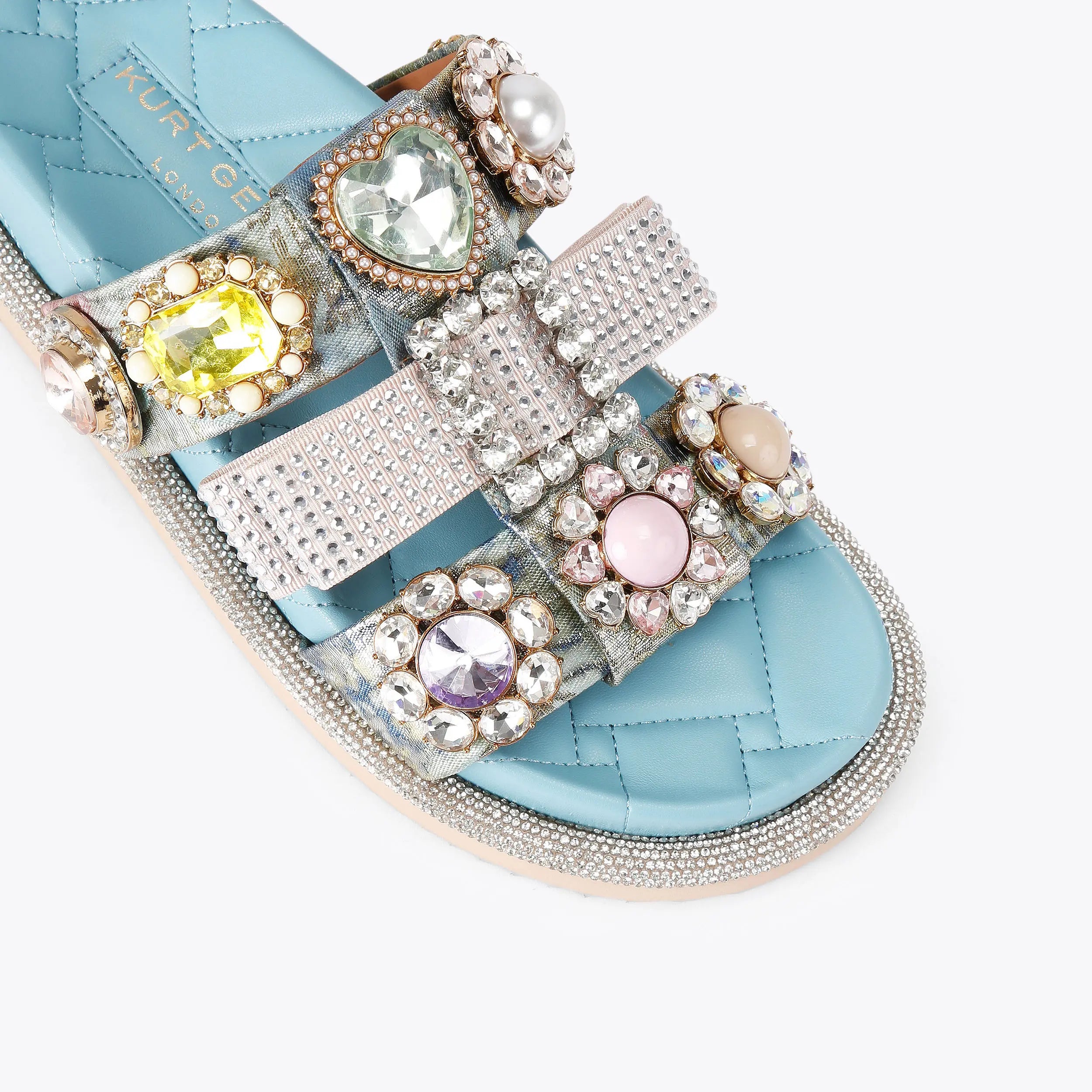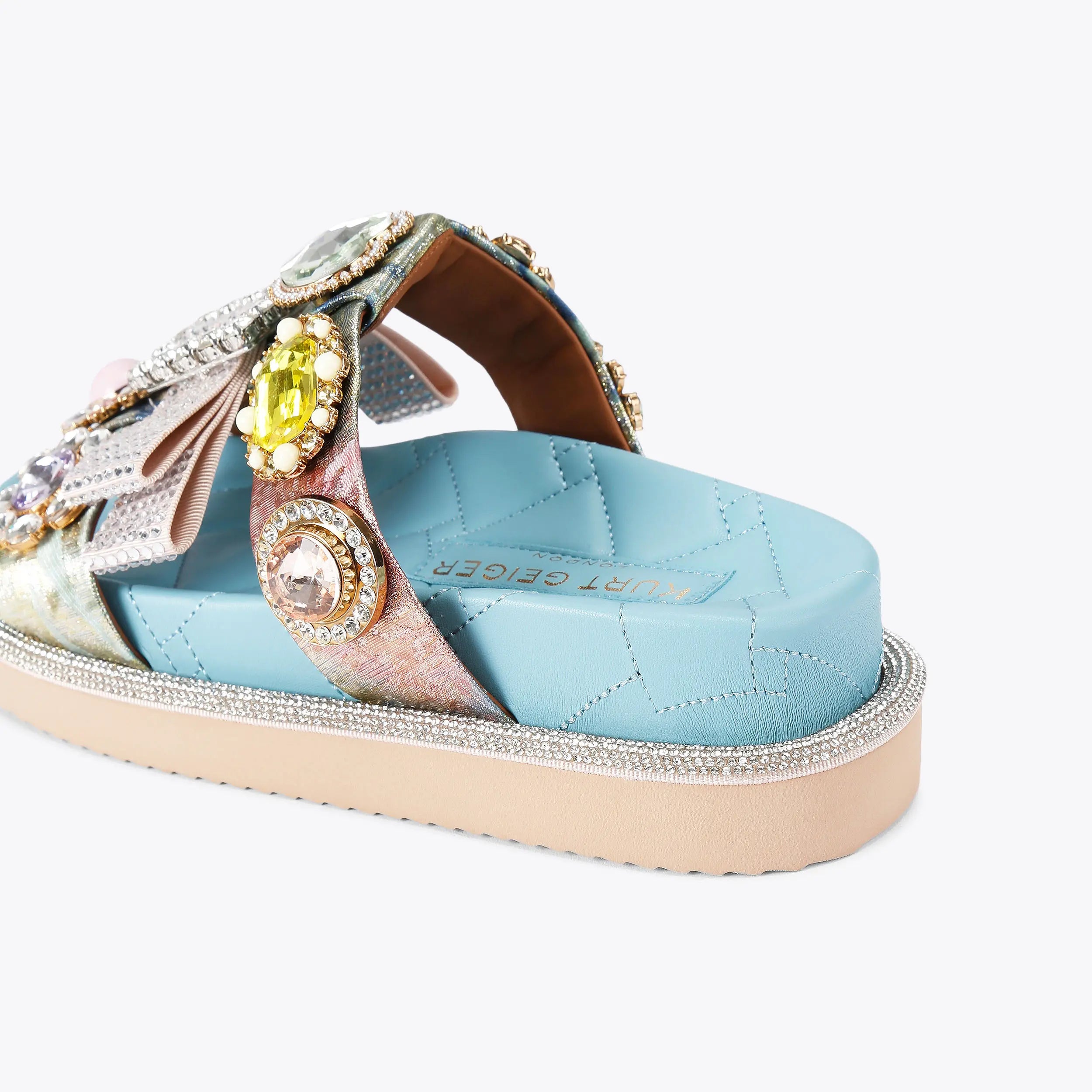 The Orson Crystal Sandal arrives in an iridescent fabric which is embellished with large crystals. The strap is topped with oversized pastel stones and crystals.