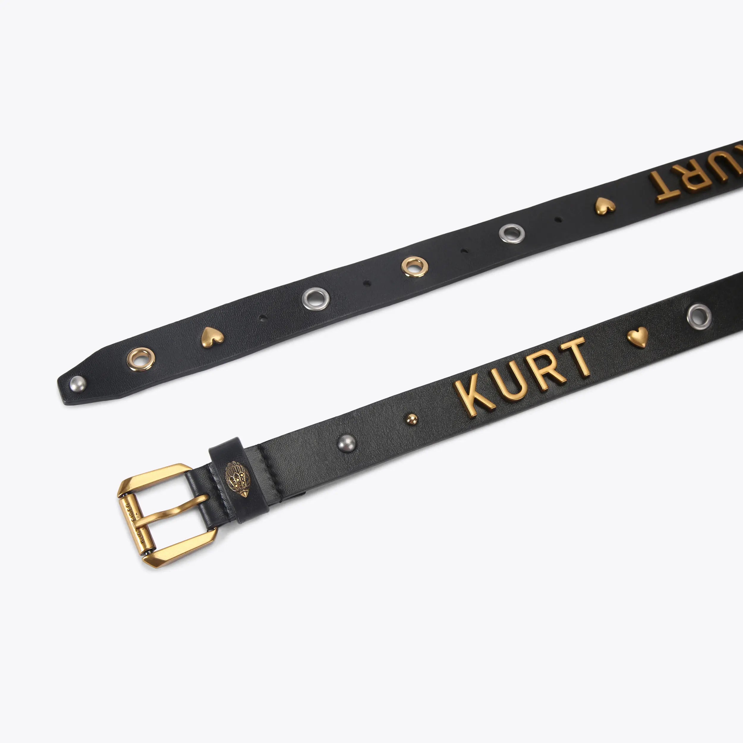 This Kurt Belt arrives in a black leather with antiqued brass KURT branding and studs across the outer side. There is an antiqued brass buckle and eagle head on the loop.