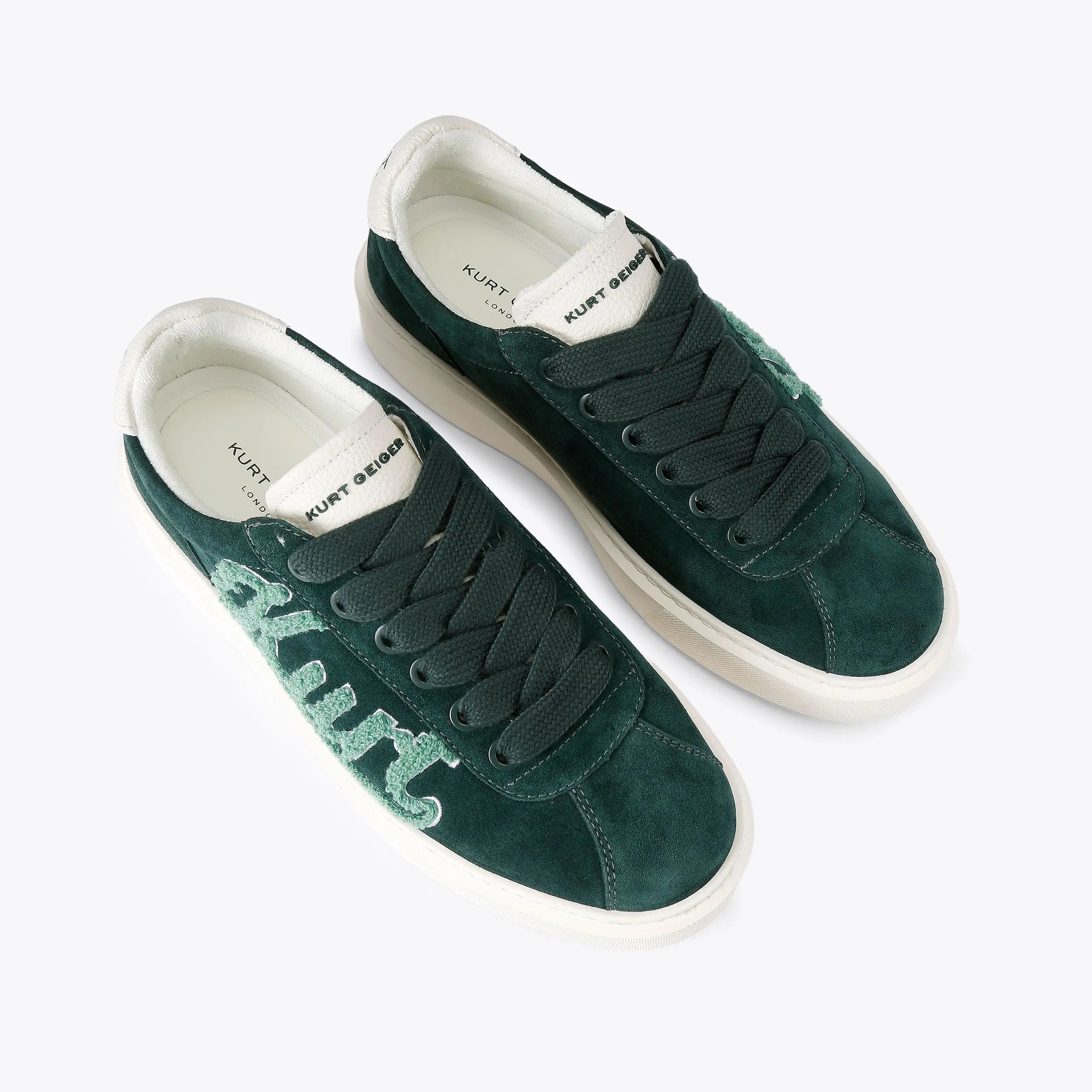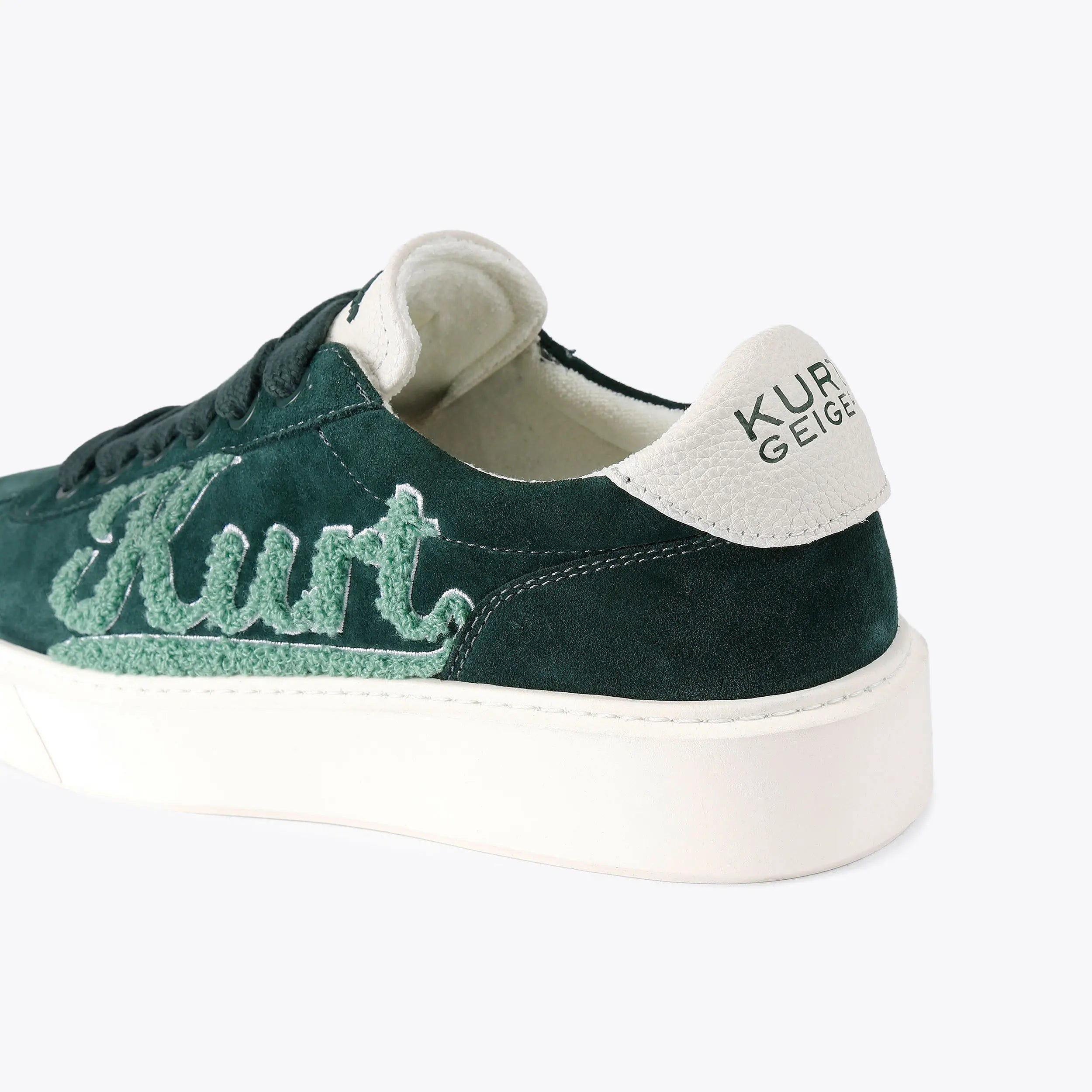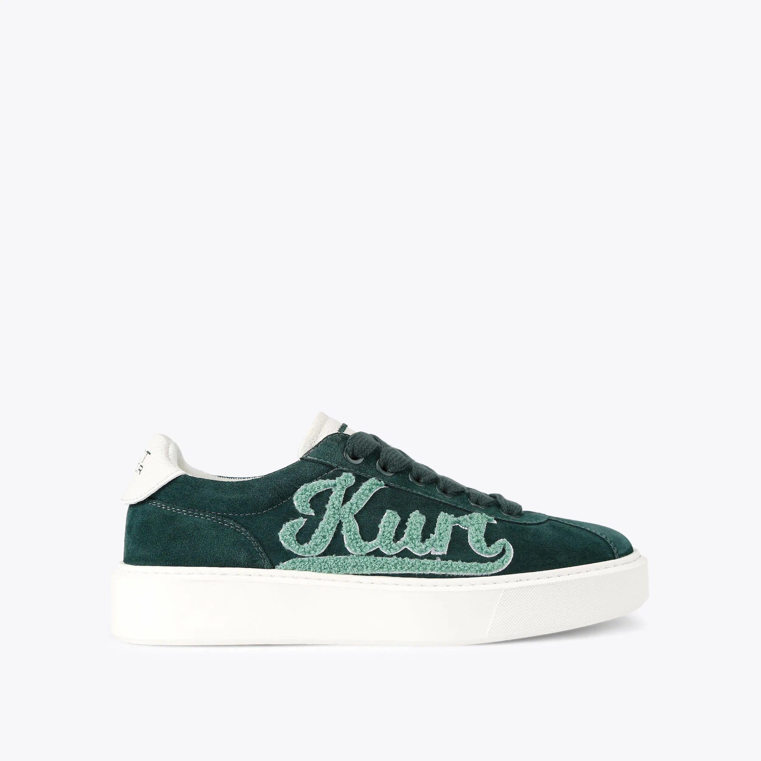 This Albion Retro is a dark green suede leather sneaker. The front laces up with wide fabric laces and there is light green tufted 'Kurt' branding on the outer side panel.
