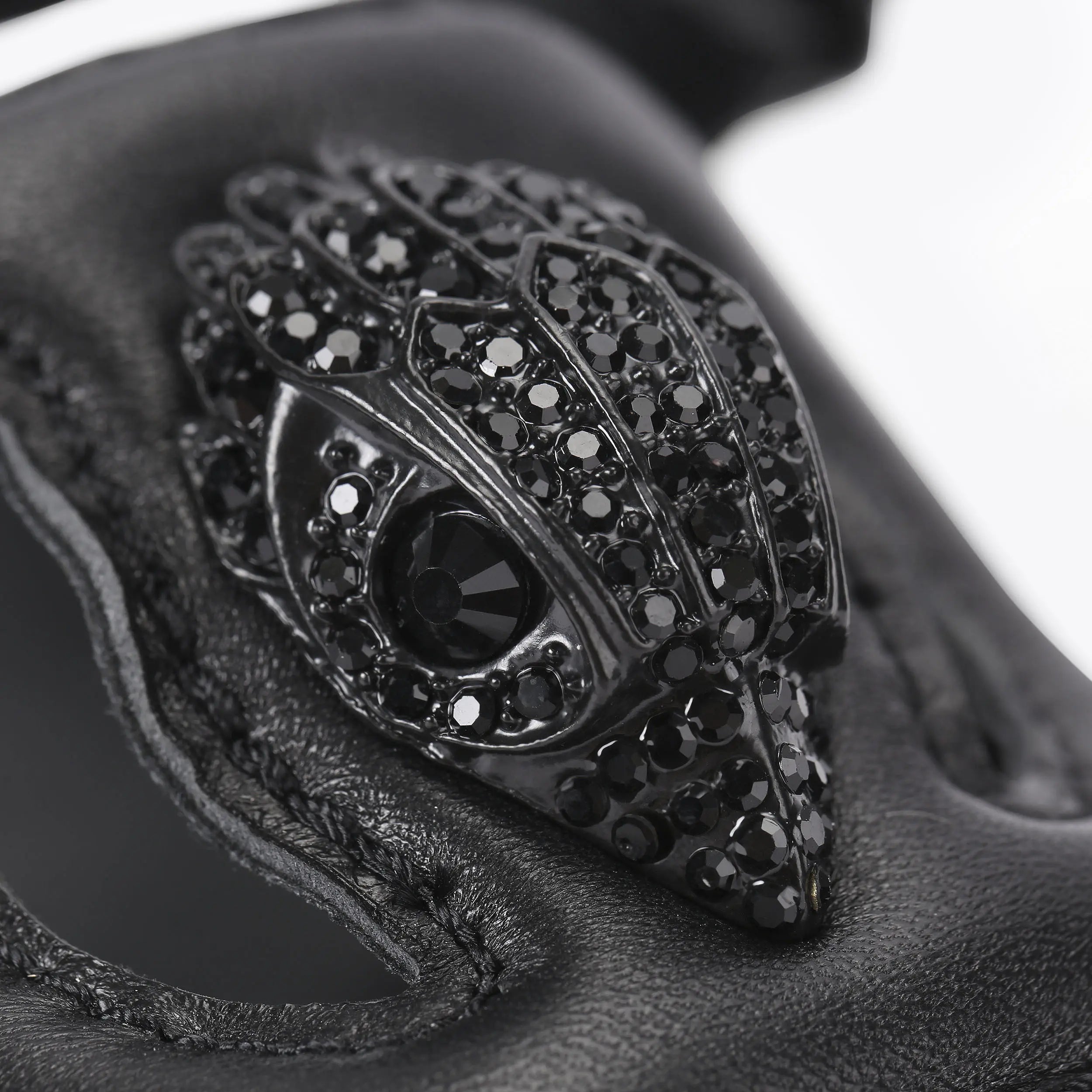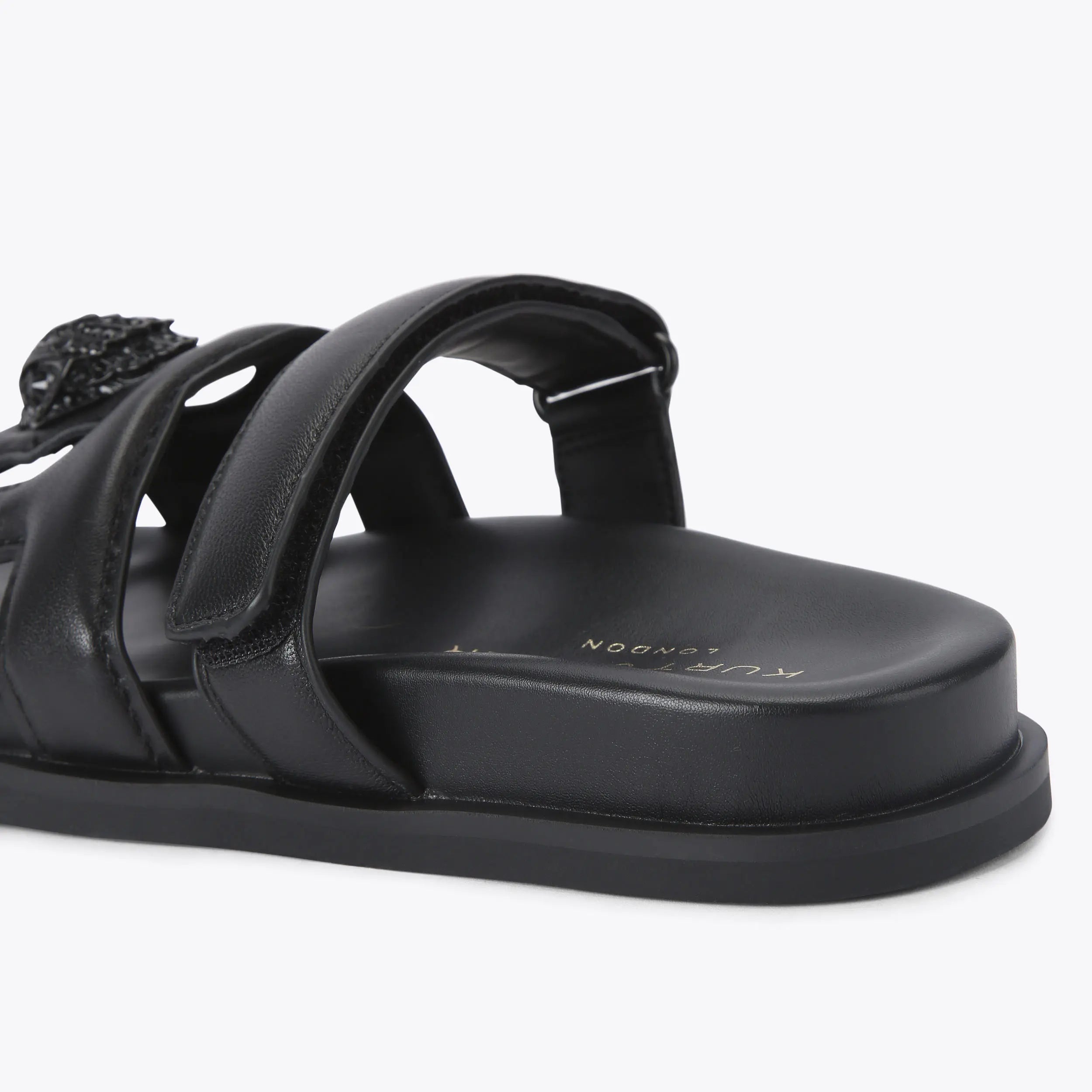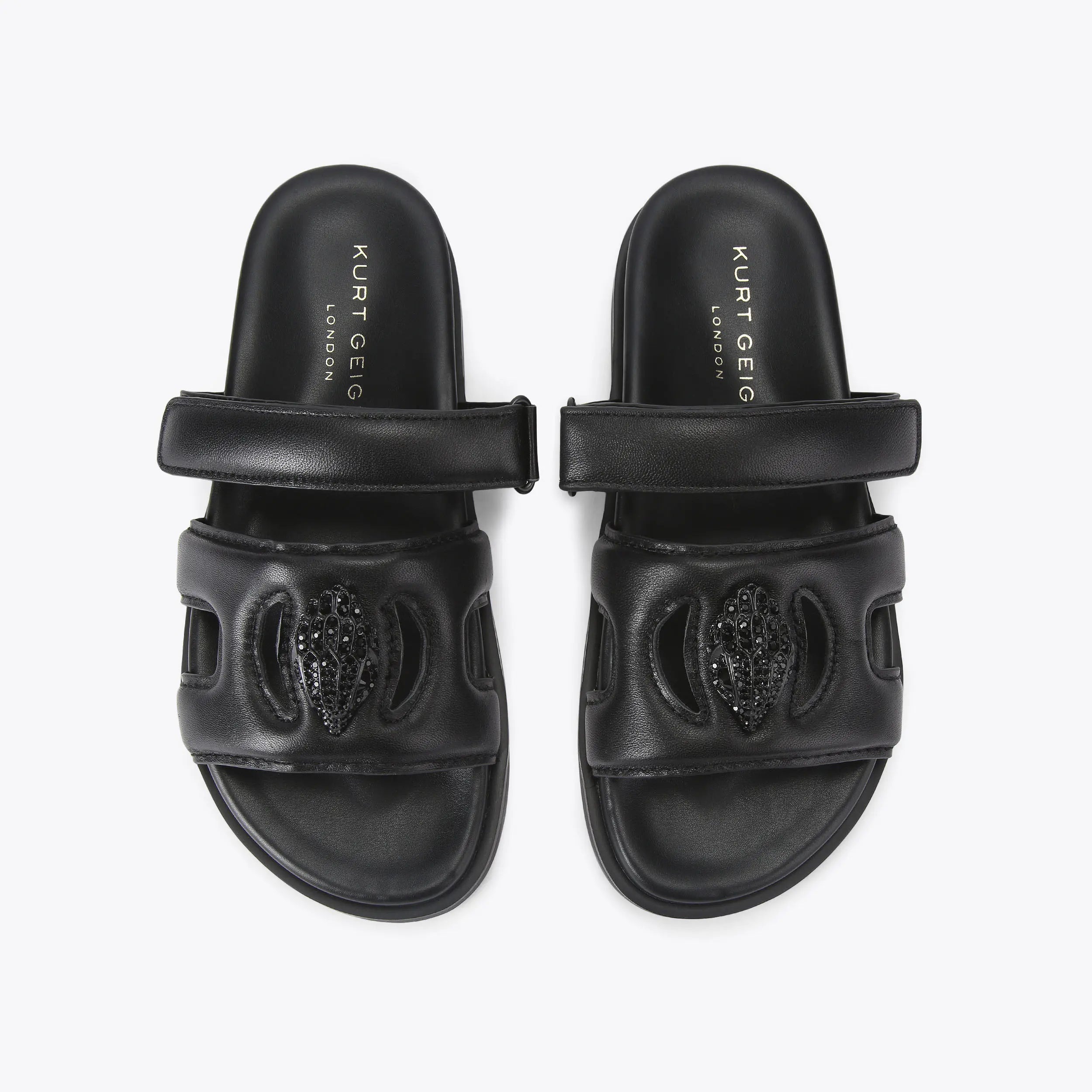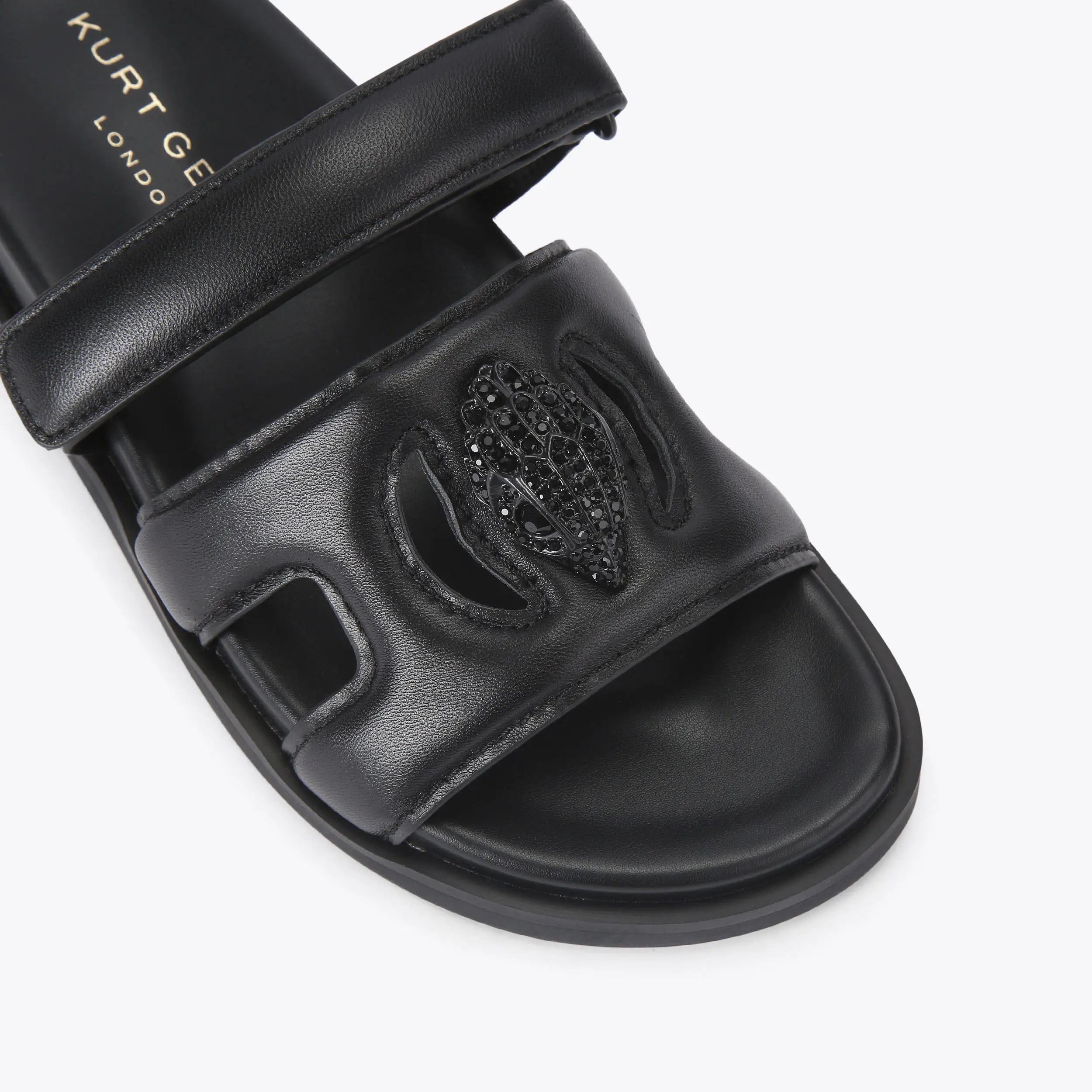 This Eagle Drench Cut Out Sandal is crafted from a black leather. There is a thinner velcro strap across the foot as well as a wide strap across the toe. There is a black crystal embellished eagle head sat on the strap.