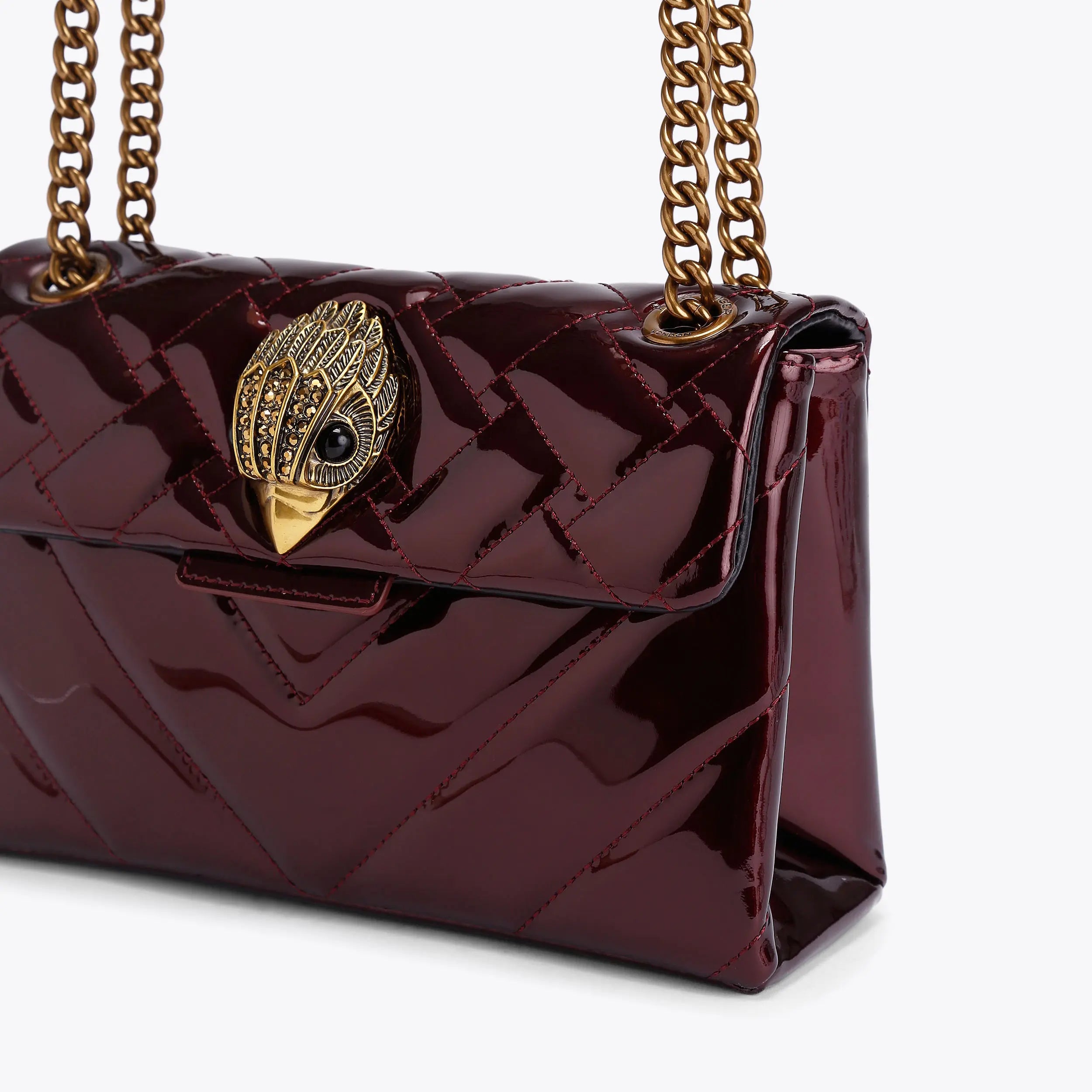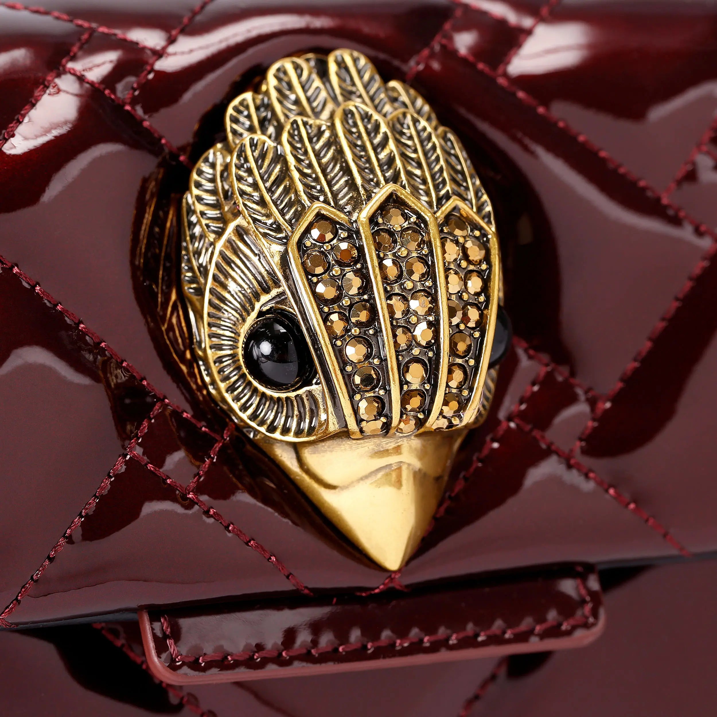 This Medium Kensington bag is crafted from a wine patent leather with overstitch quilting in both a weave and chevron design across the front. There is a large antiqued brass eagle head sat on the front flap.