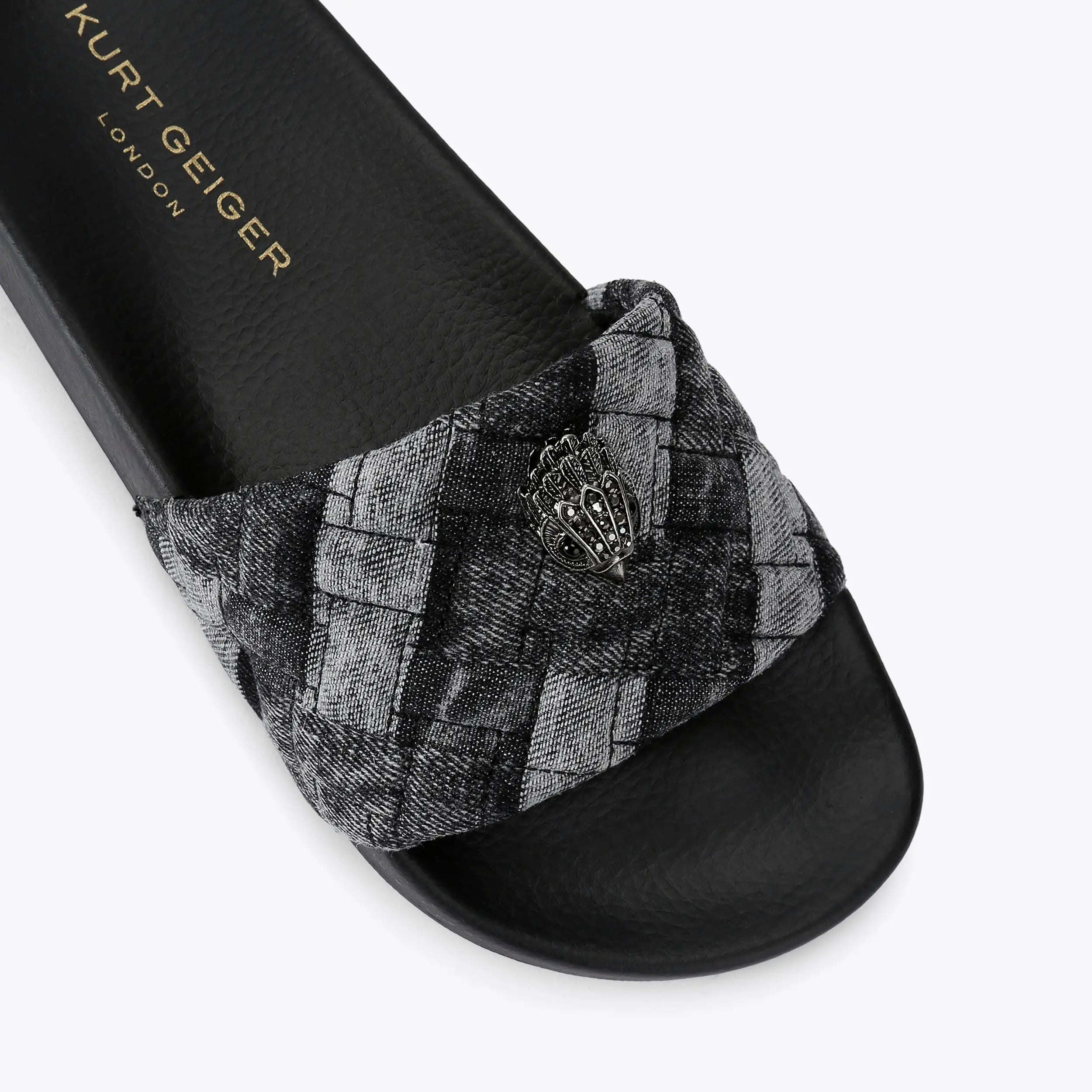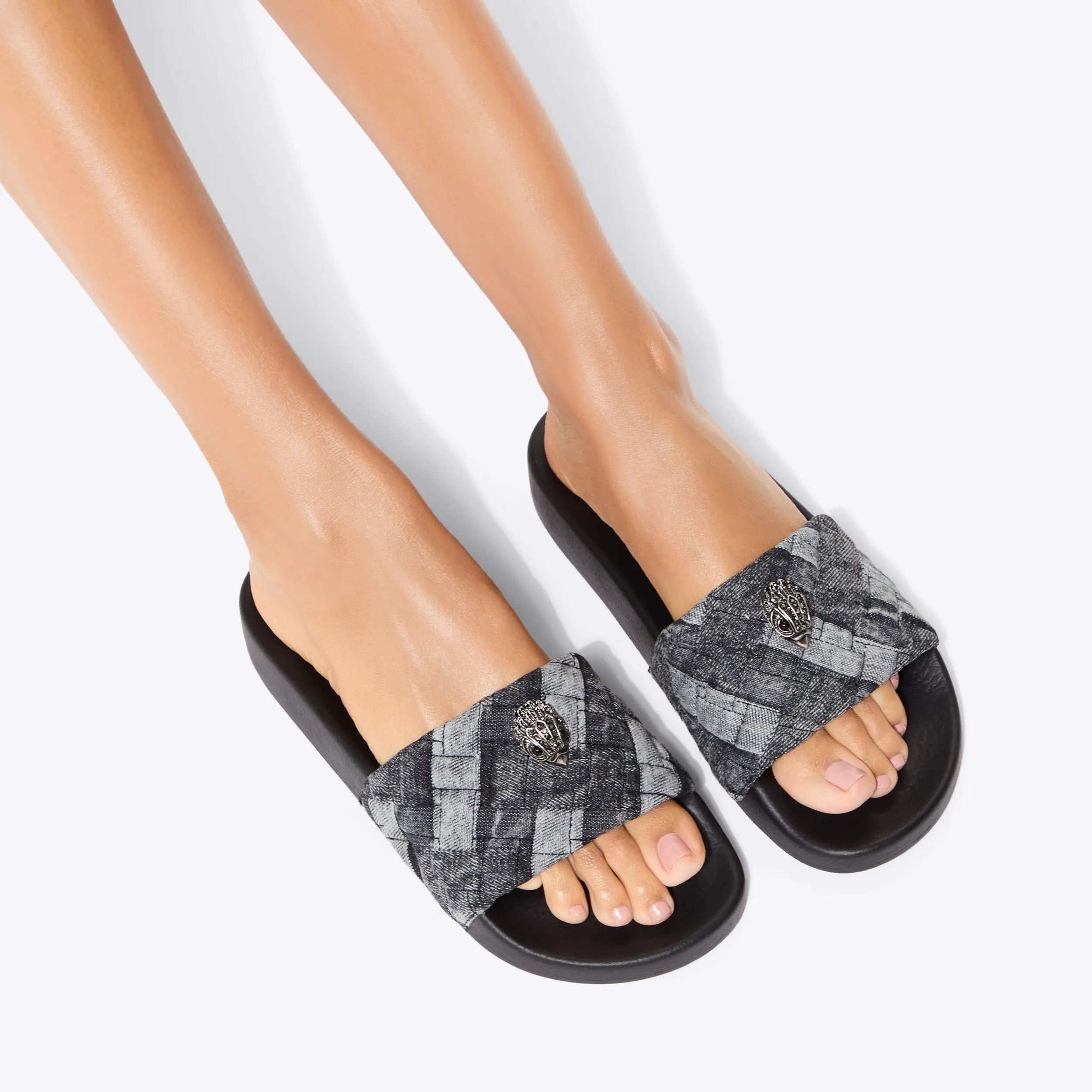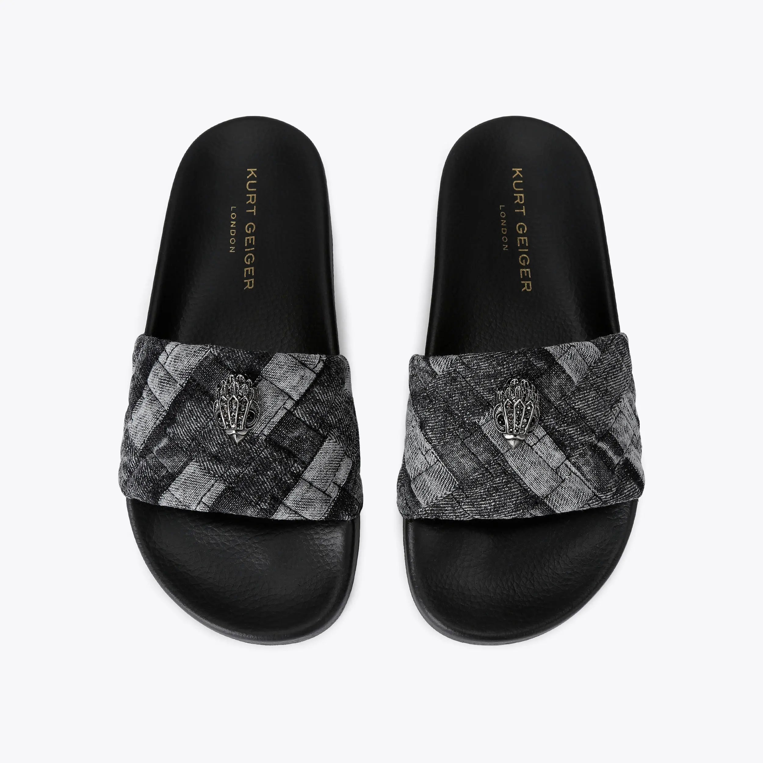 The Meena Eagle sandal arrives in a black slide on style. The strap features a bleached weave effect and black eagle head on the top.