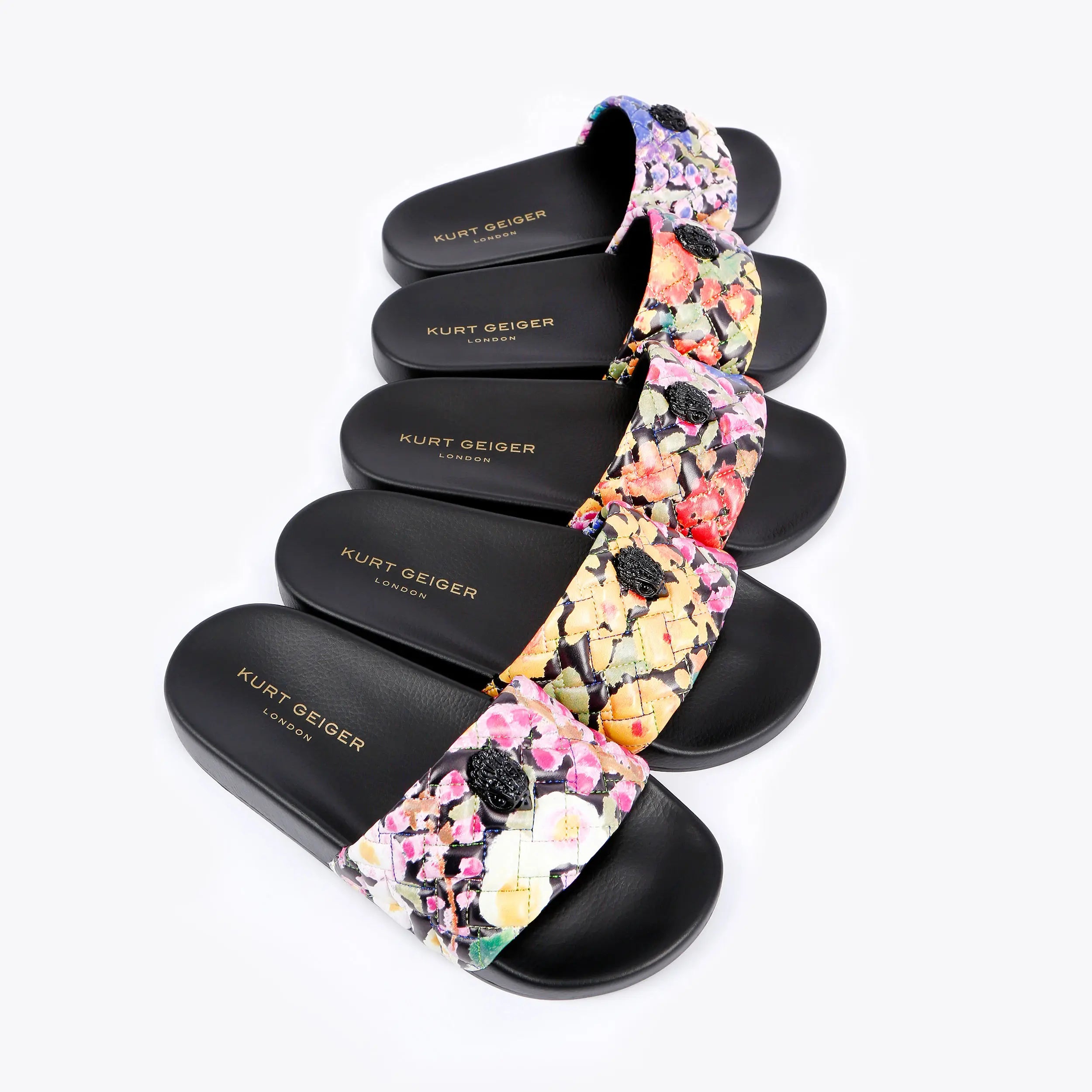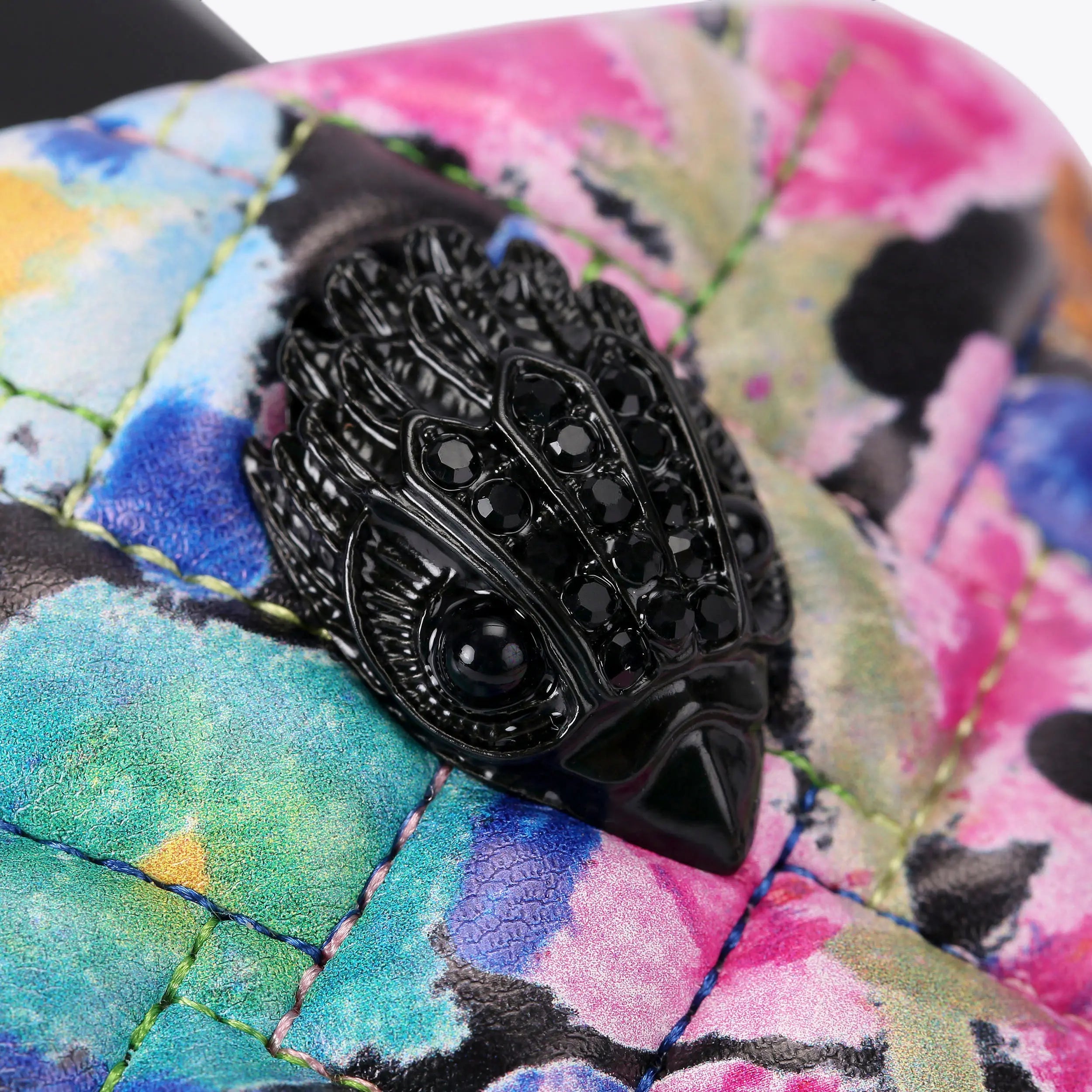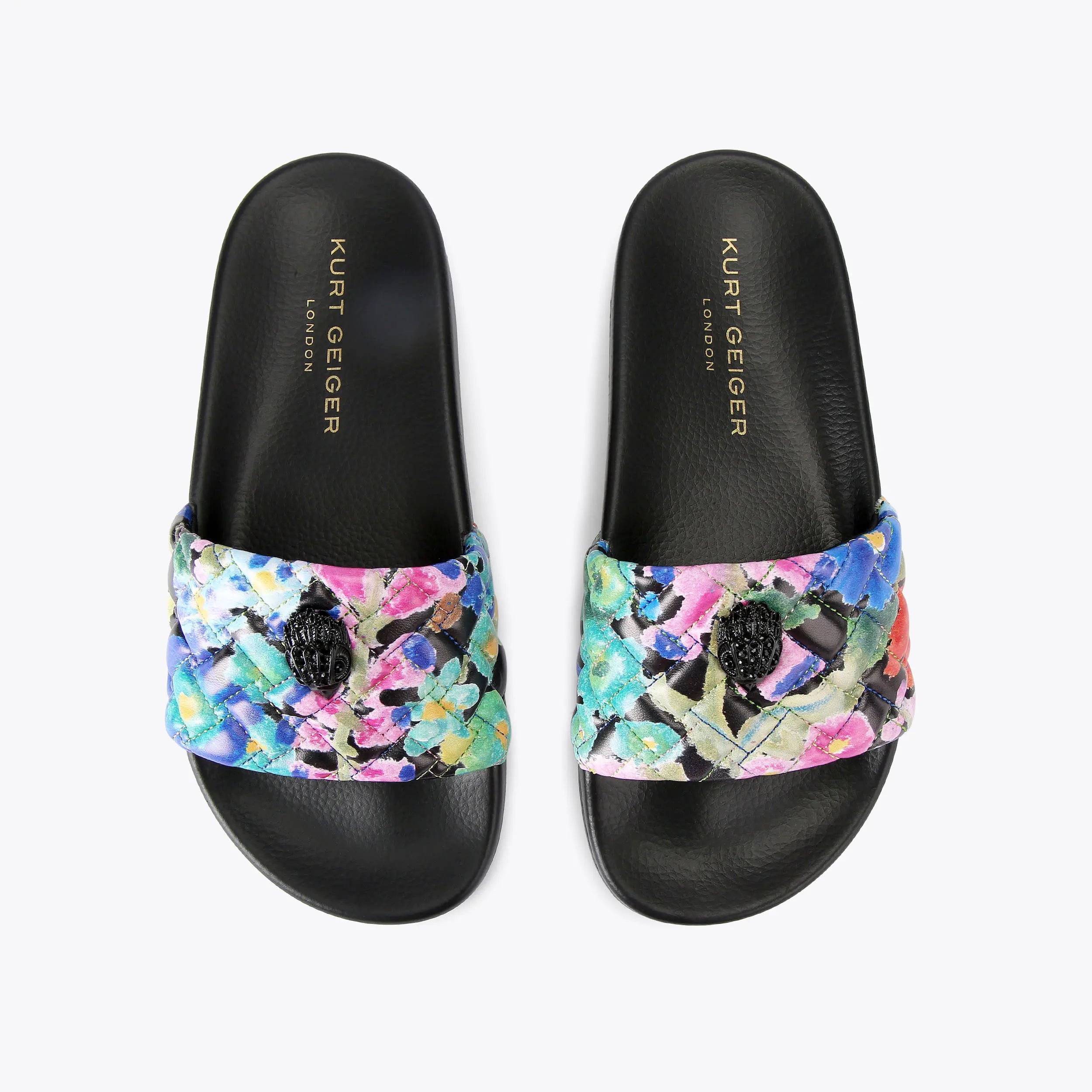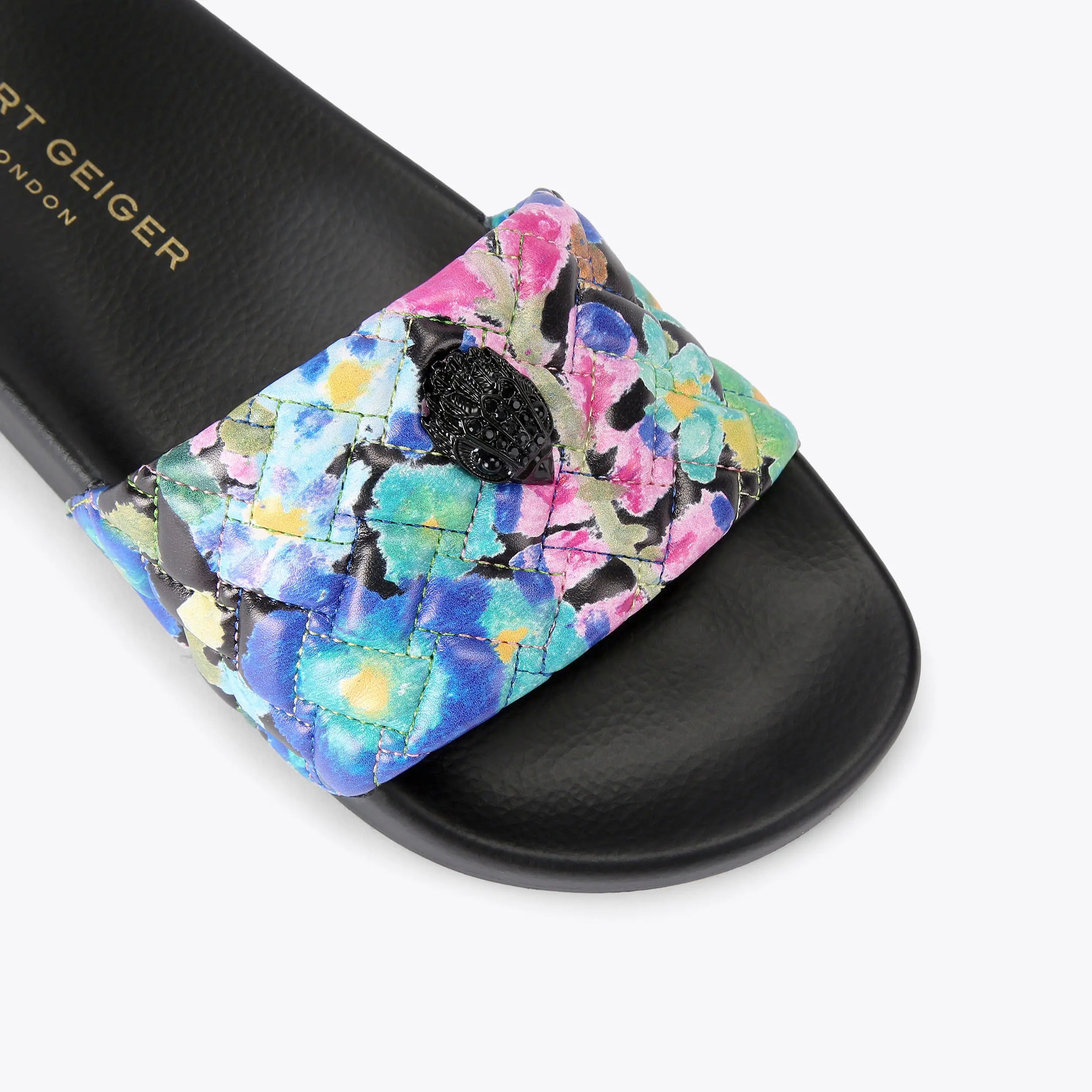 This Meena Eagle sandal slips onto the foot with a black moulded footbed. The toe strap is designed in a blue floral printed leather with overstitch quilting. There is an antiqued brass eagle head sat on top.