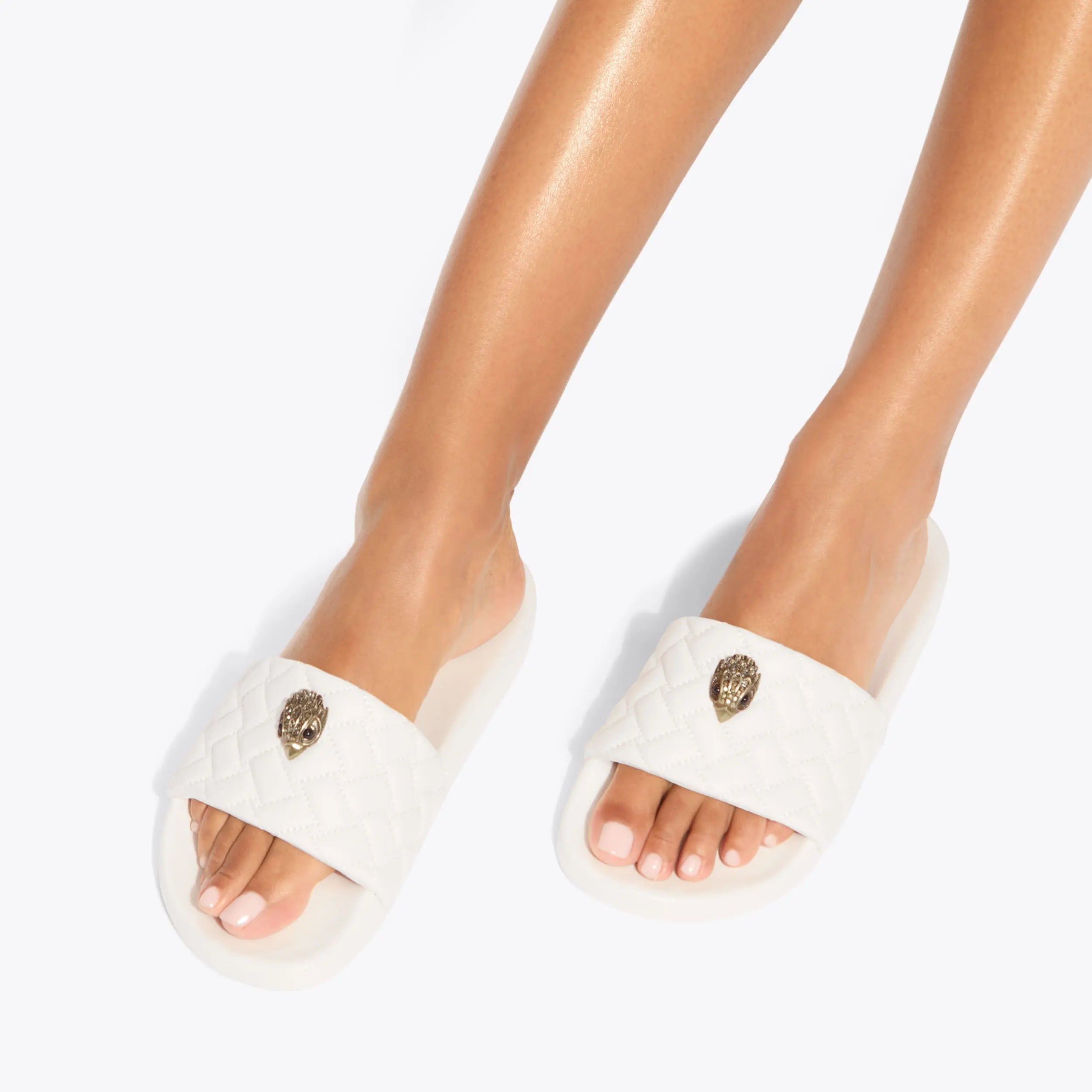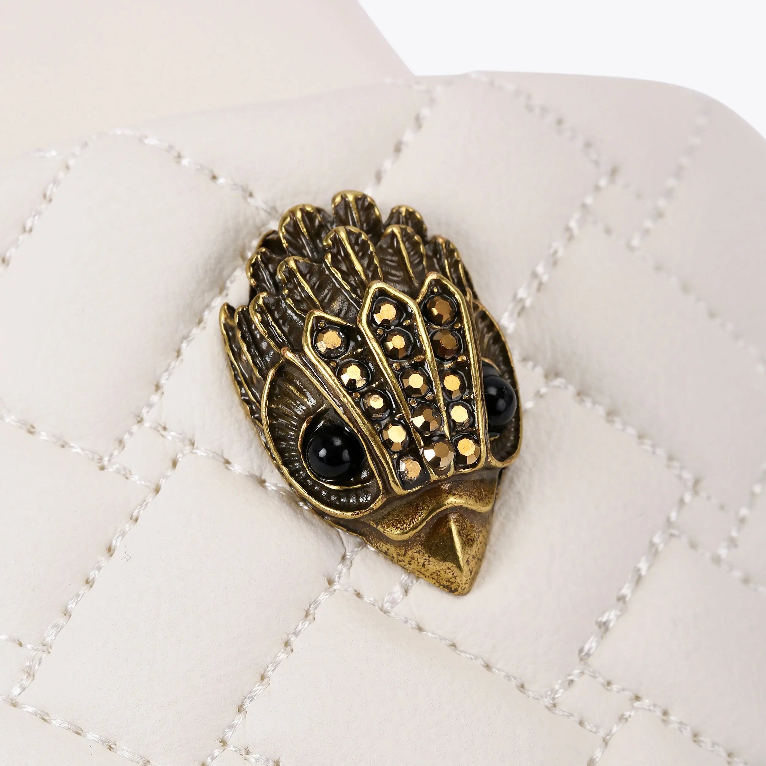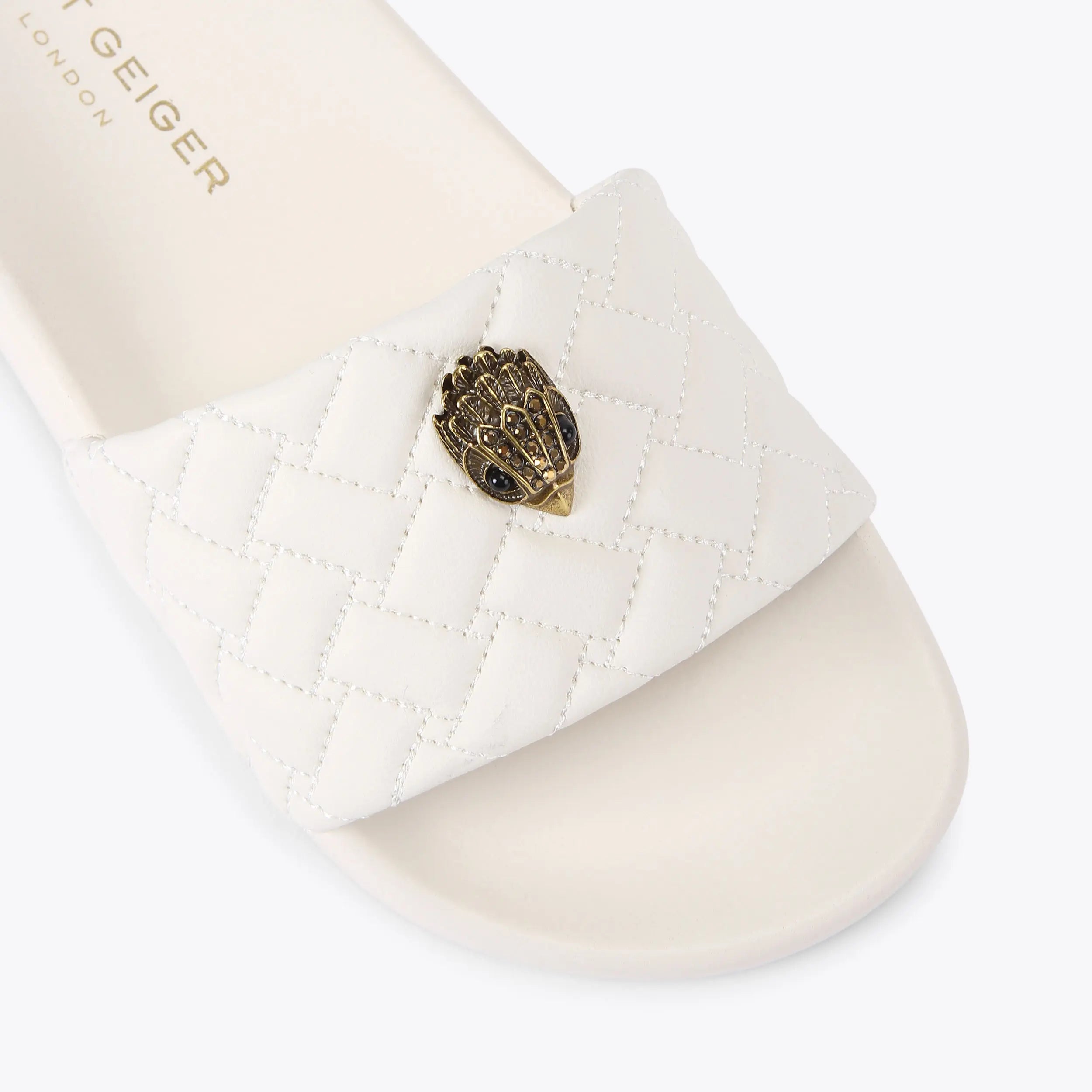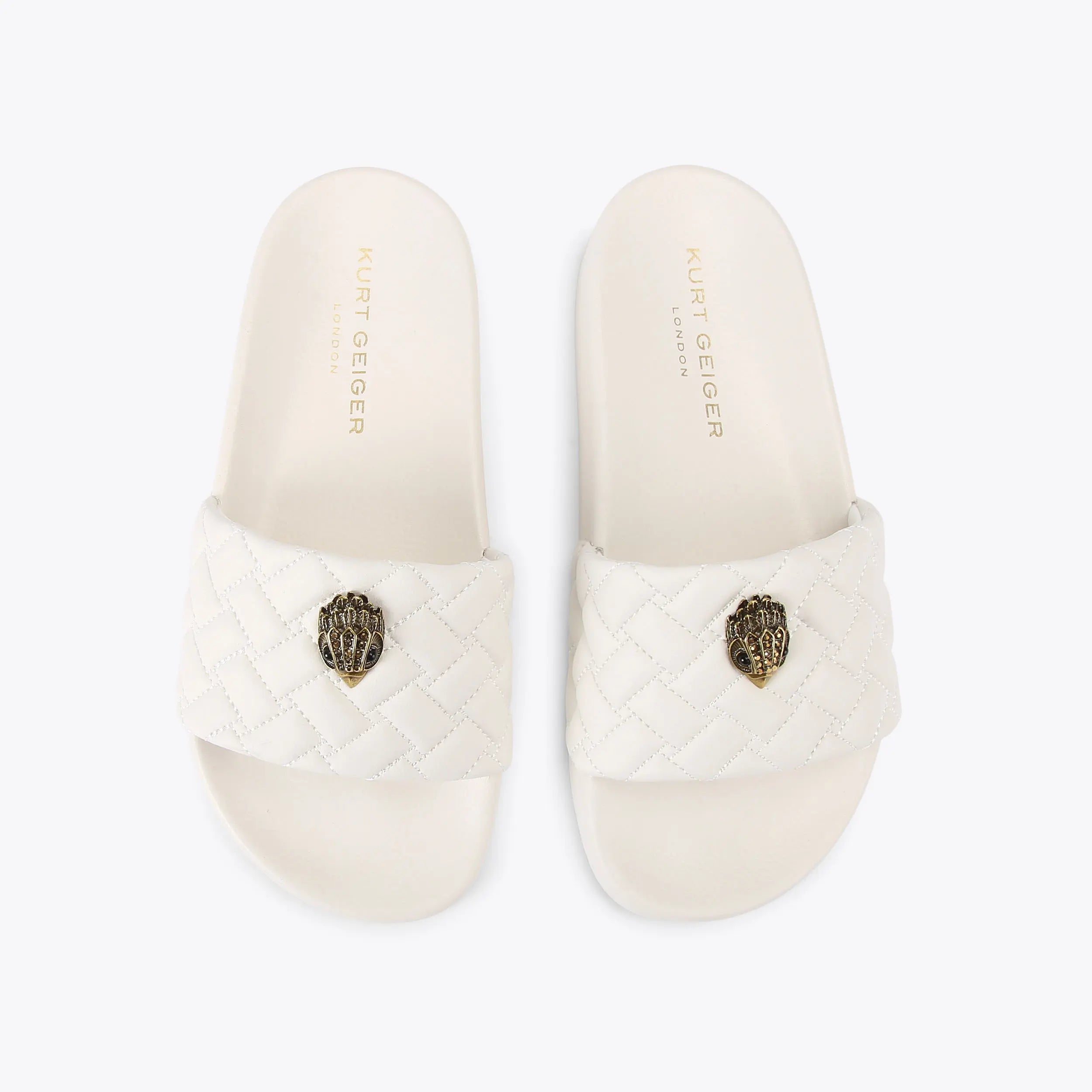 The Meena Eagle sandal arrives in a white slide on style. The strap is quilted and topped with antiqued brass eagle head.
