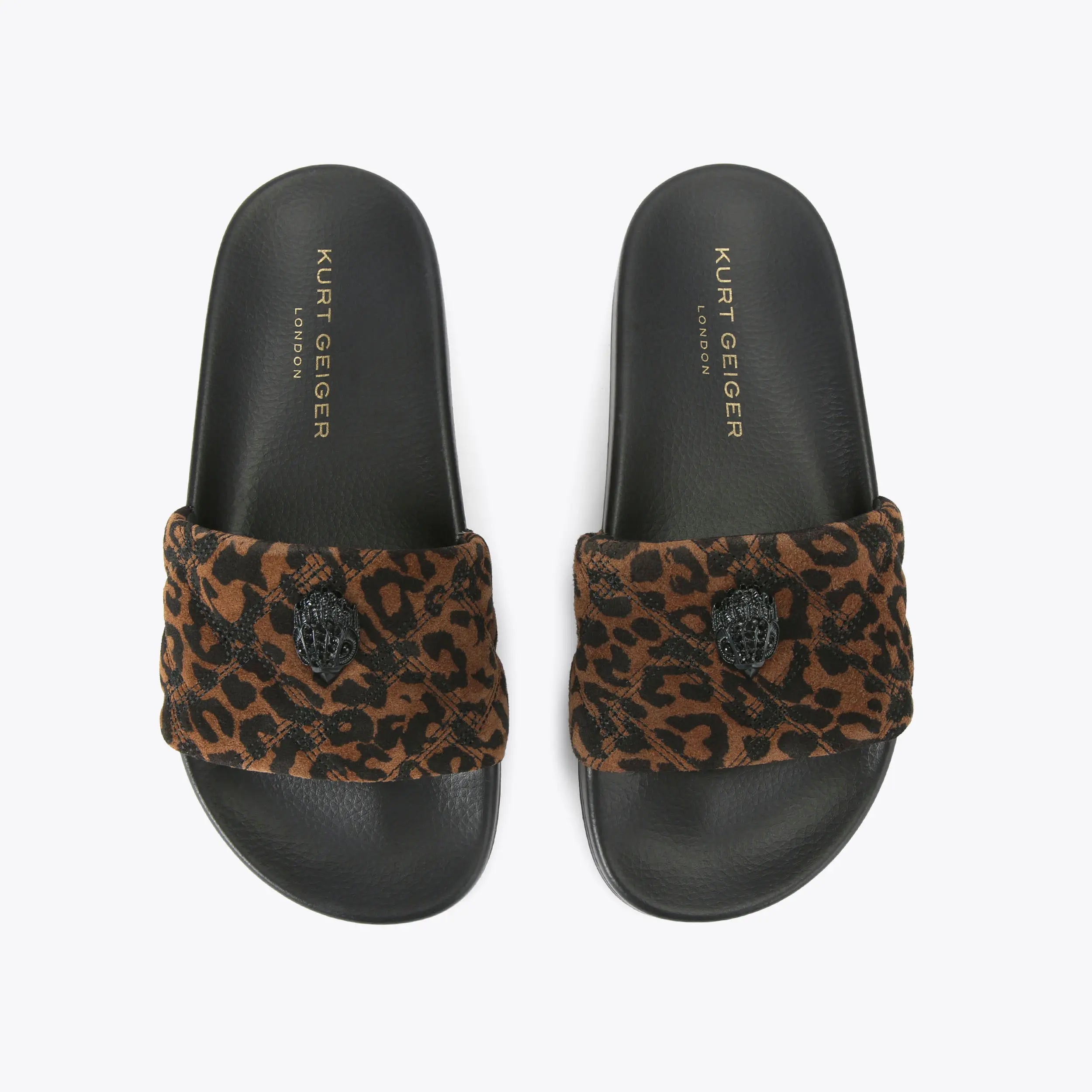The Meena Eagle sandal arrives in a leopard printed suede slide on style. The strap features a black metal eagle head with crystals on the top.