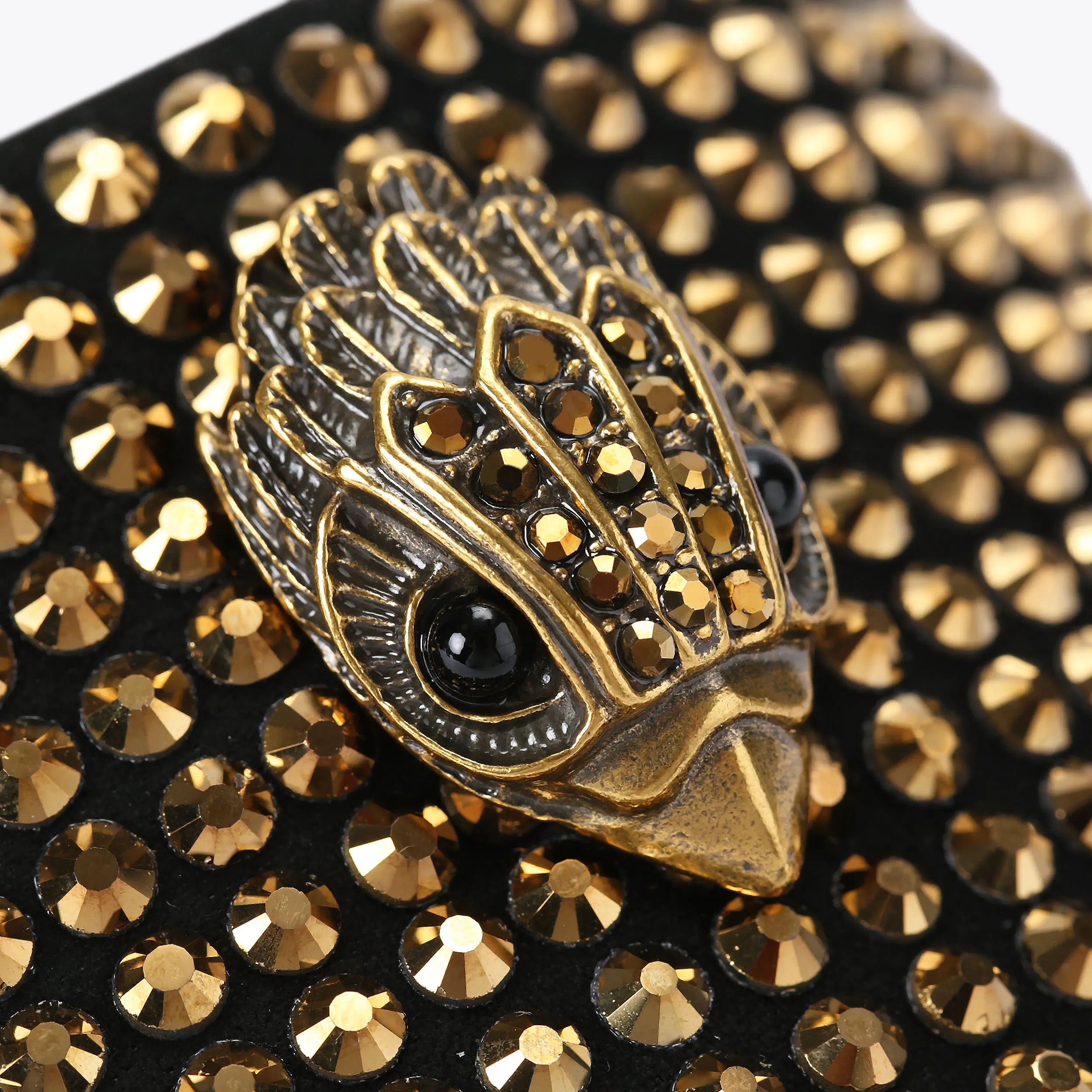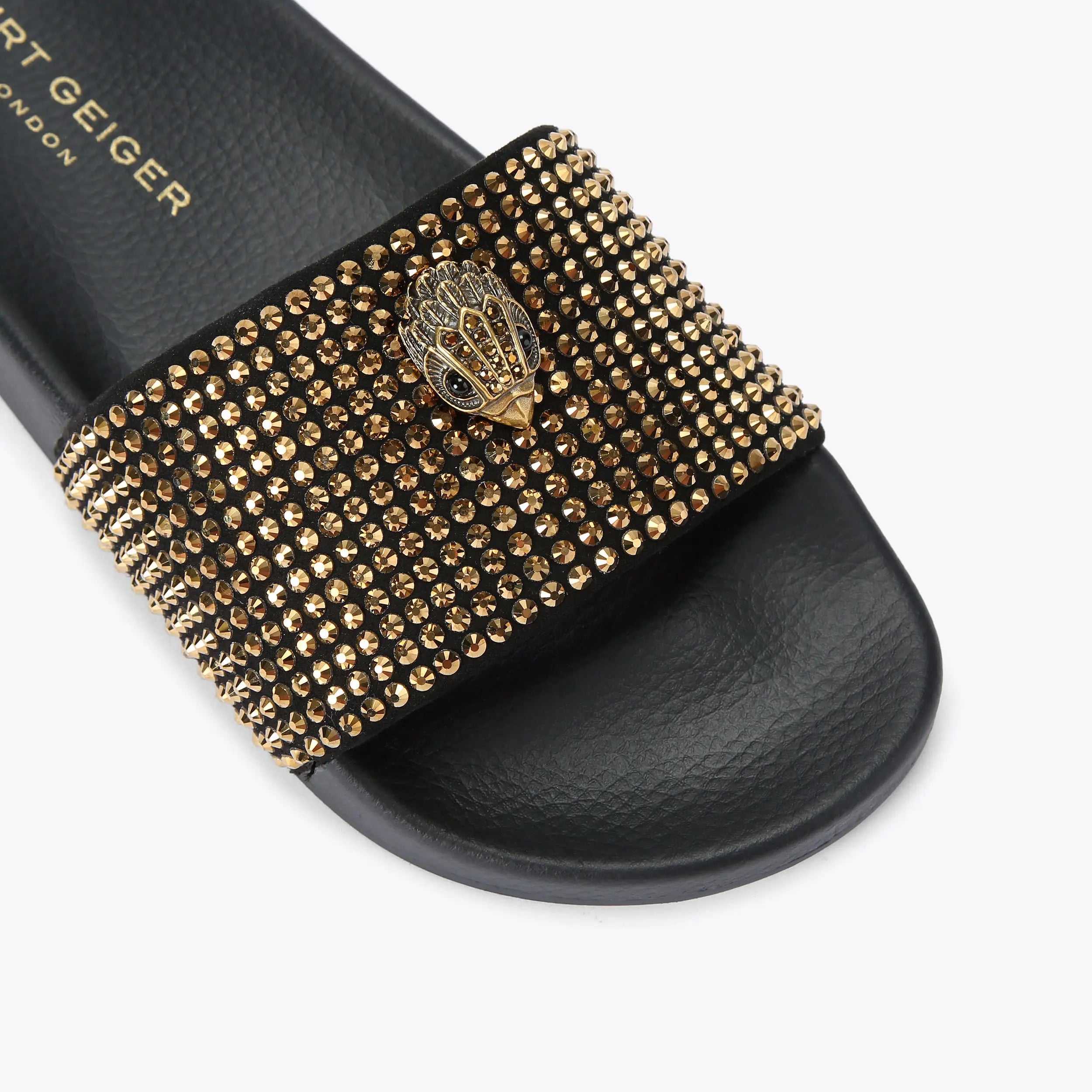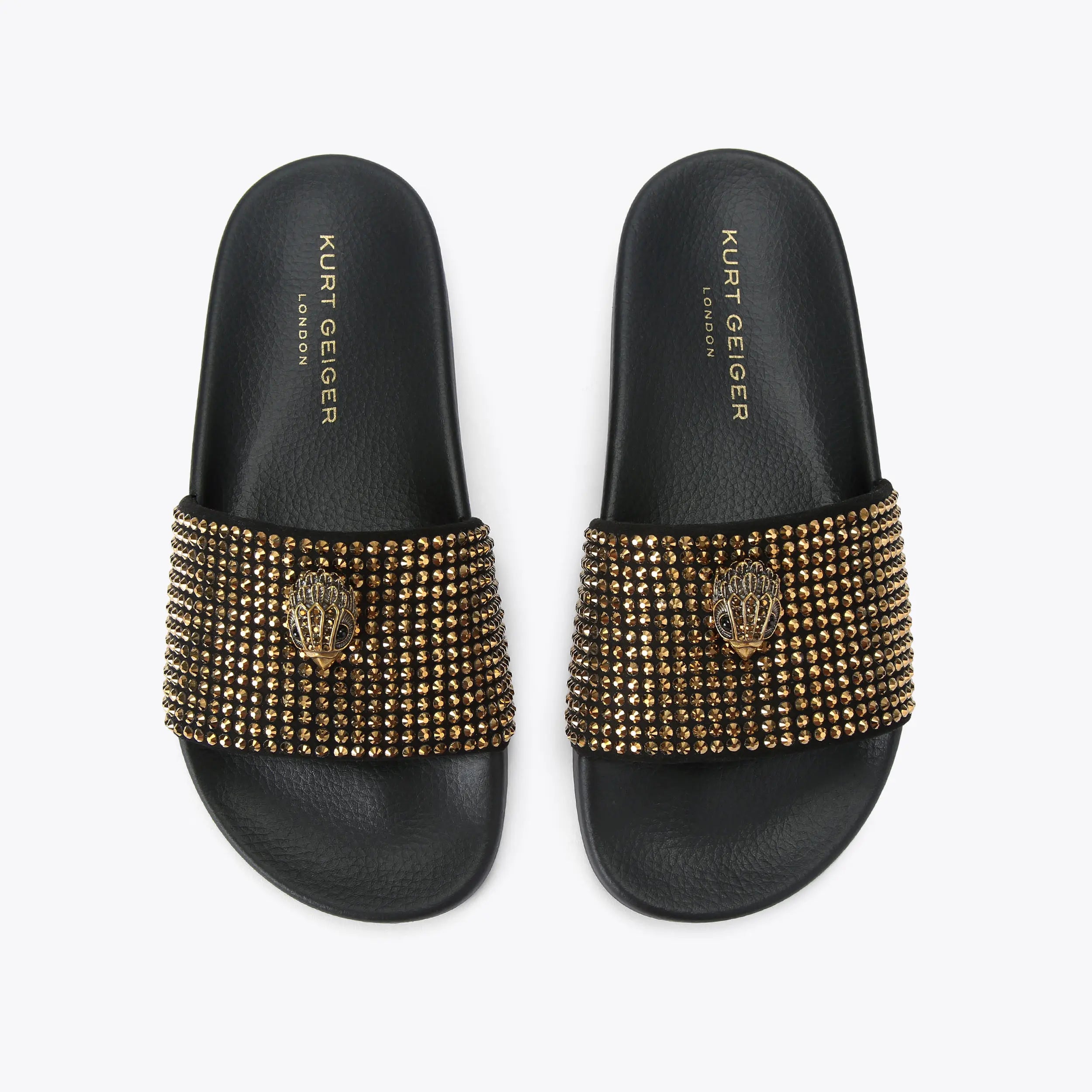 This Meena Eagle is a slide on sandal with gold crystal embellished toe strap. There is an antiqued brass eagle head sat on top of the strap.