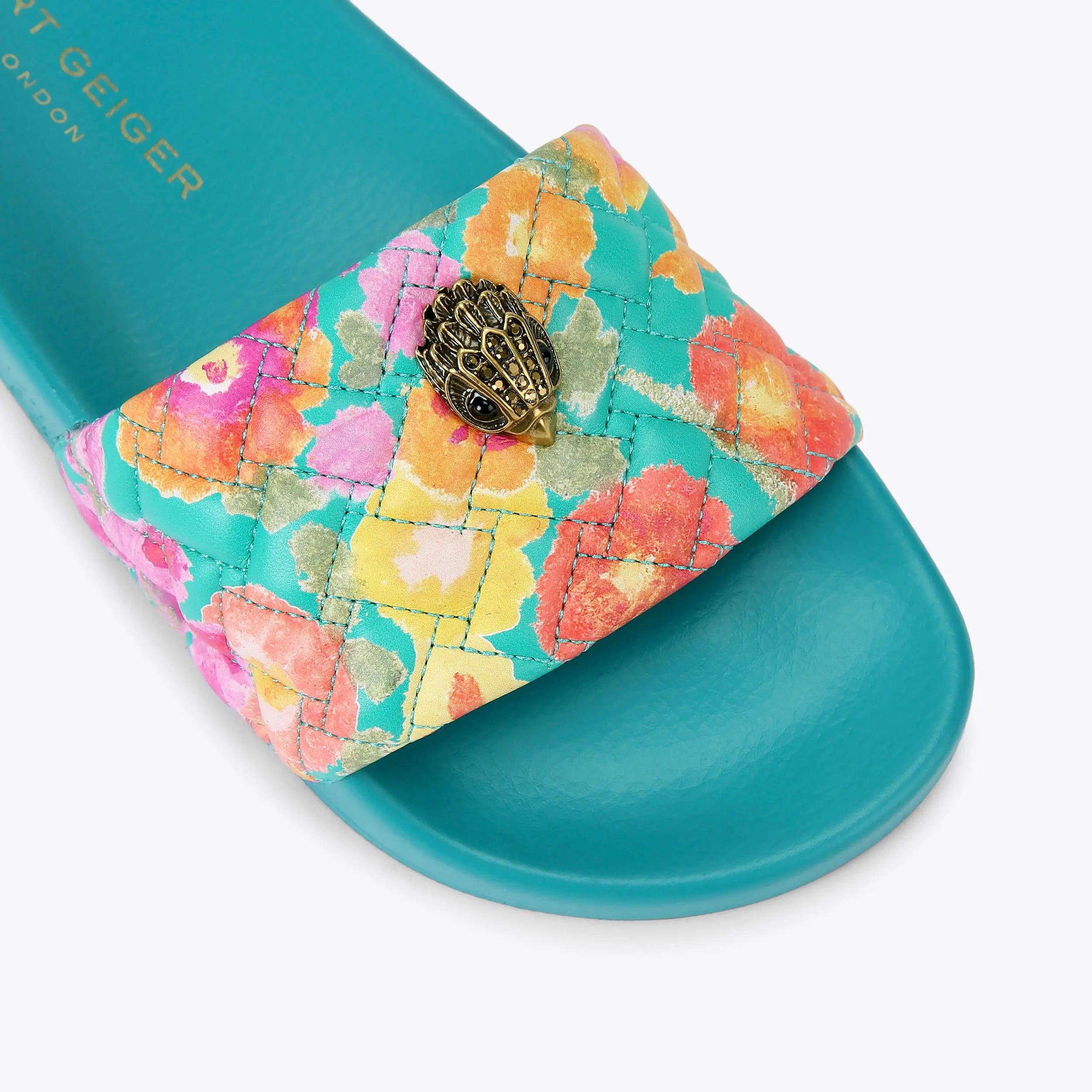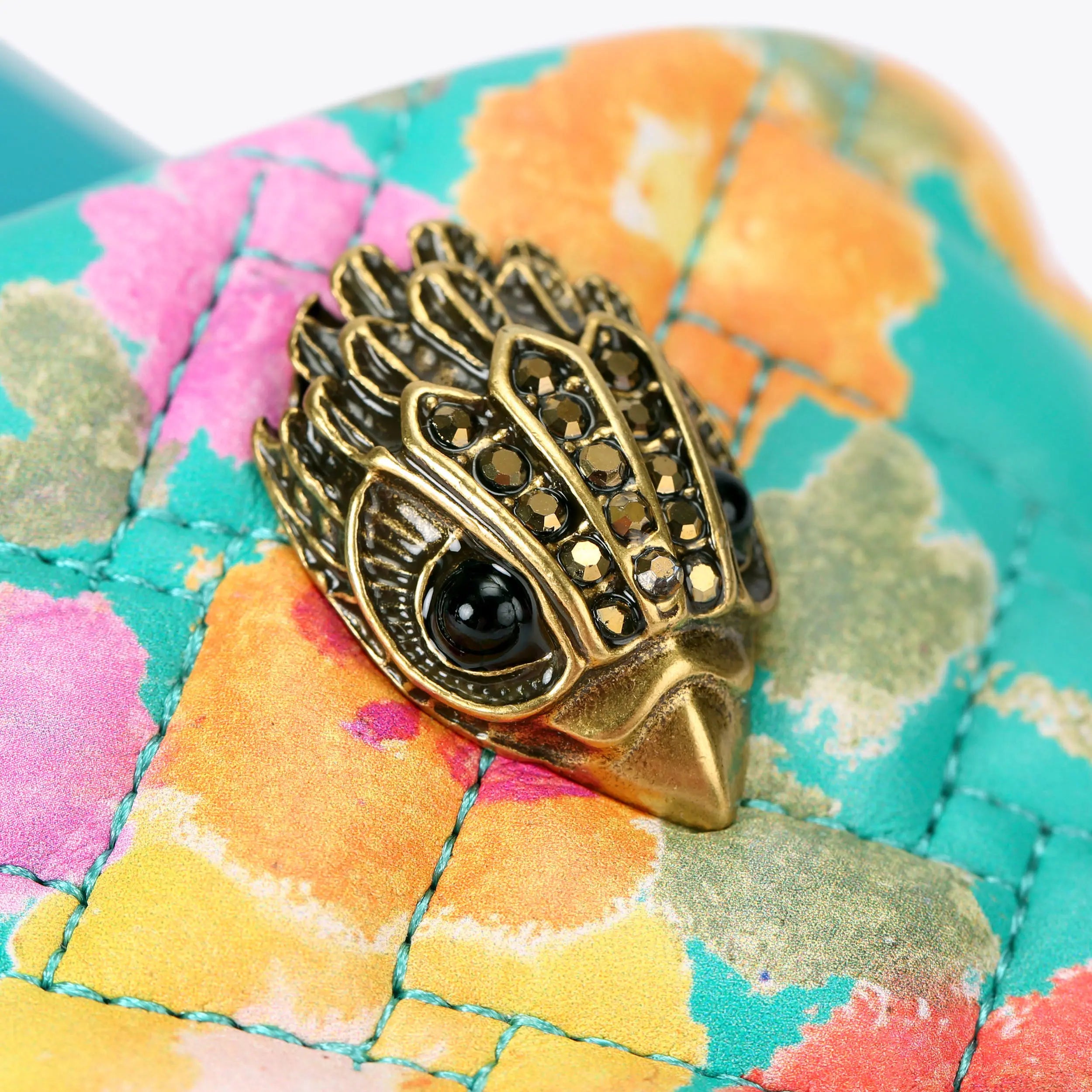 This Meena Eagle sandal slips onto the foot with a blue moulded footbed. The toe strap is designed in a blue floral printed leather with overstitch quilting. There is an antiqued brass eagle head sat on top.