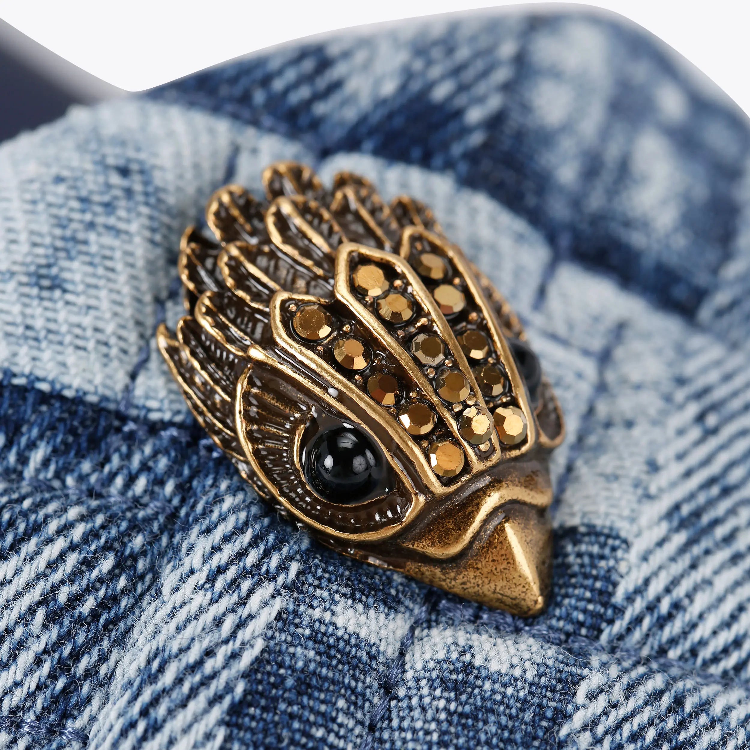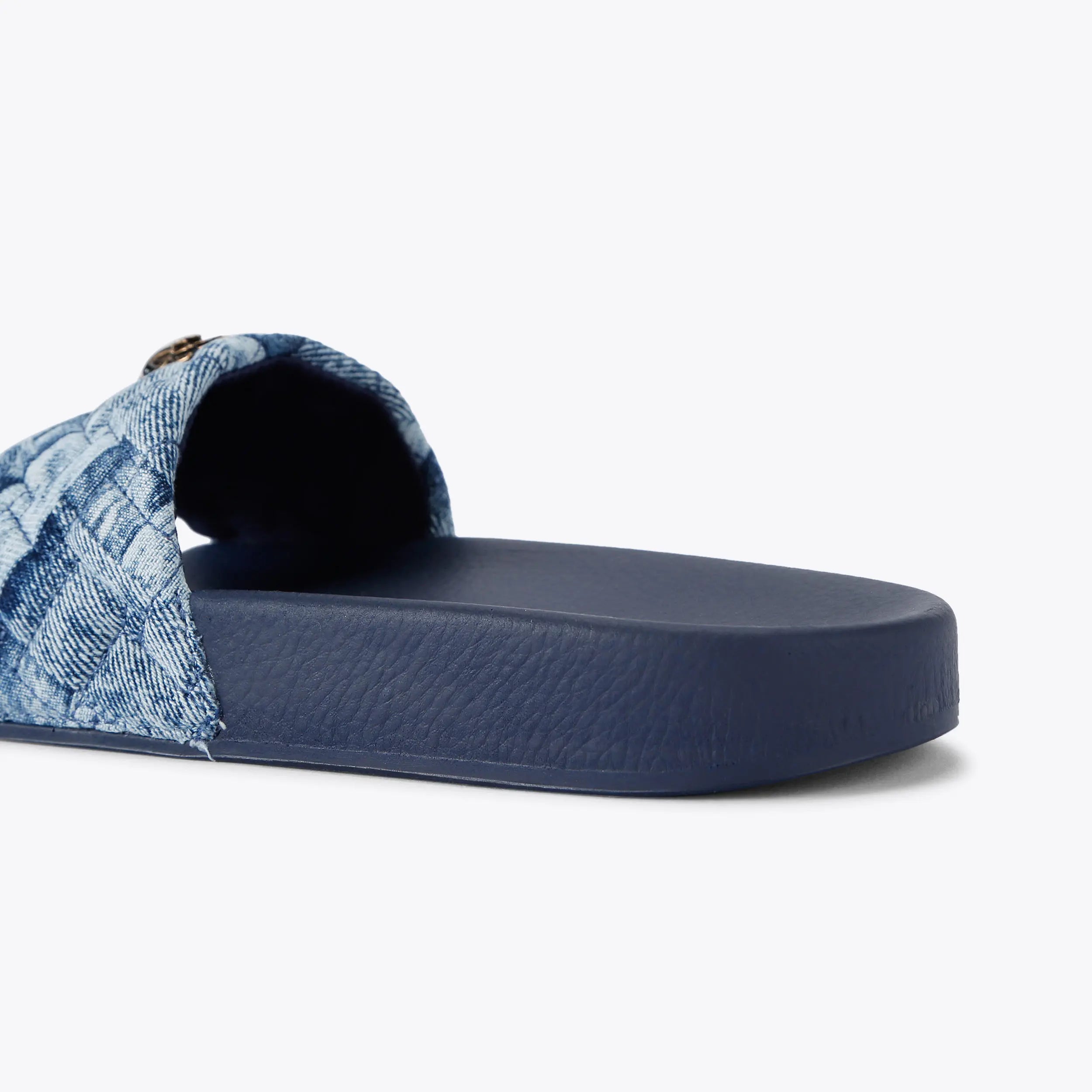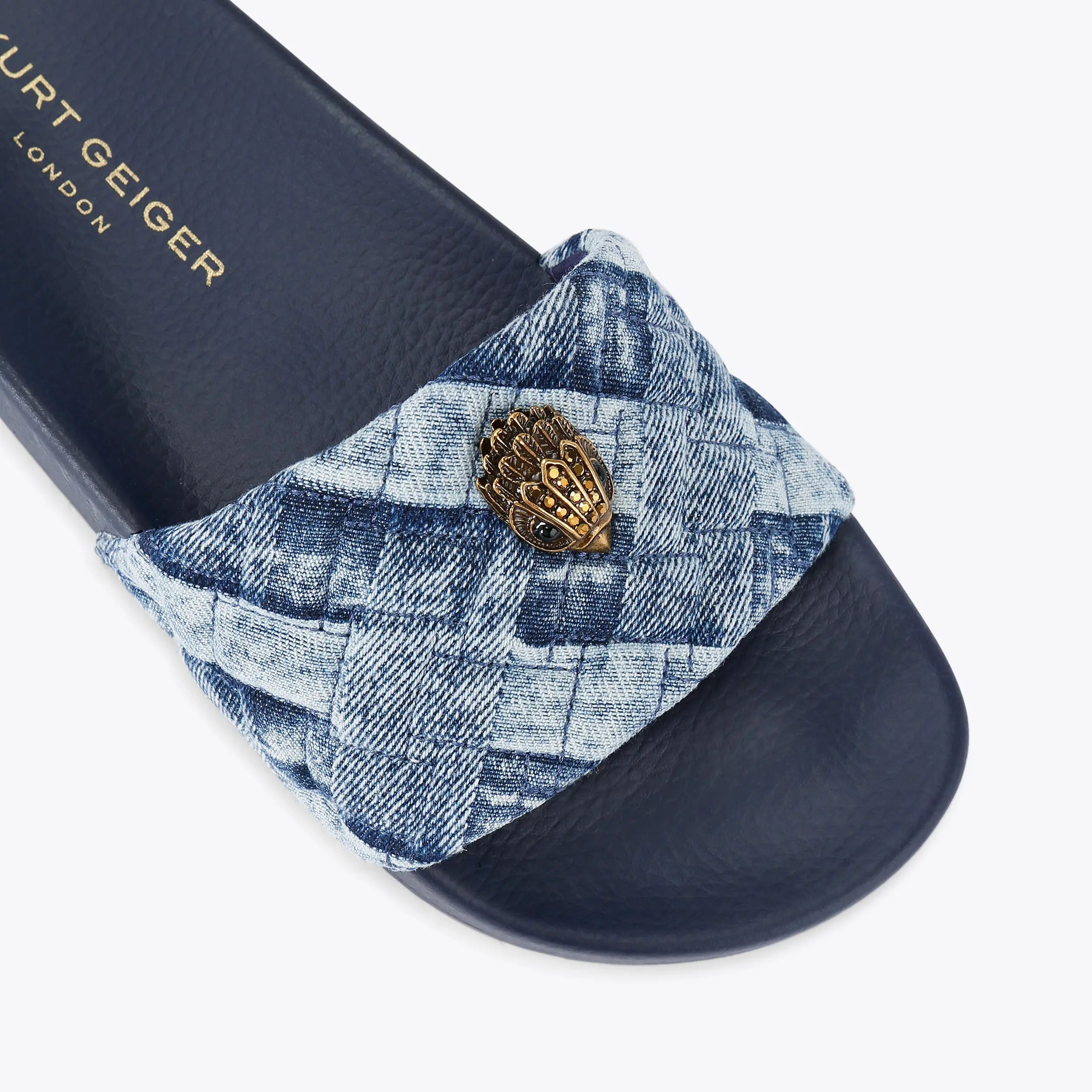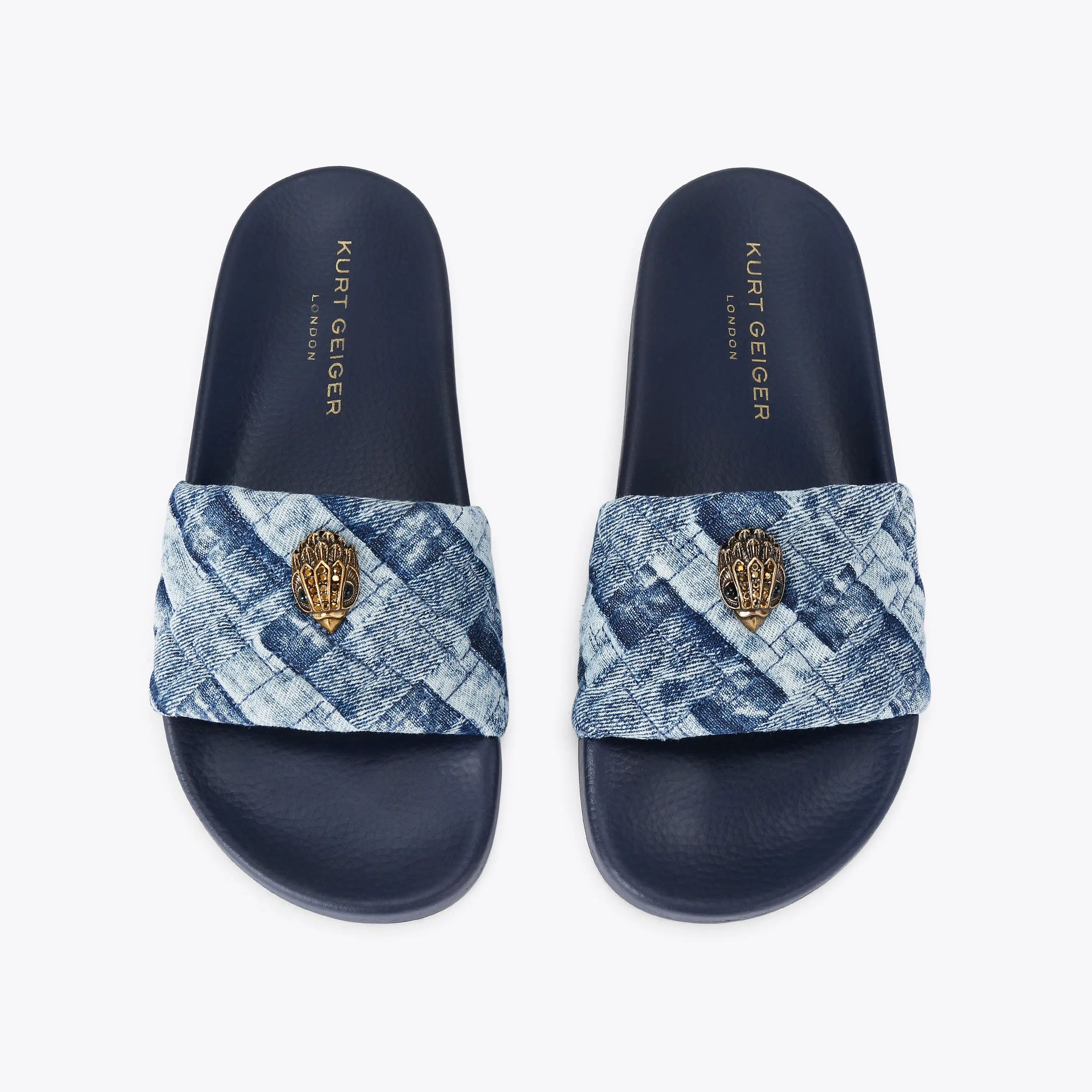 The Meena Eagle sandal arrives in a denim slide on style. The strap features a bleached weave effect and an antiqued brass eagle head on the top.