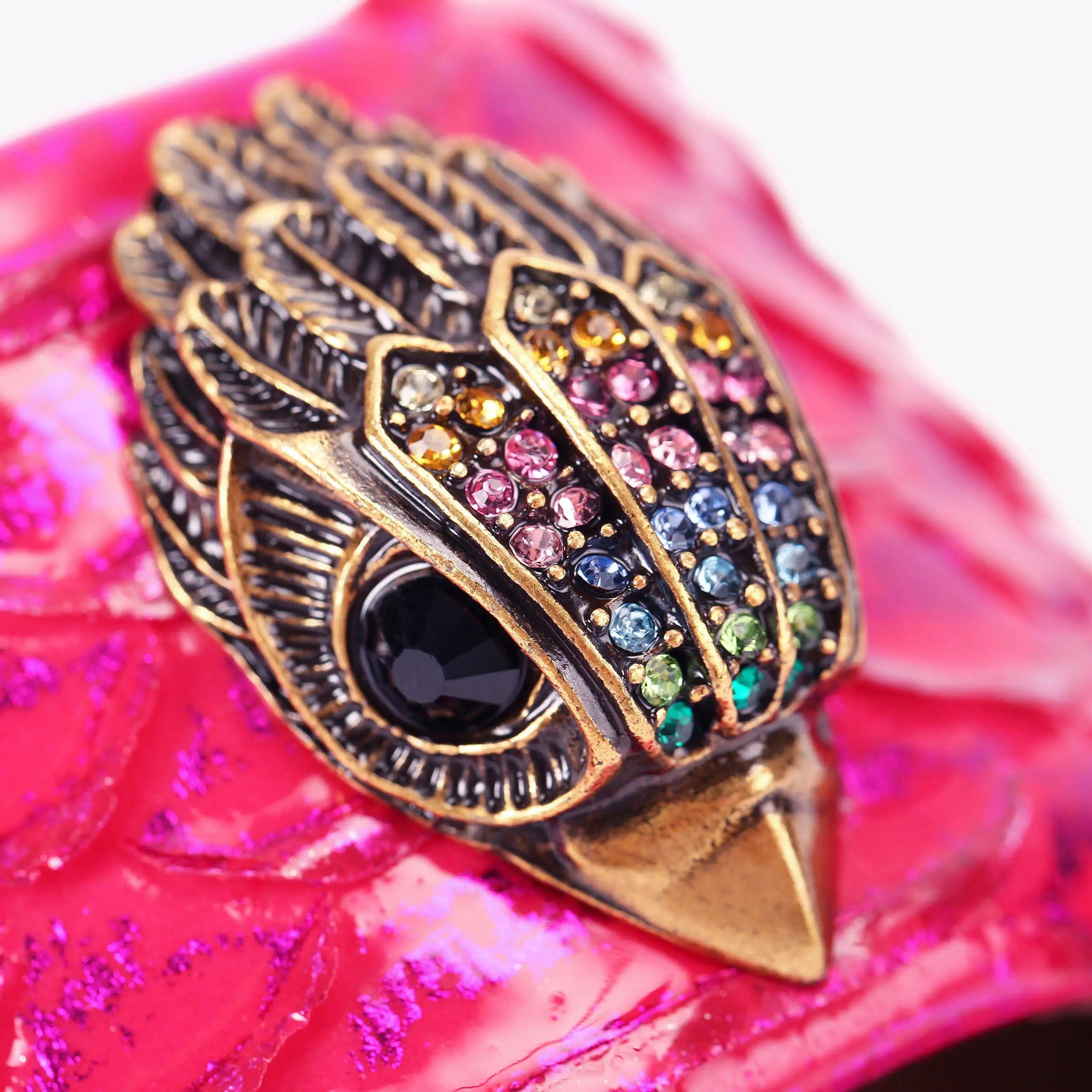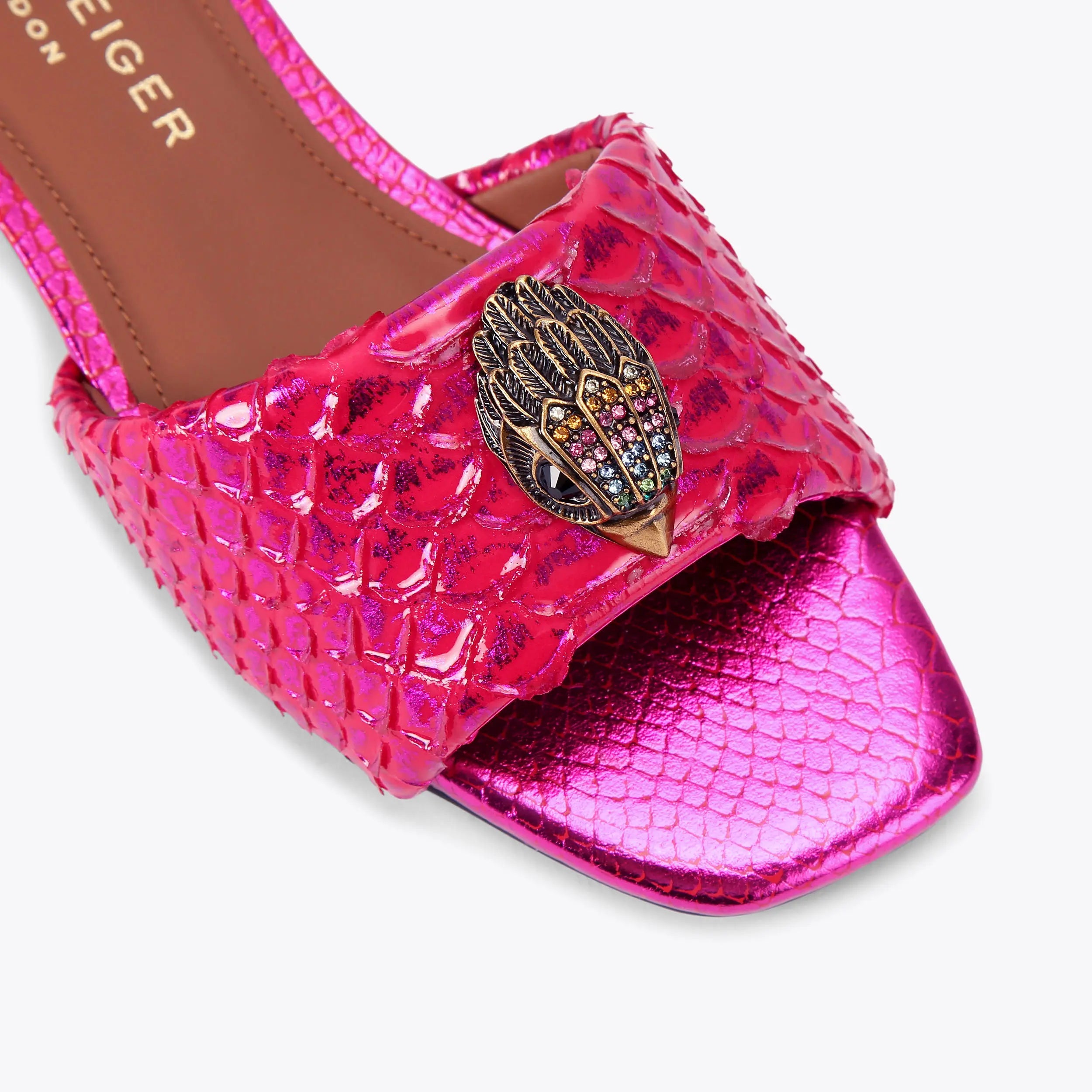 The Kensington Flat Sandal is crafted from a metallic fuchsia 3D embossed snake leather. There is an antiqued brass eagle head with rainbow crystals and stones on the strap.