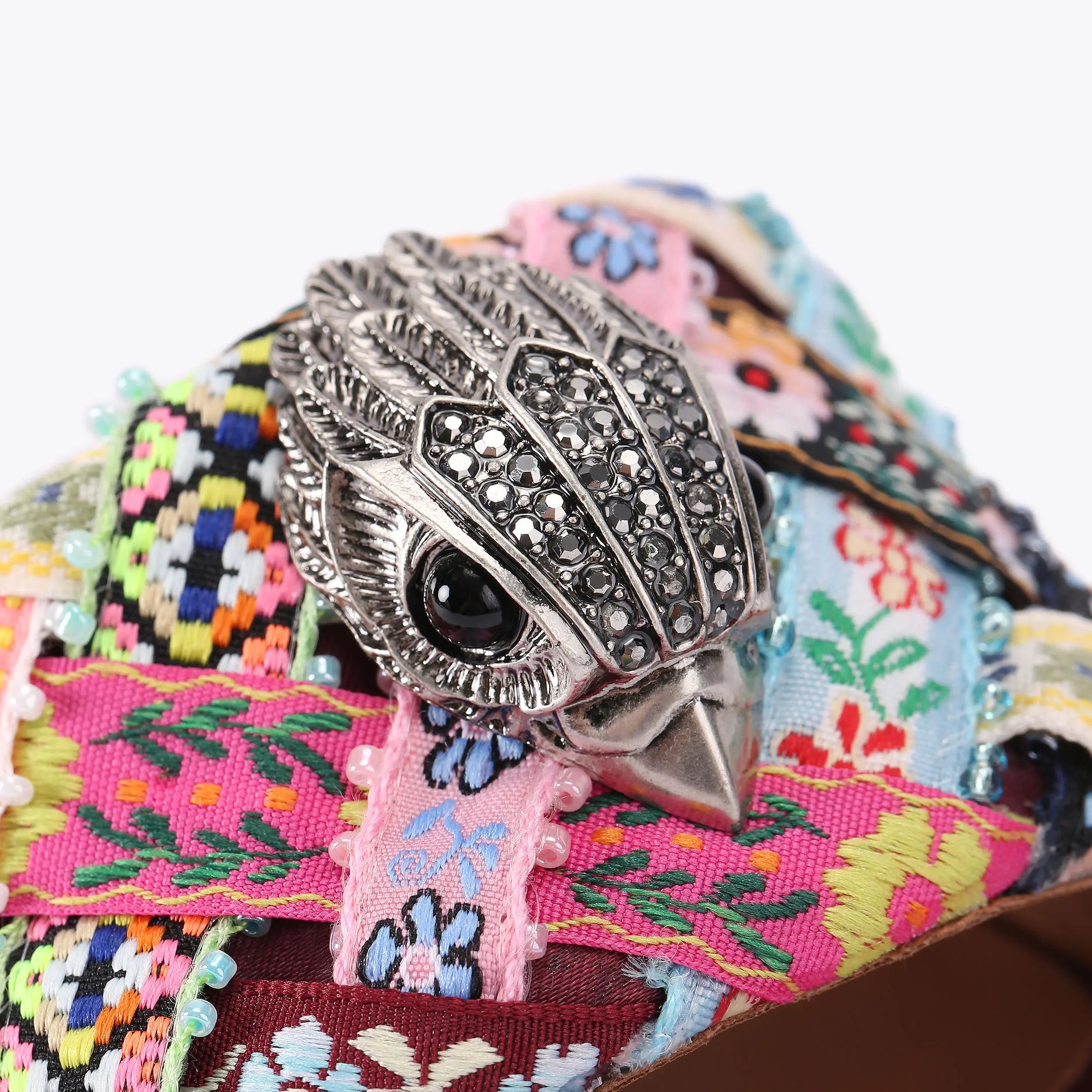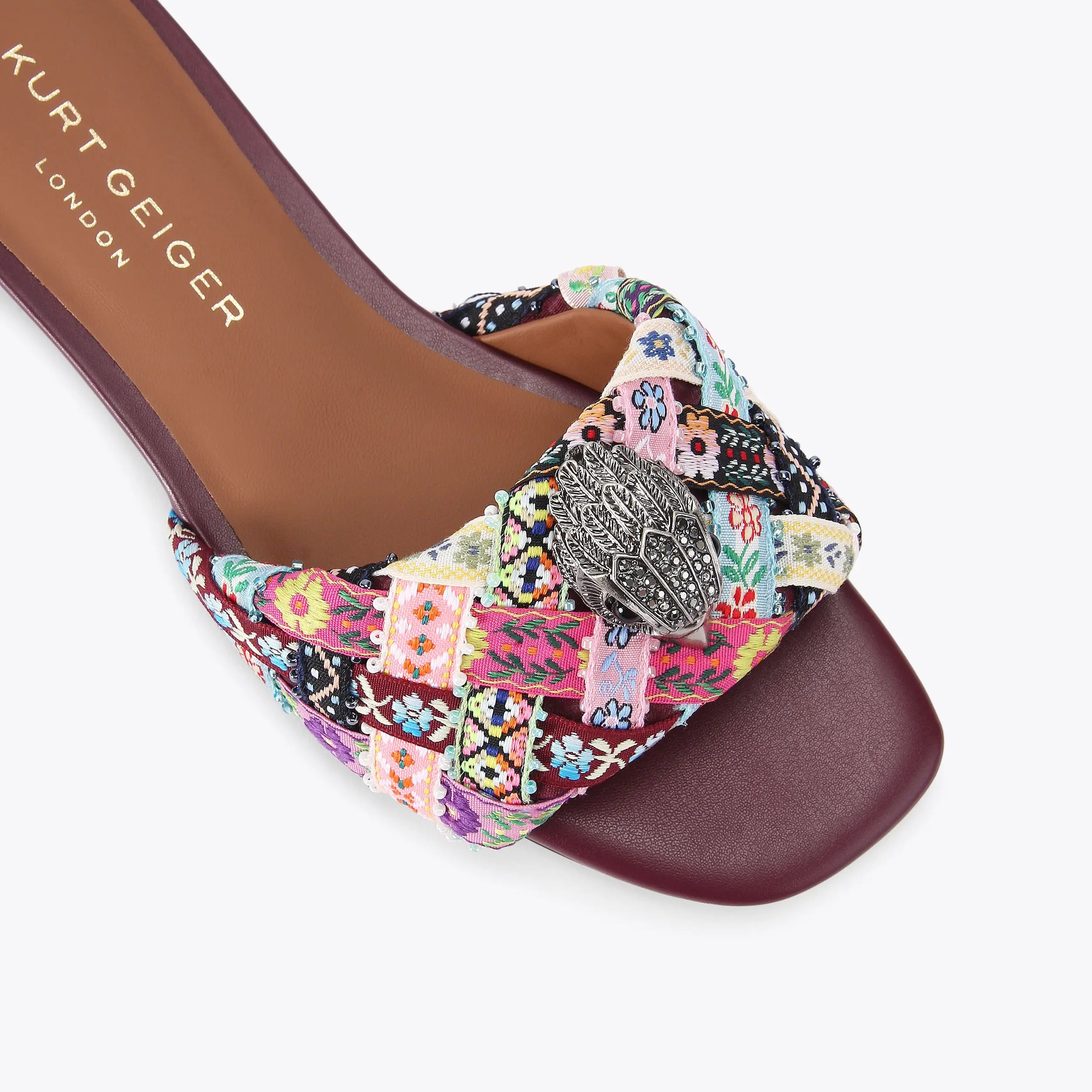 The Kensington Flat Sandal is crafted from multiple embroidered fabrics woven across each other. There is an antiqued silver eagle head sat on the strap and the footbed is in an eggplant shade.