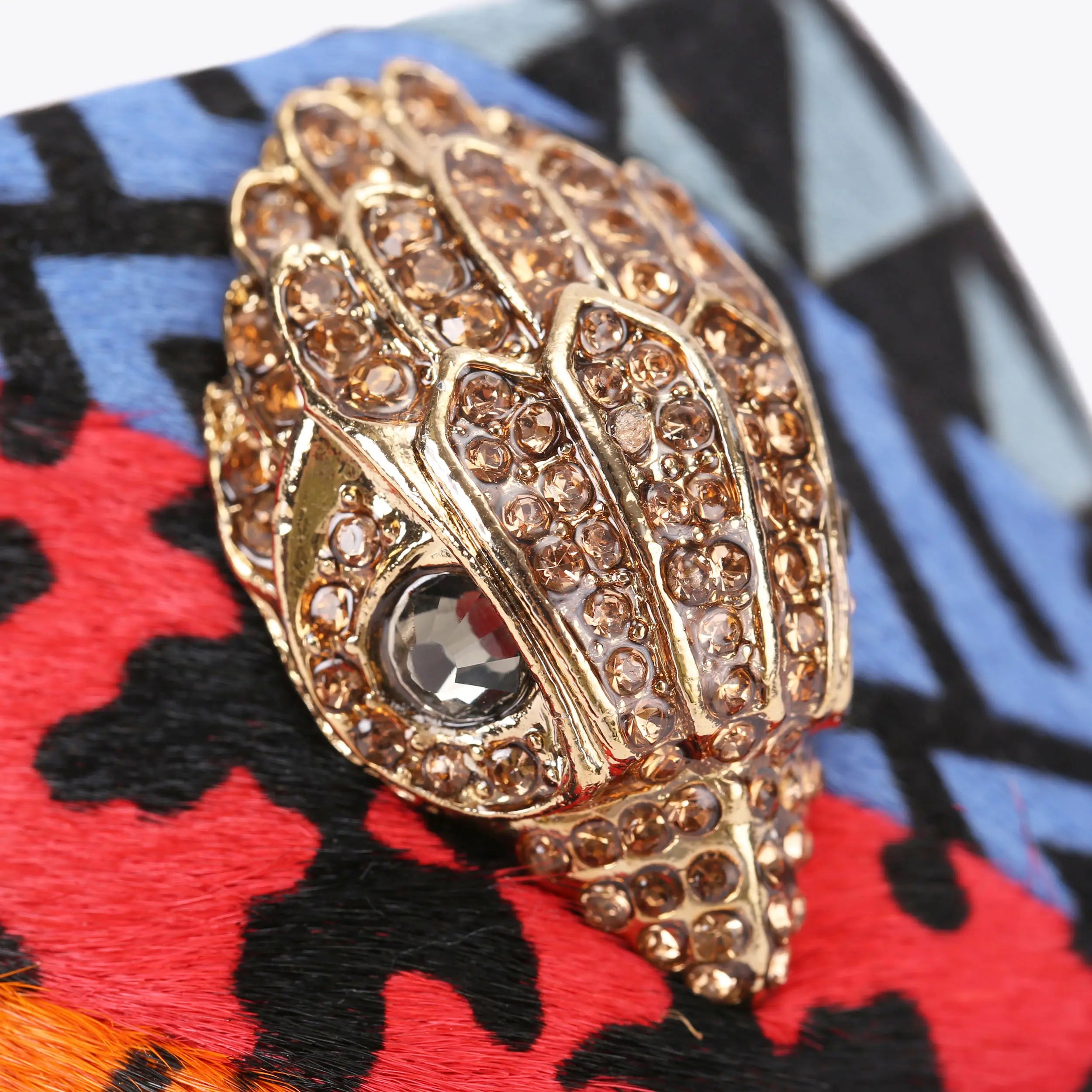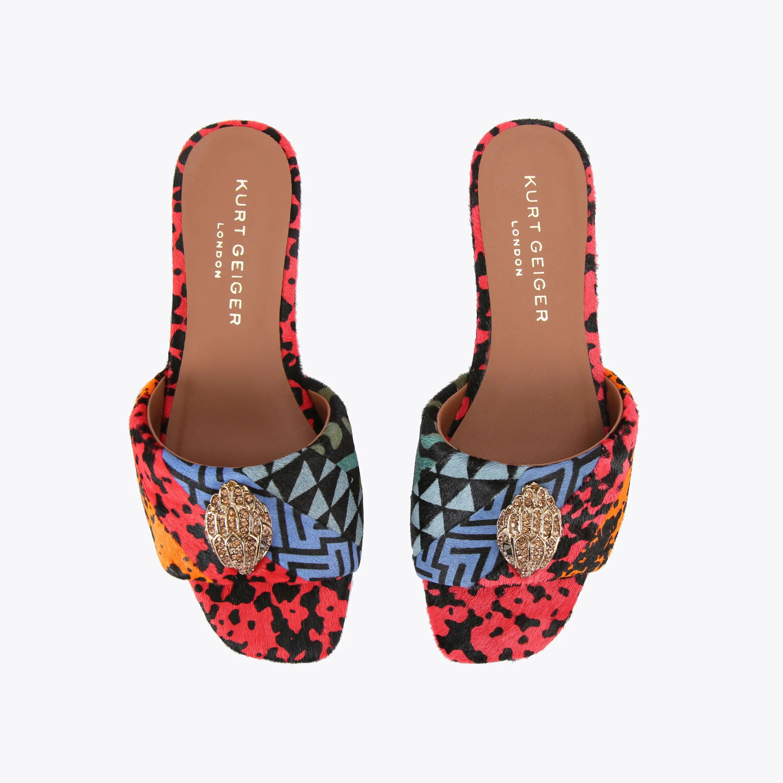 The Kensington Flat Sandal, an addition to the Kensington Collection, is crafted from a statement leather with different prints on each stripe. The gold eagle head features crystals and black eyes on the strap.