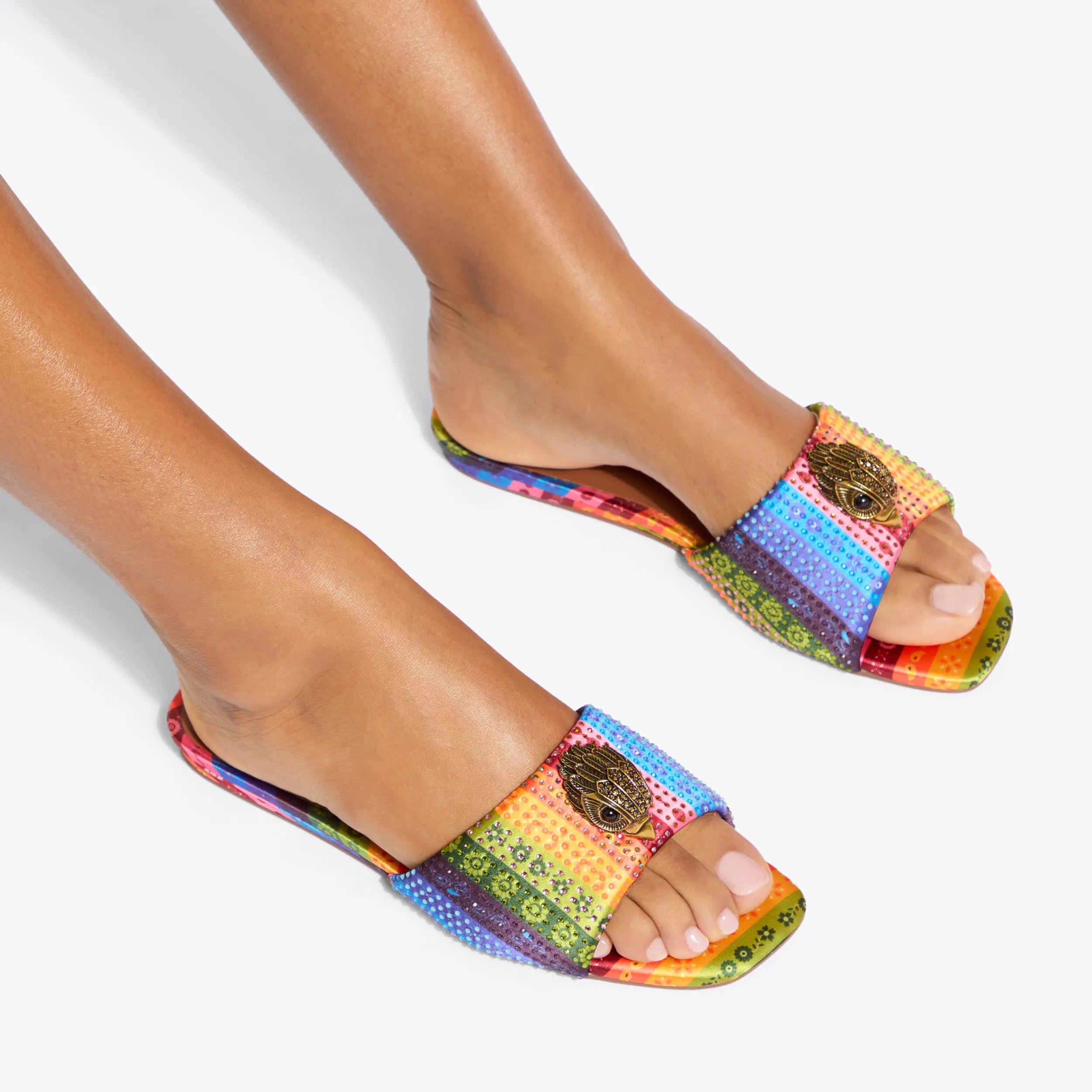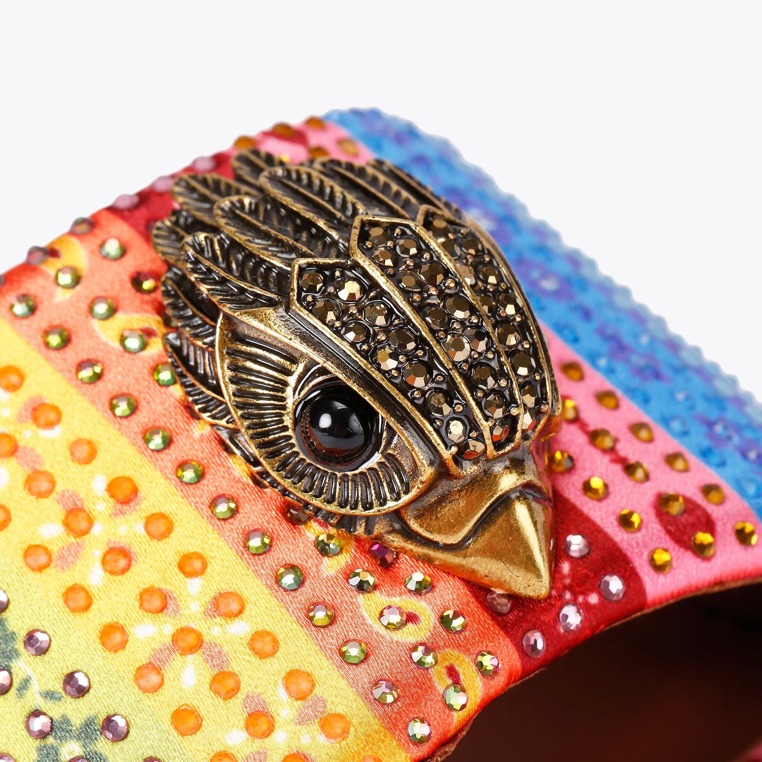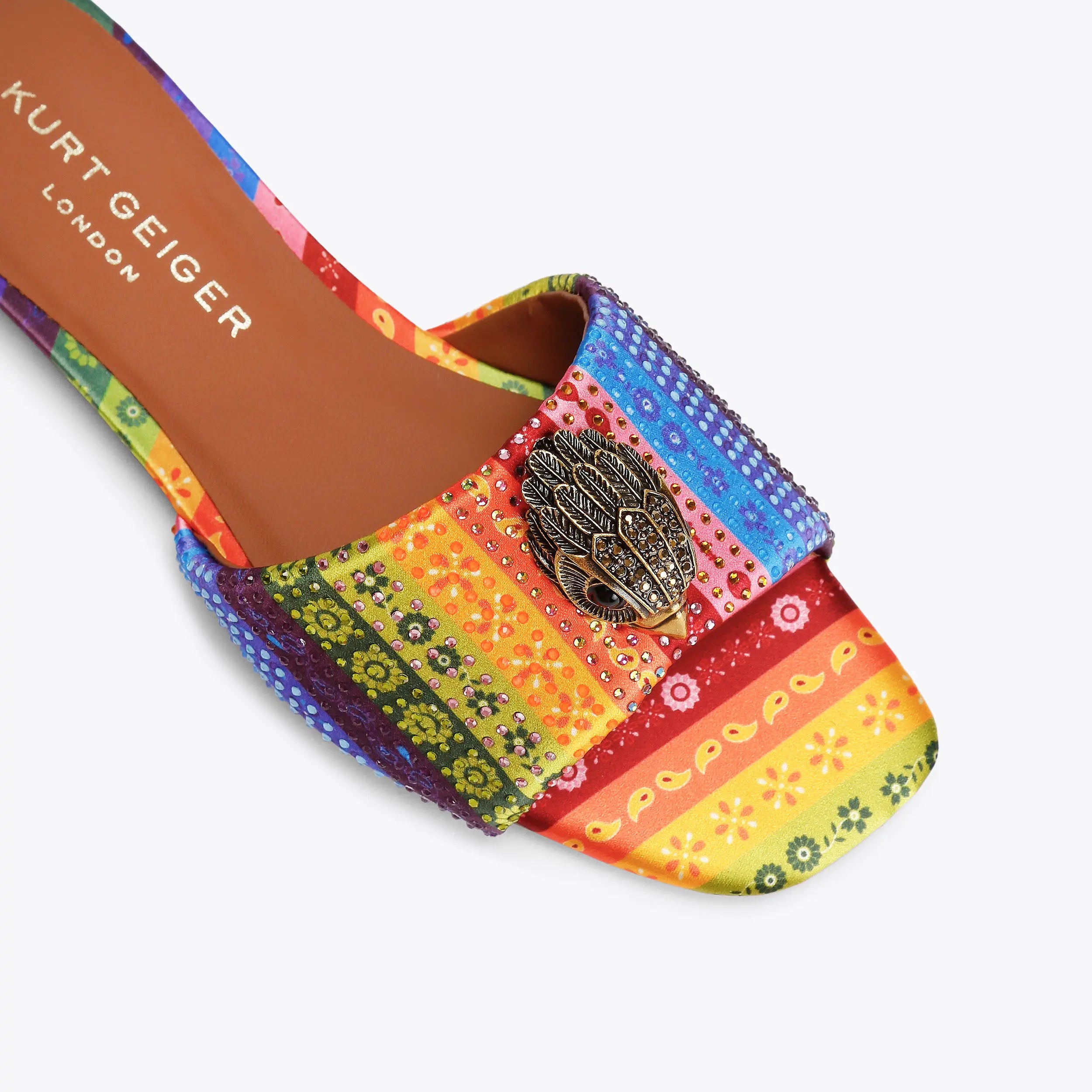 The Kensington Flat Sandal, an addition to the Kensington Collection, is crafted from a striped satin printed fabric with different motifs across the foot strap. The antiqued brass eagle head features crystals and crystal eyes on the strap.