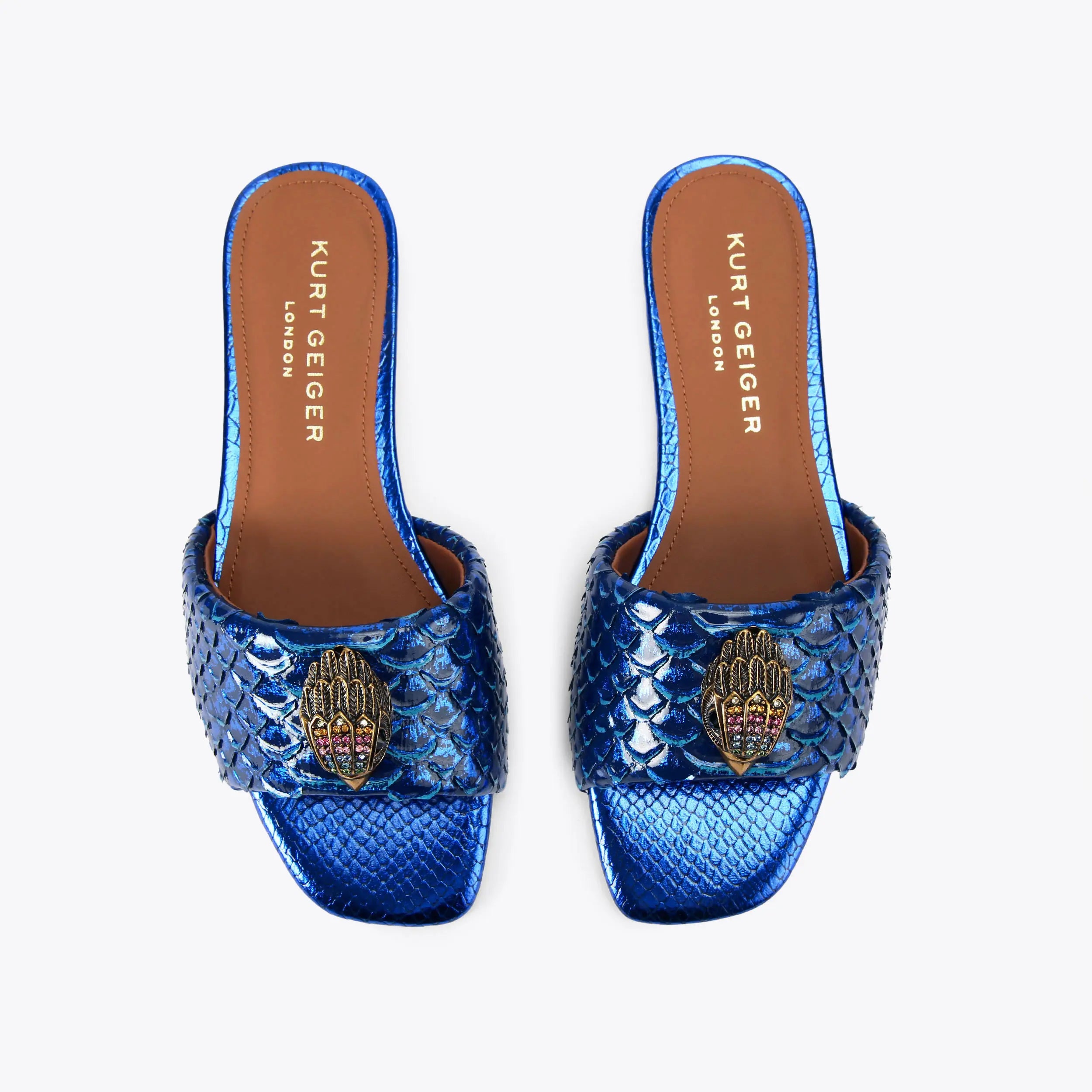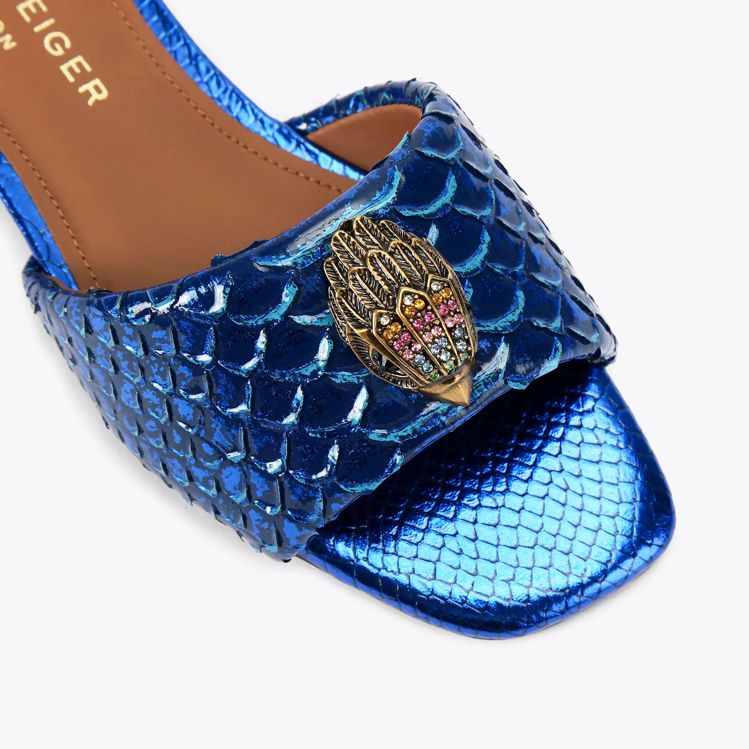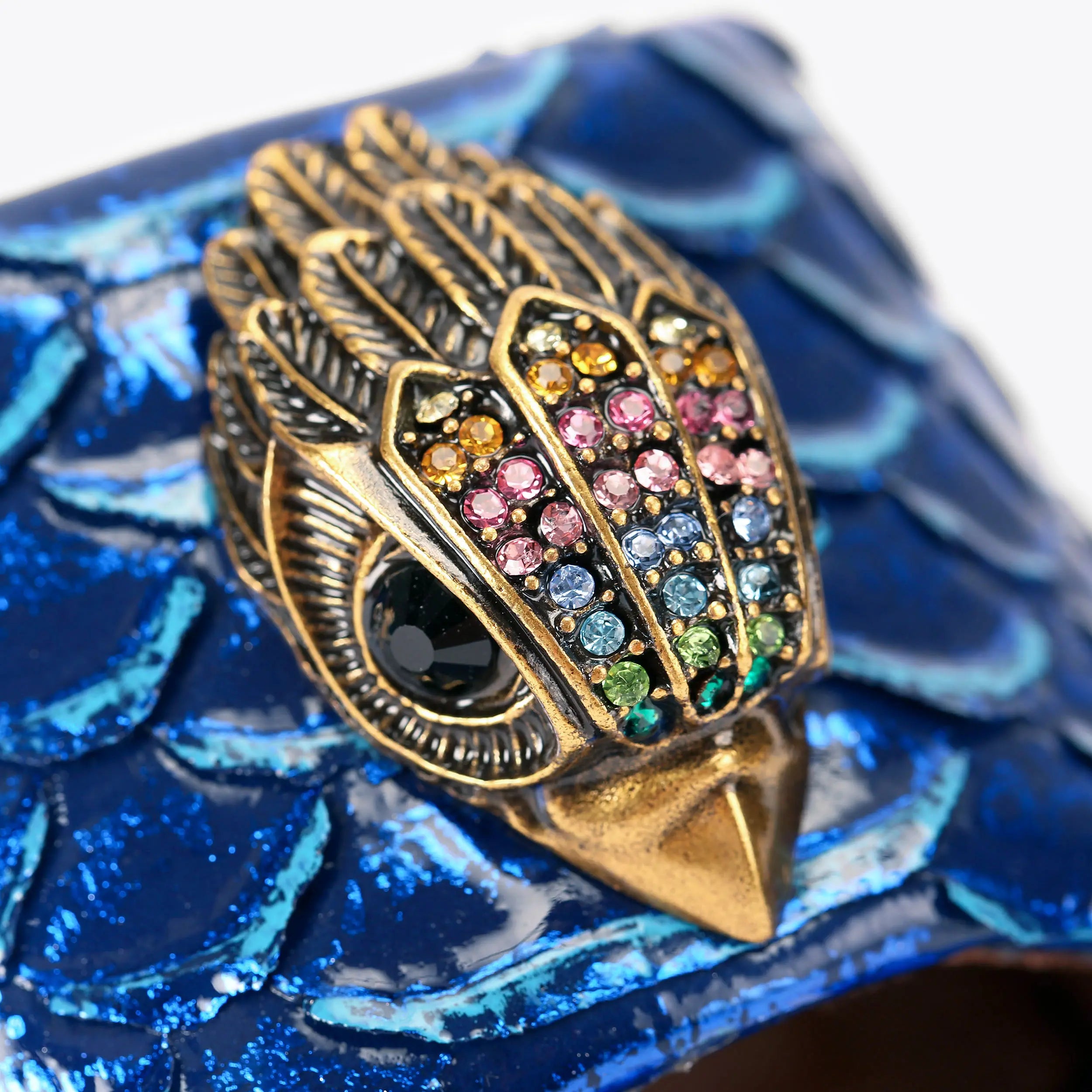 The Kensington Flat Sandal, an addition to the Kensington Collection, is crafted from a 3D snake embellished metallic blue leather. The antiqued brass eagle head features rainbow crystals and crystal eyes on the strap.