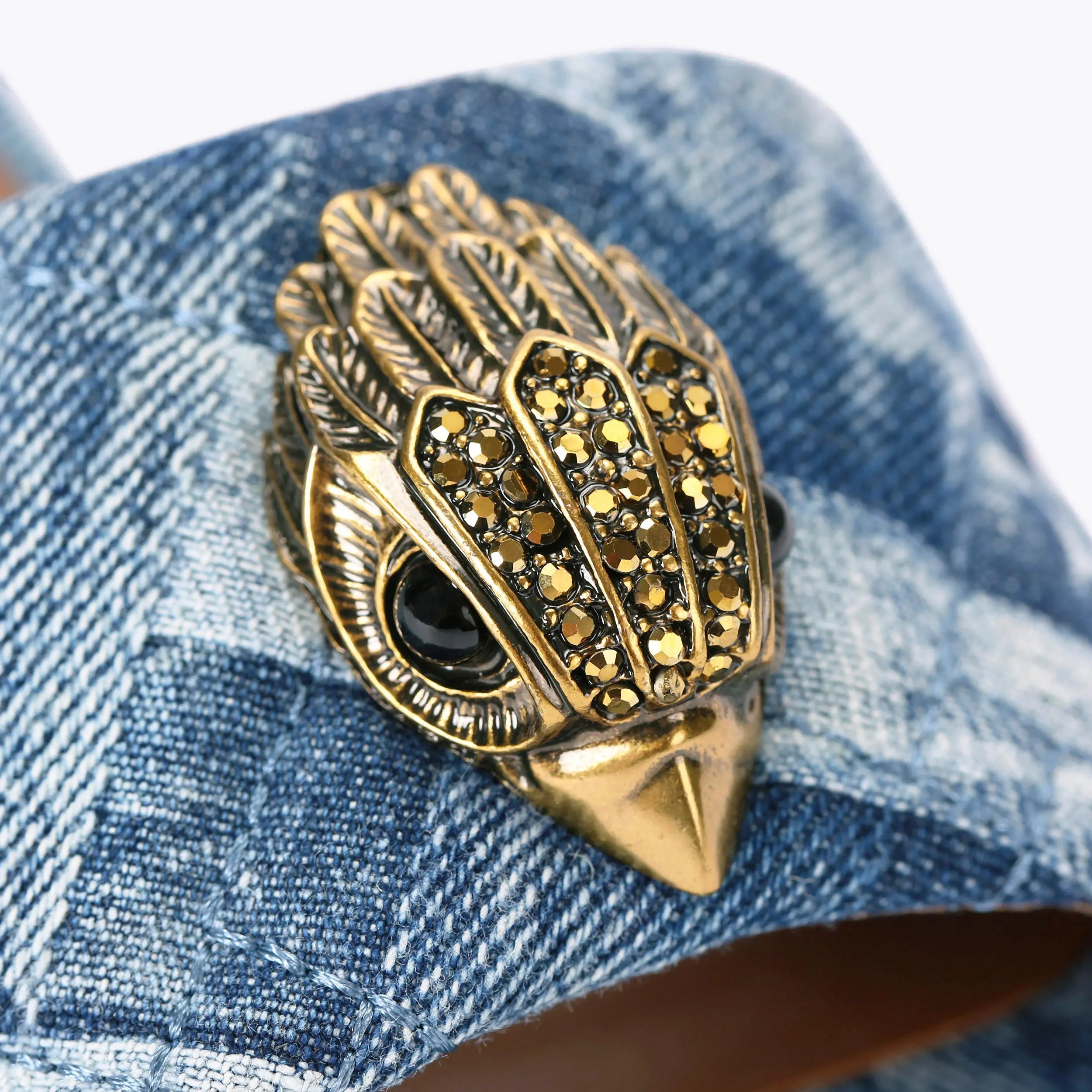 The Kensington Flat Sandal, an addition to the Kensington Collection, is crafted from denim with an acid wash weave effect. The antique brass eagle head features crystals and black bead eyes on the strap.