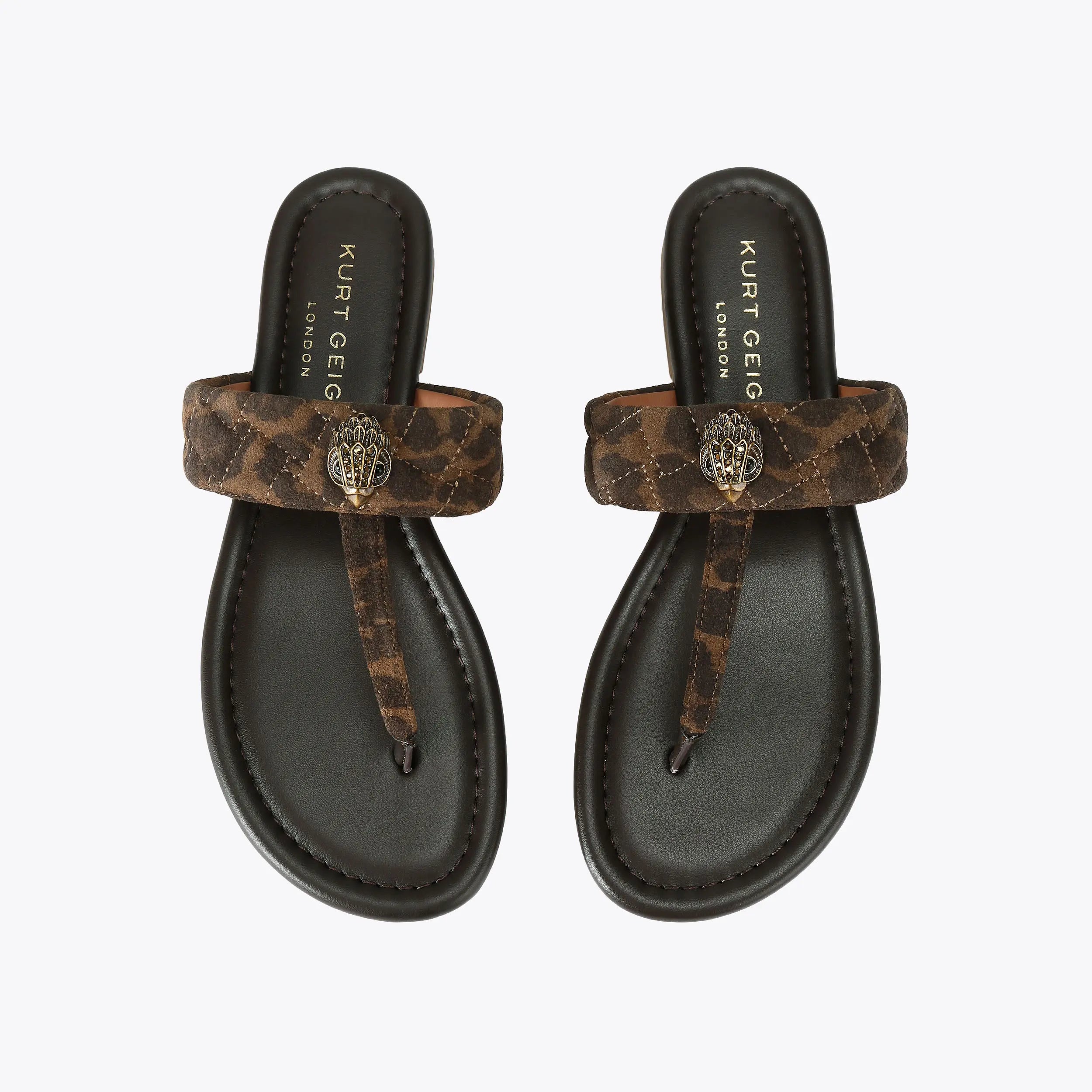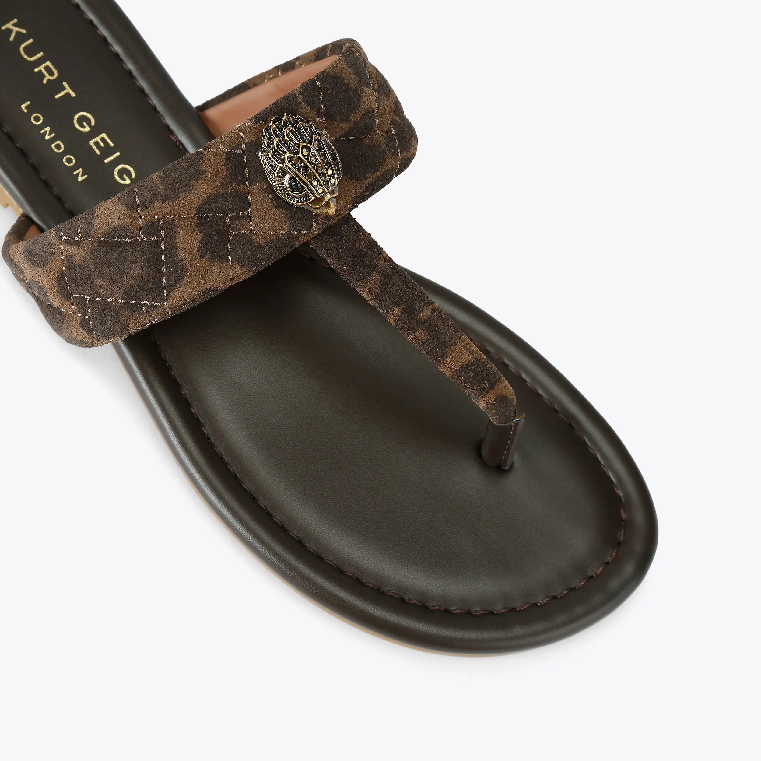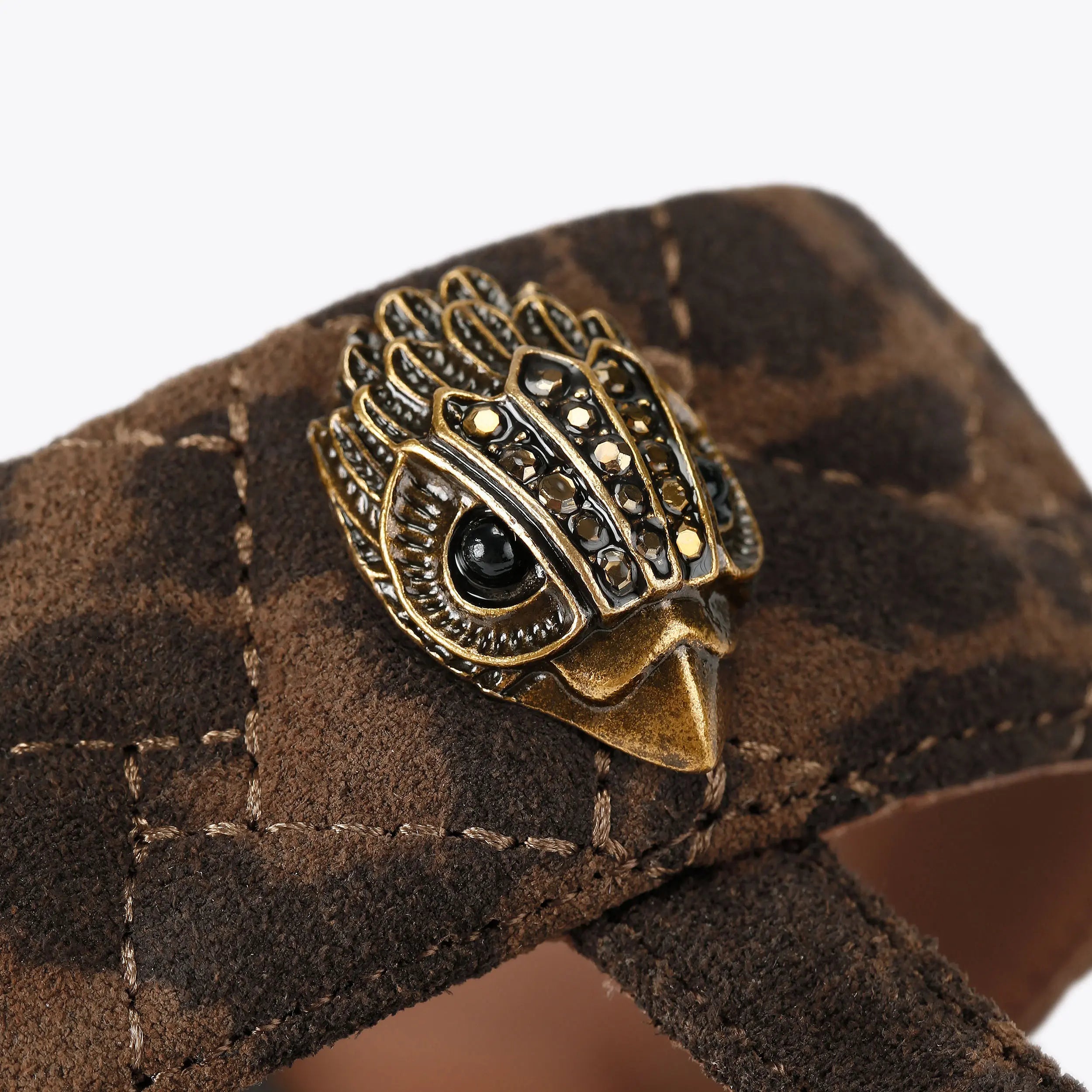 This Kurt Geiger Kensington T-Bar Sandal, an addition to the iconic Kensington collection, features a toe post strap which is crafted from a leopard print suede leather. The antiqued brass eagle head sits on the strap.