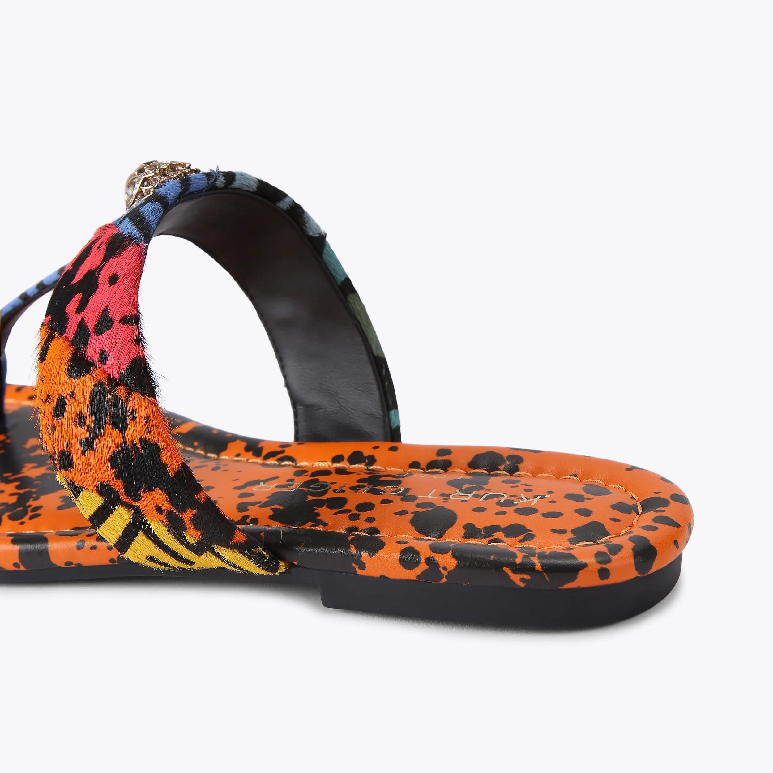This Kensington T-Bar Sandal, features a toe post strap which is crafted from a striped multi-colour printed calf hair. There is a gold eagle head sat on the top of the strap.