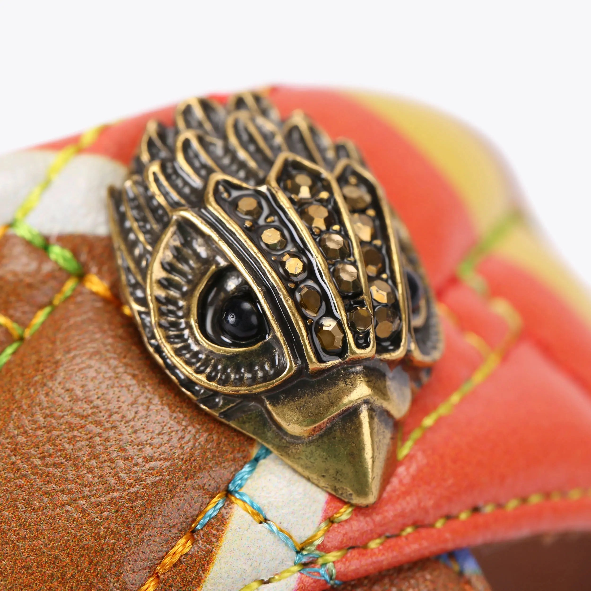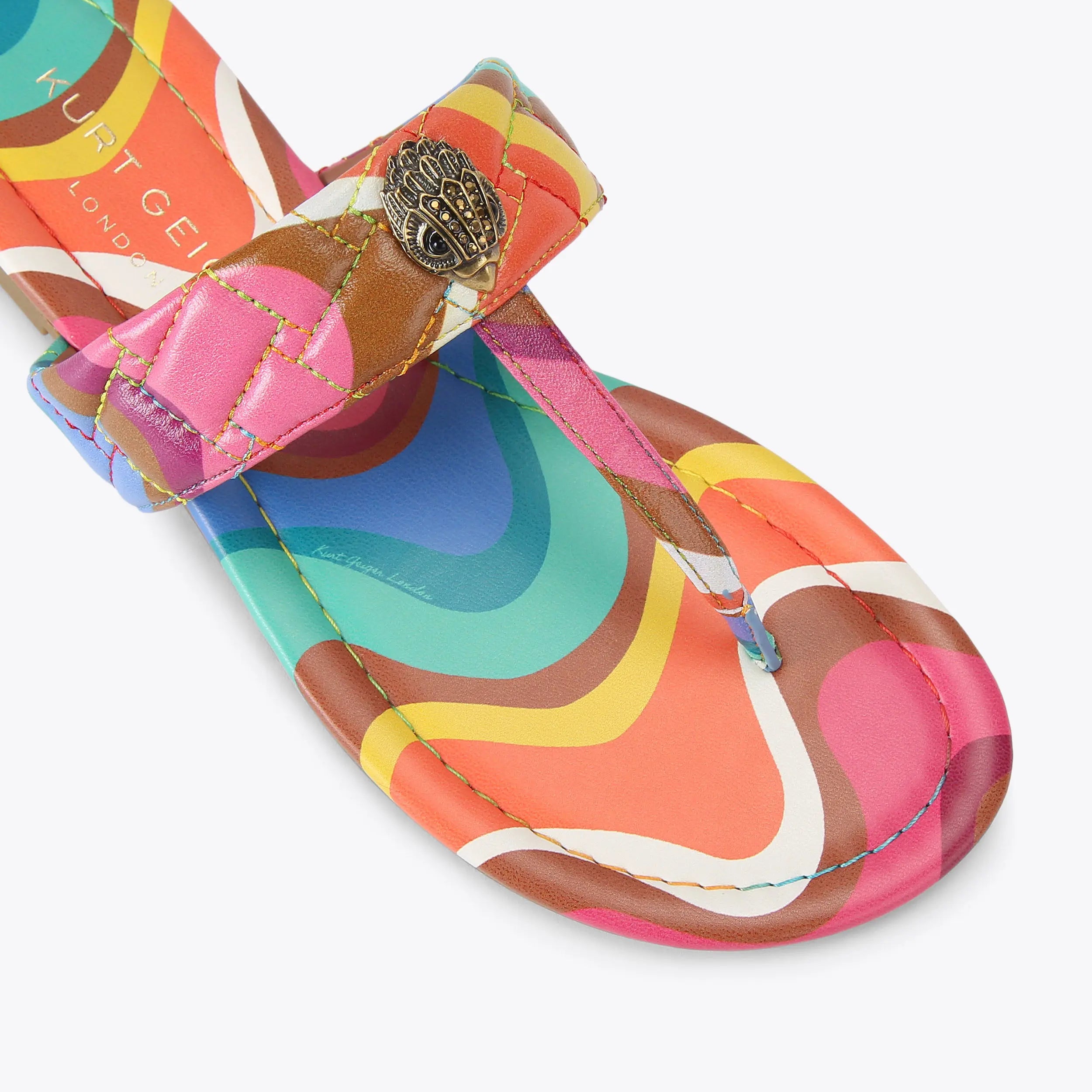 This Kensington T-Bar Sandal, features a toe post strap which is crafted from a soft leather in a dark floral print. There is a black eagle head with crystals sat on the top of the strap.
